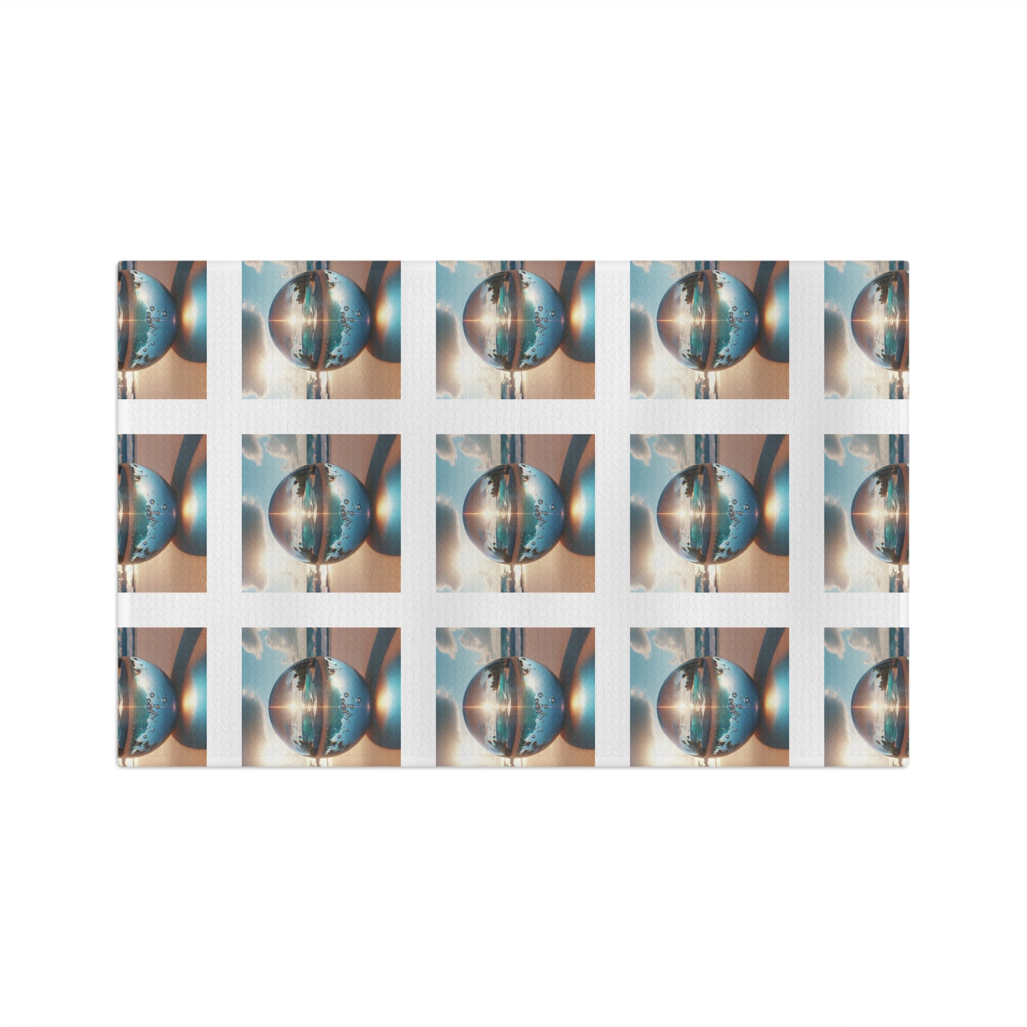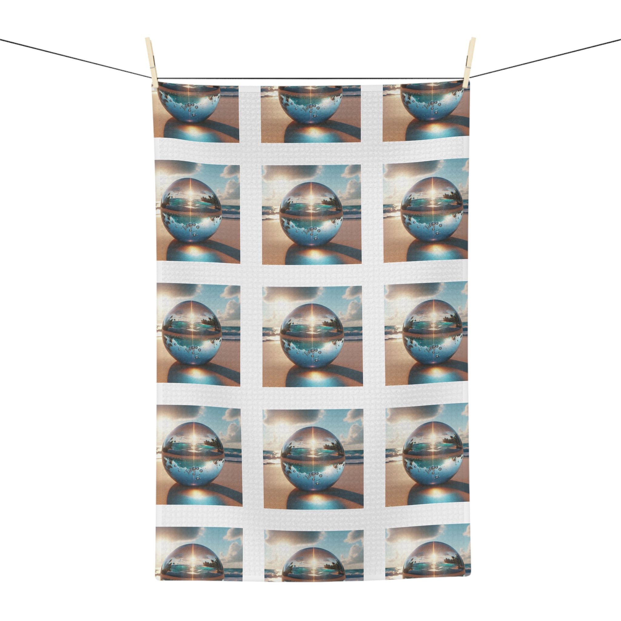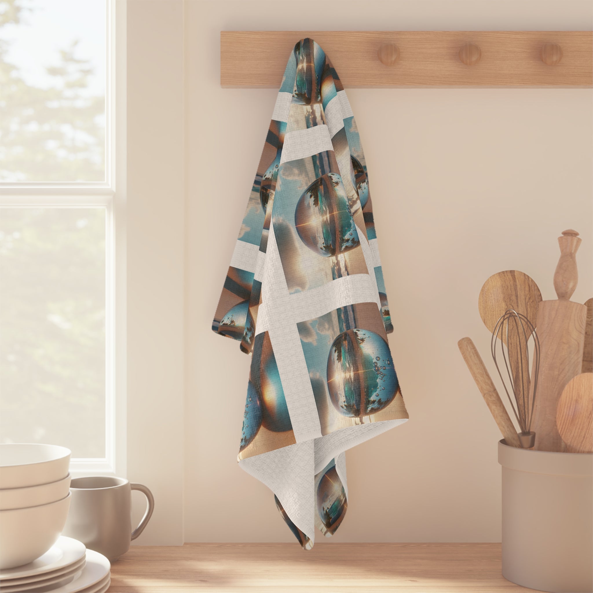 A luminous kitchen linen that brings a slice of seaside calm to everyday chores. This microfiber tea towel features a repeating photographic grid of a clear crystal ball capturing images of a sandy shore and soft blue sky. It dries quickly, resists lint, and keeps its printed detail after regular use. Lightweight and neatly hemmed, it layers easily in a coastal-styled kitchen or travel-ready picnic kit, adding a quiet, artful touch whenever you reach for it.