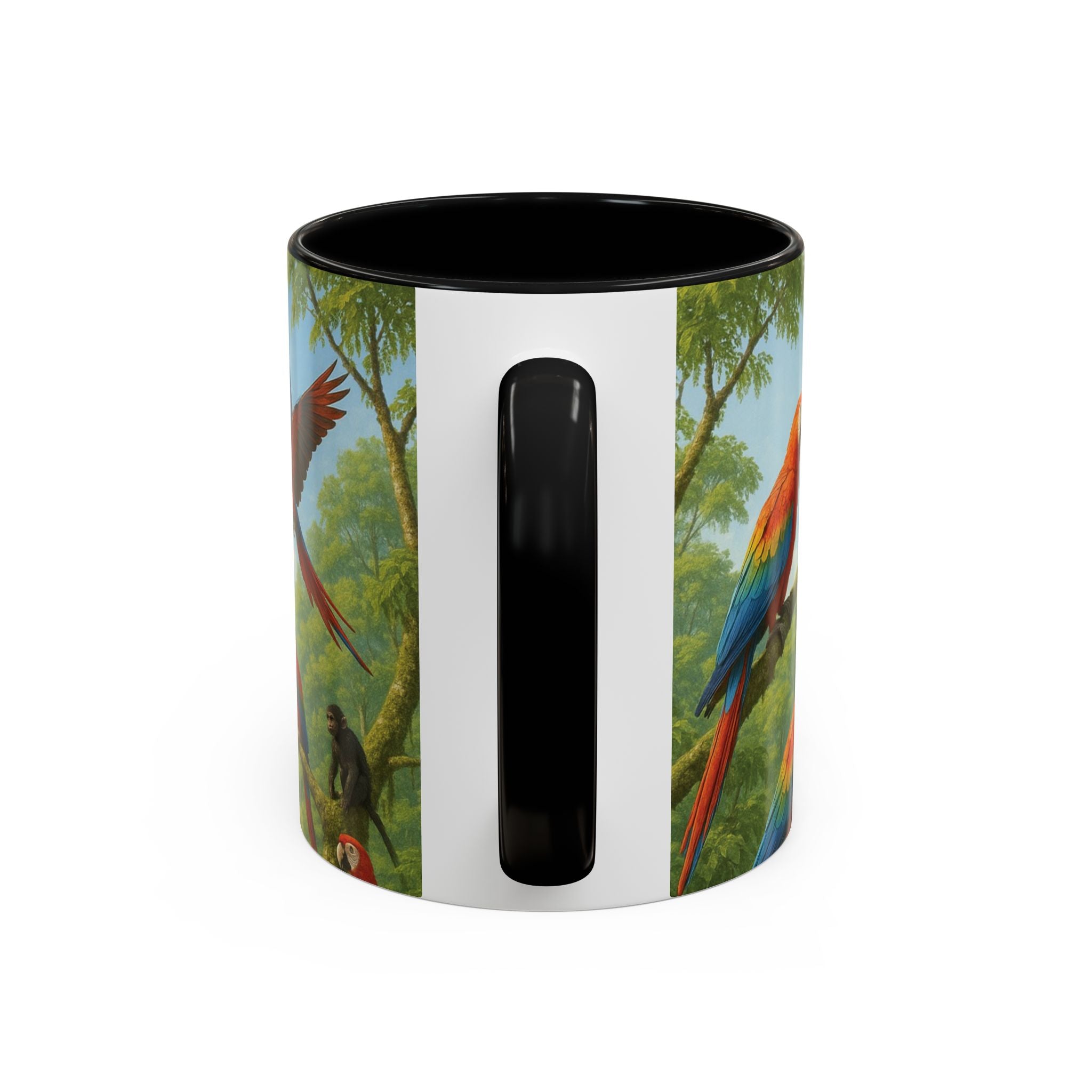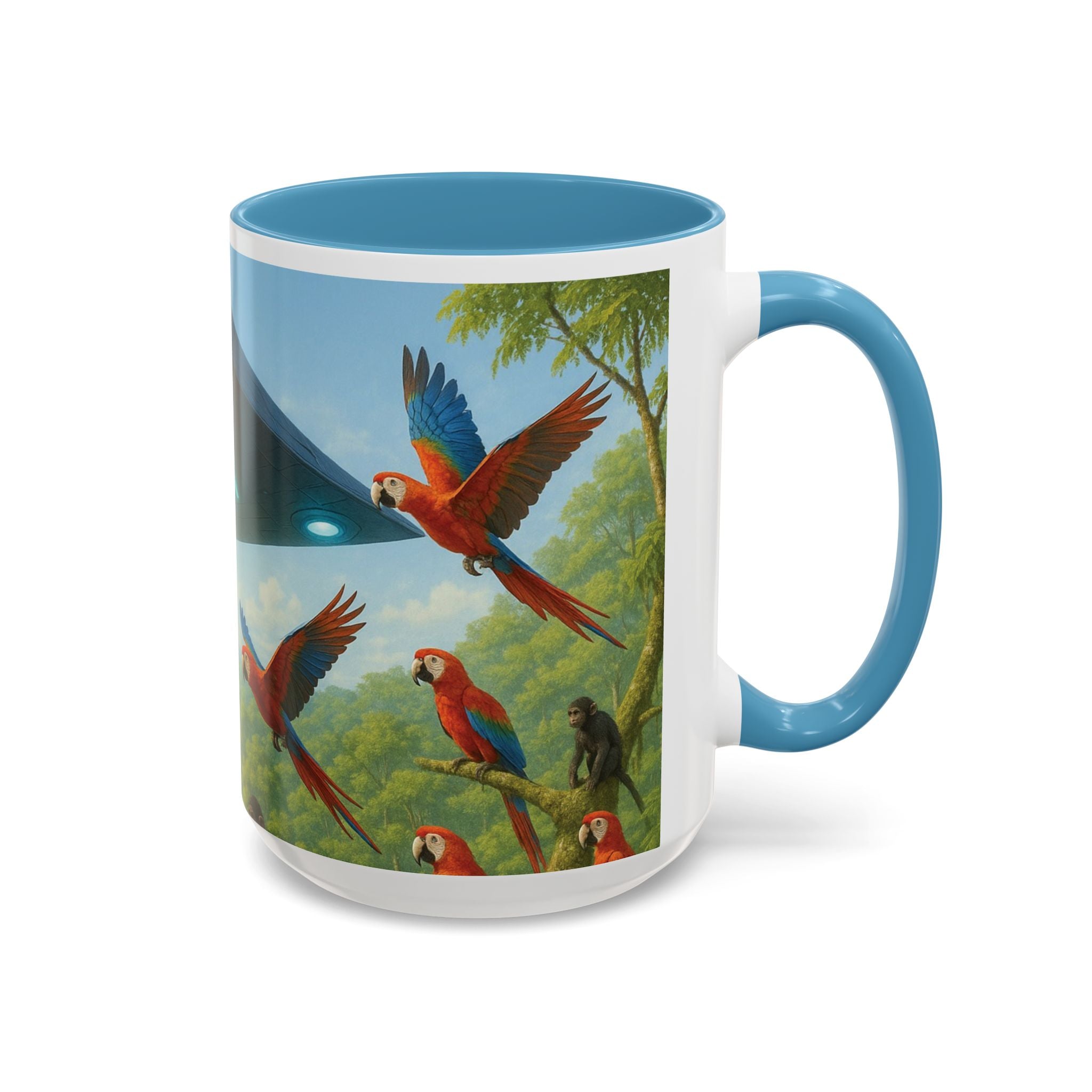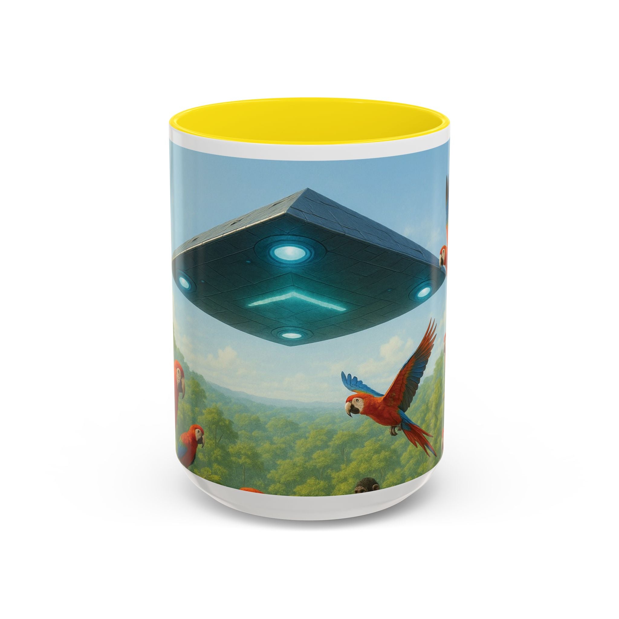 Meet your next favorite morning companion, the accented ceramic mug. This mug brings the perfect blend of style and functionality to elevate your coffee or tea ritual. Features our exclusive UFO and Macaws design giving off tropical mystery vibes.