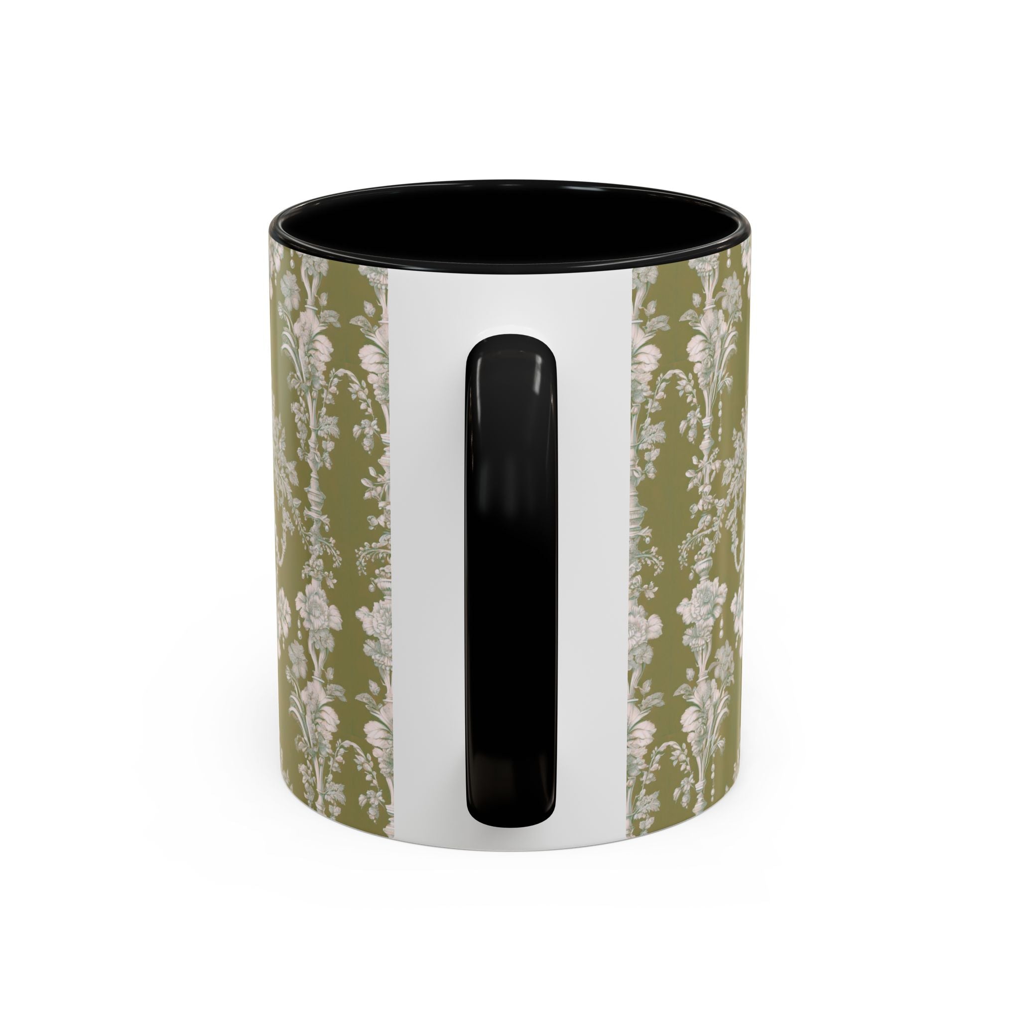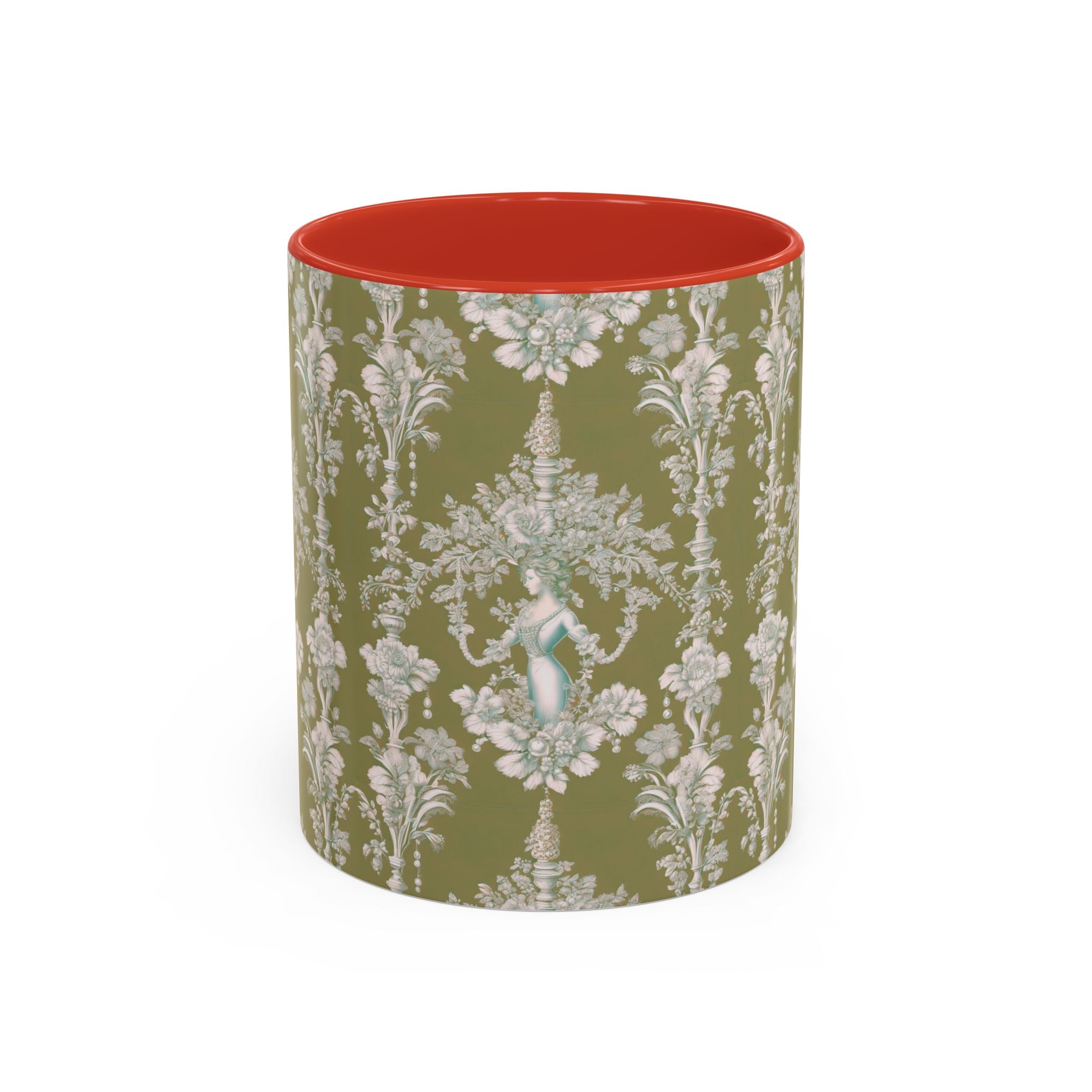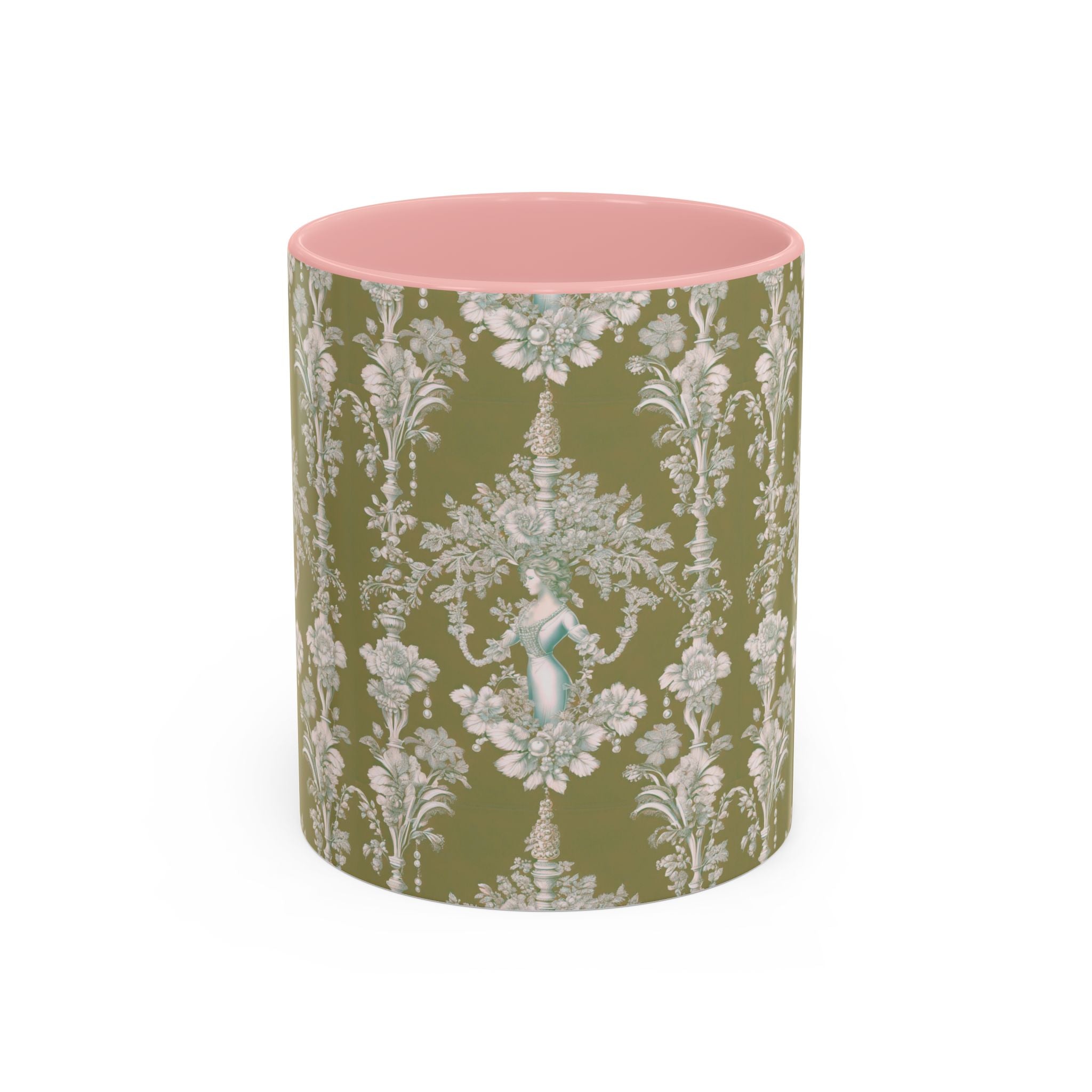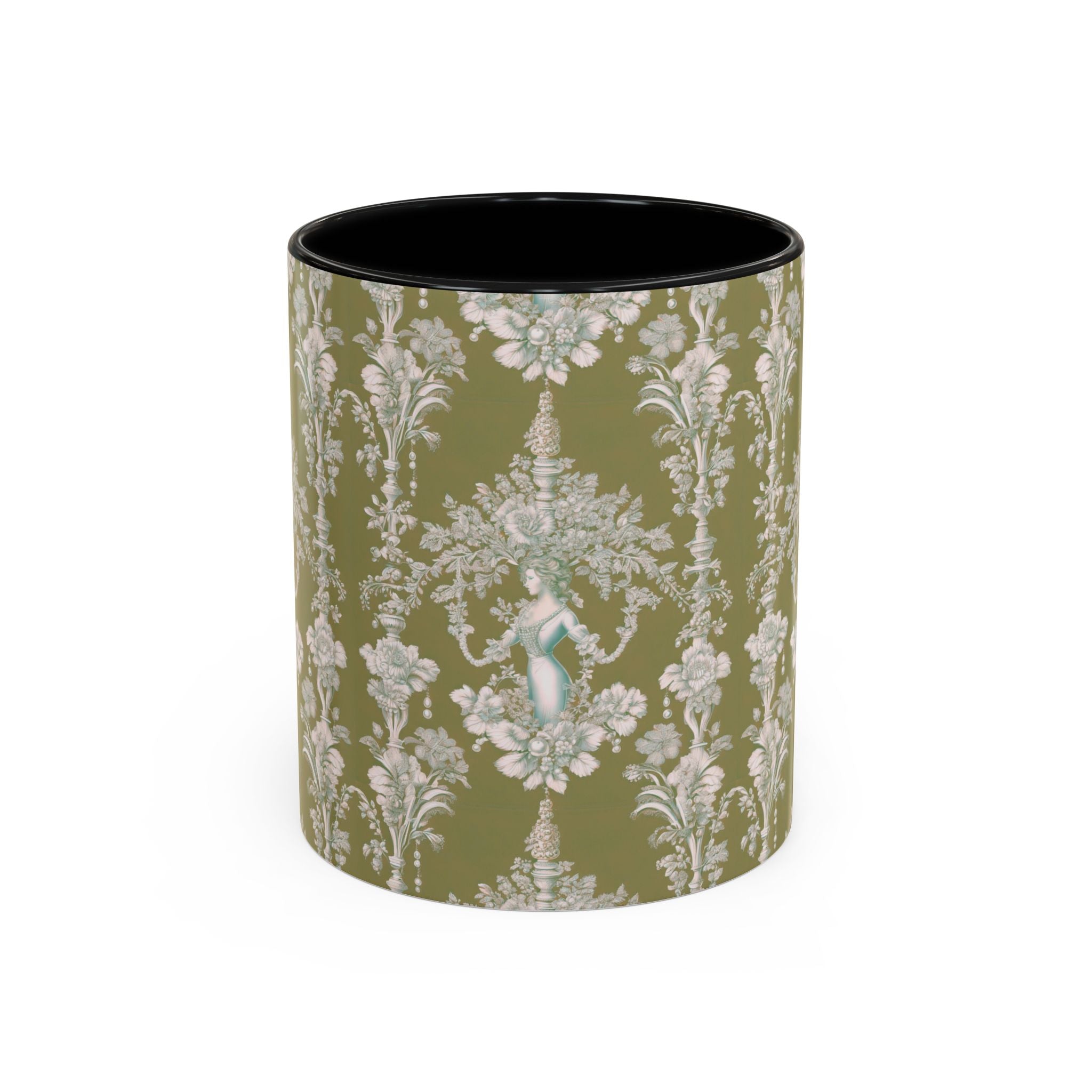 Meet your next favorite morning companion, the accented ceramic mug. Features tropical-inspired original art, Pearl Toile Lady in Highborn Green repeat taking you on a virtual vacation with its unique design of a woman stylized as a pearl surrounded by novel classical pearl elements in modern toile pattern. This mug brings the perfect blend of style and functionality to elevate your coffee or tea ritual. Available in two generous sizes, 11oz (0.33 l) and 15oz (0.44 l), this mug offers ample space for your favorite brew. Made with white ceramic and sporting a sleek glossy finish with eye-catching contrast, this mug is a bliss both to use and to look at. The ergonomic C-shaped handle provides a comfortable grip, while the lead and BPA-free construction guarantee peace of mind with every sip.