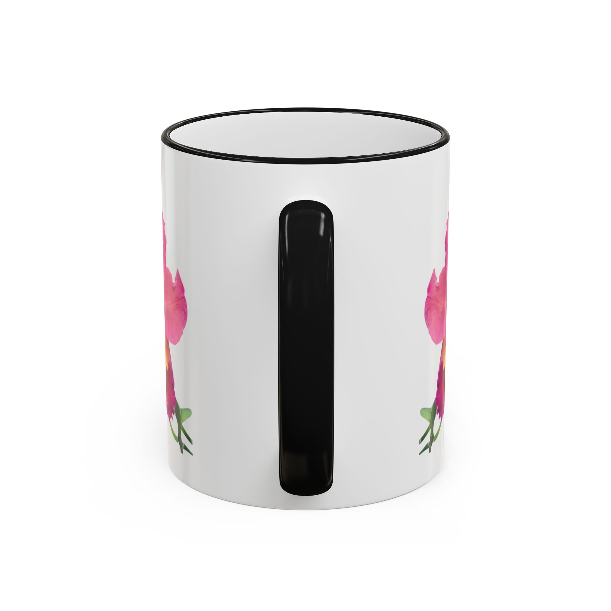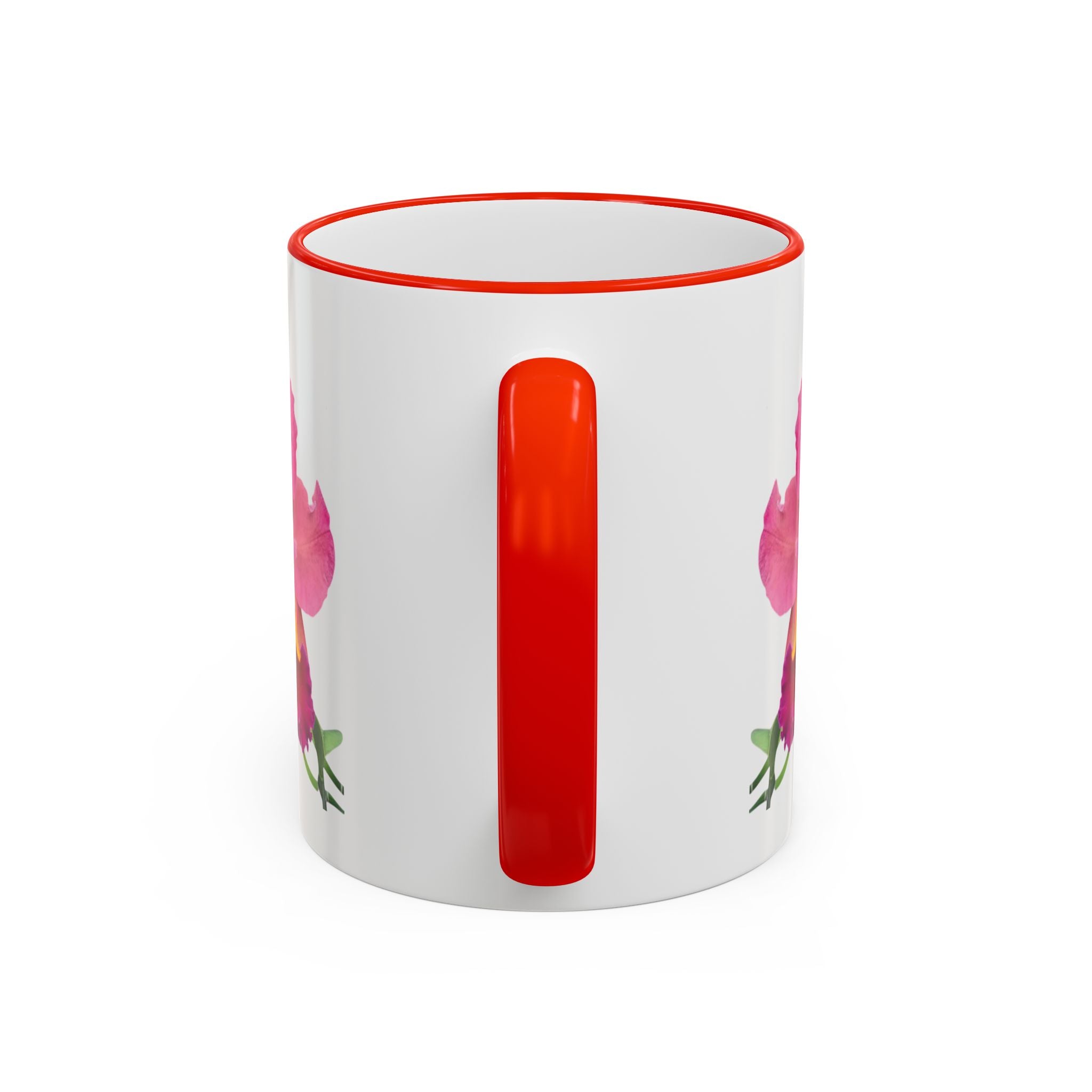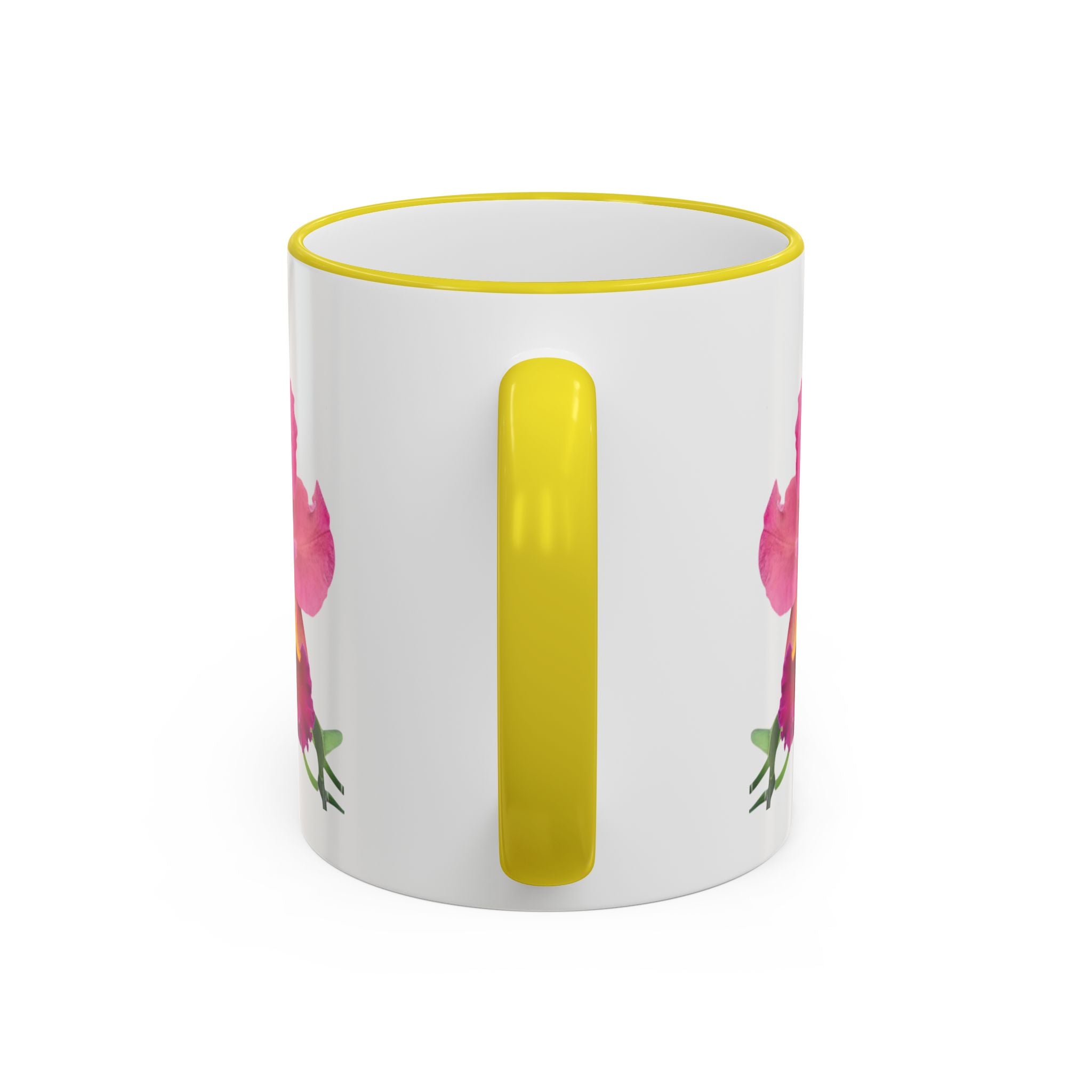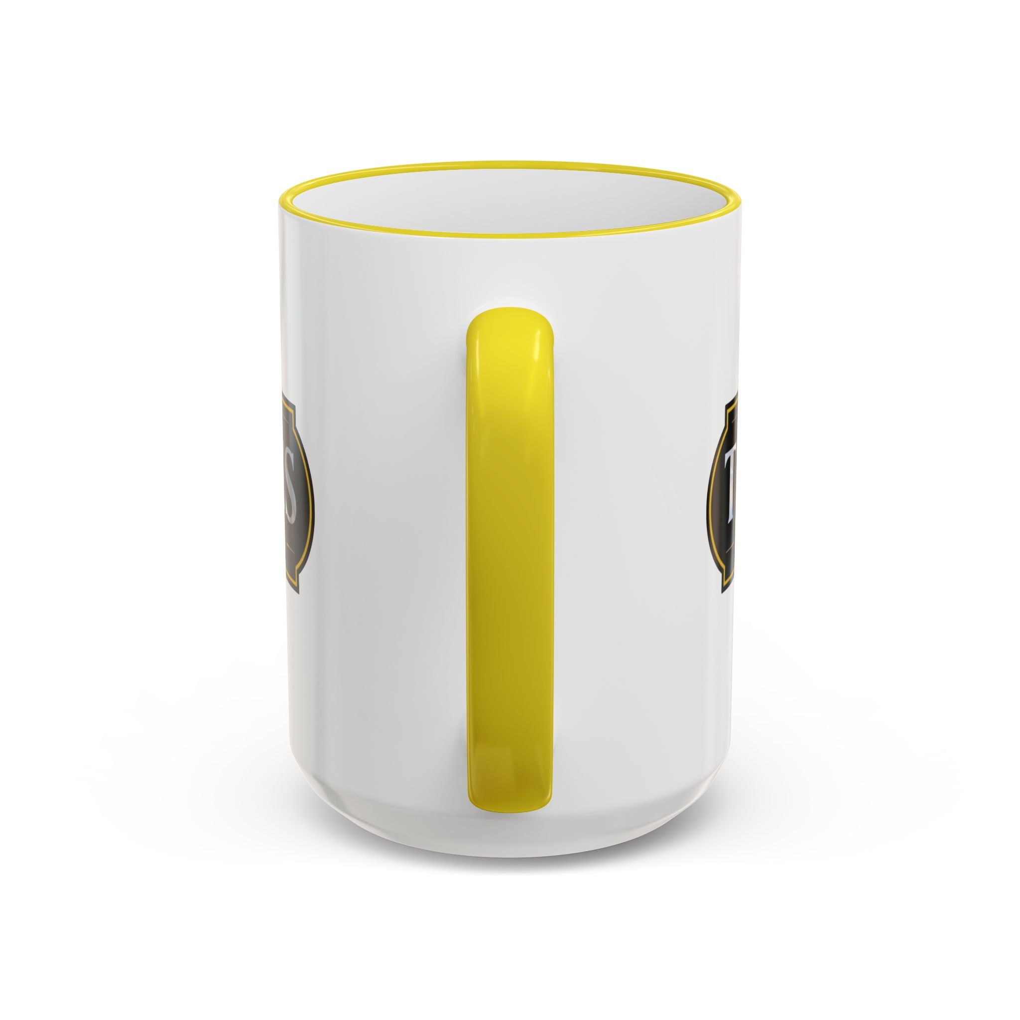 - Available in 11oz and 15oz with C-shaped handle and colored rim