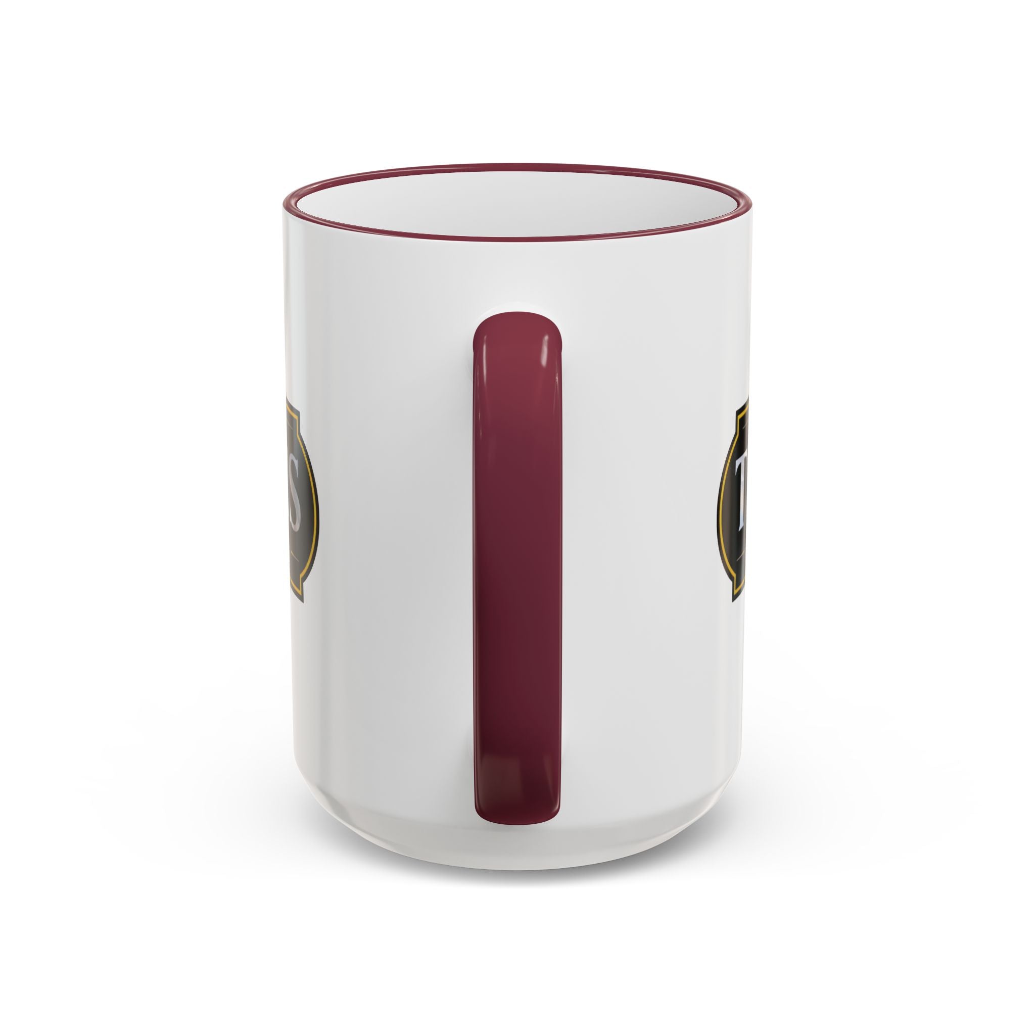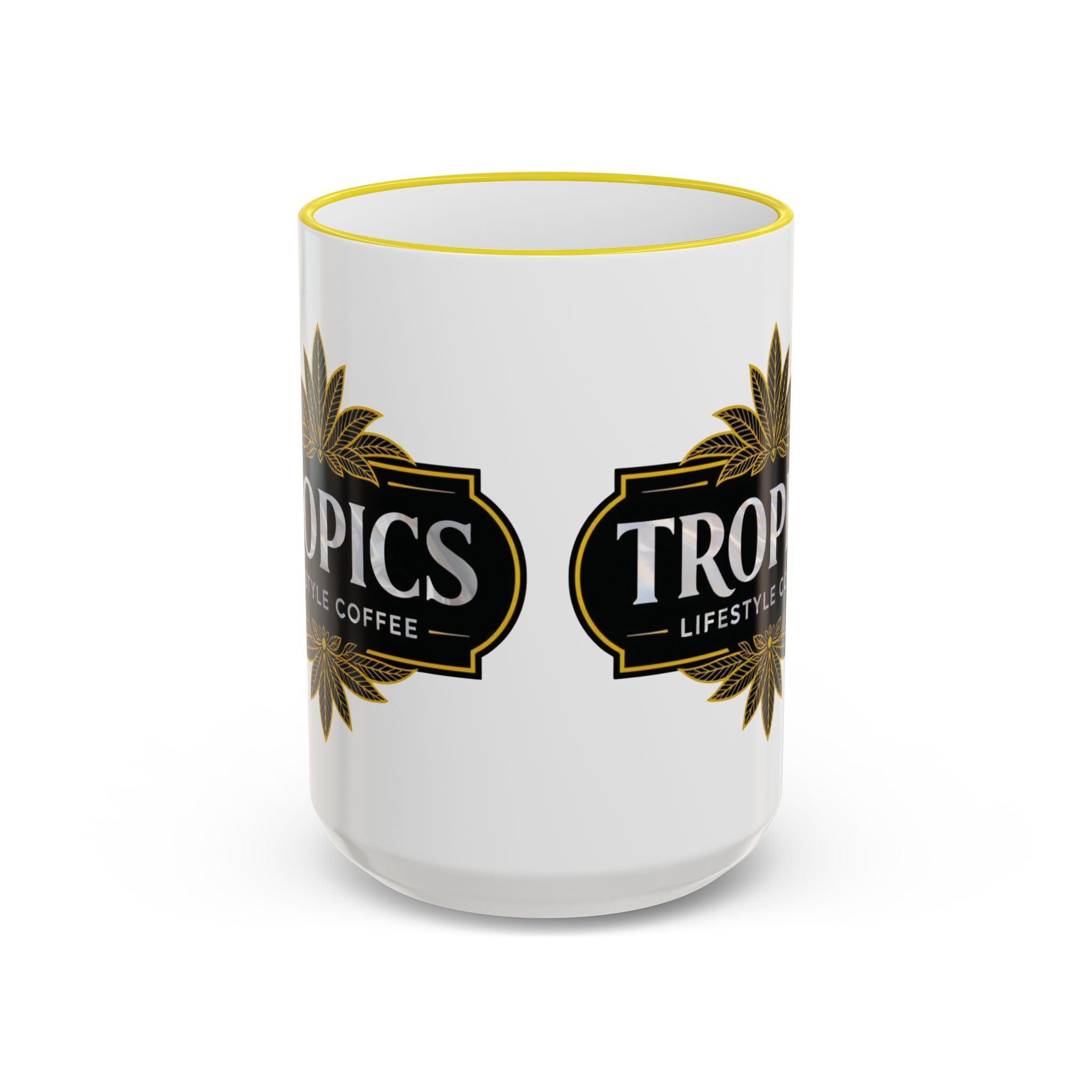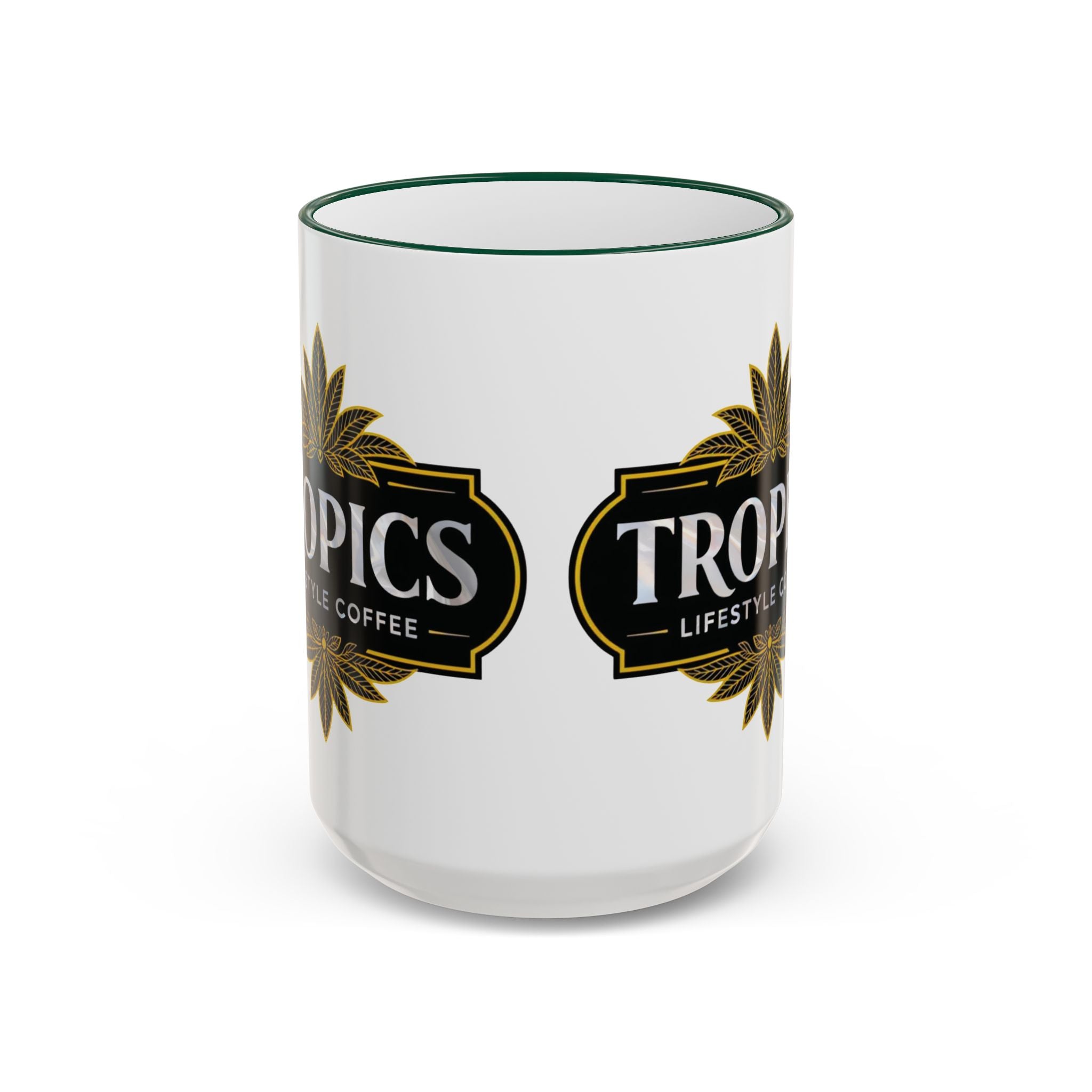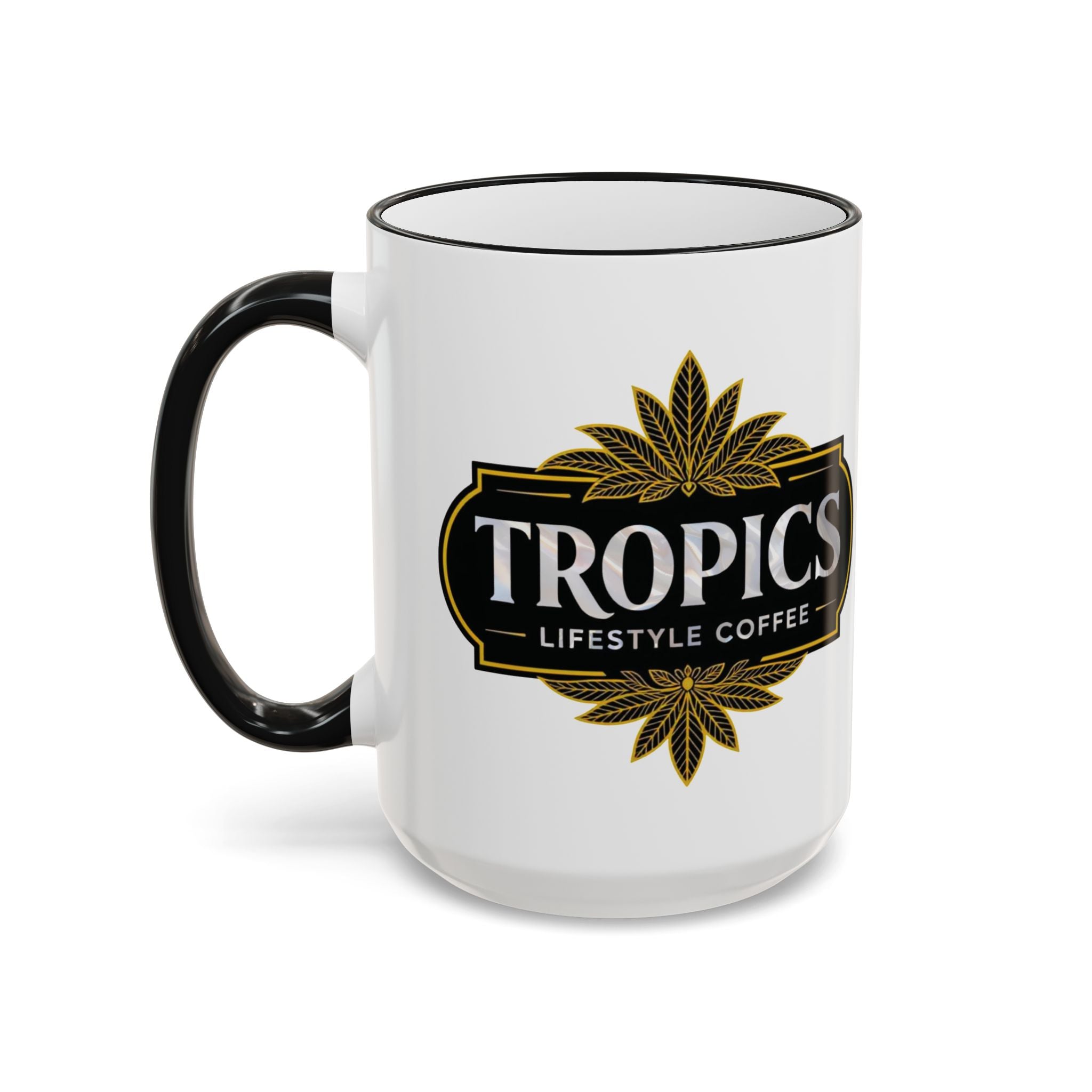 A warm, artful ceramic mug that brings a quiet moment of beauty to morning routines. Enjoy the Art Deco design of our brand's logo, horizontal orientation, framed by a contrasting colored rim and handle that adds a handcrafted touch. The glossy print keeps colors vivid sip after sip, while a comfortable C-shaped handle makes it easy to cradle during slow mornings or shared conversations. Choose between a compact 11oz or a roomy 15oz for longer coffee breaks or steamy tea sessions.