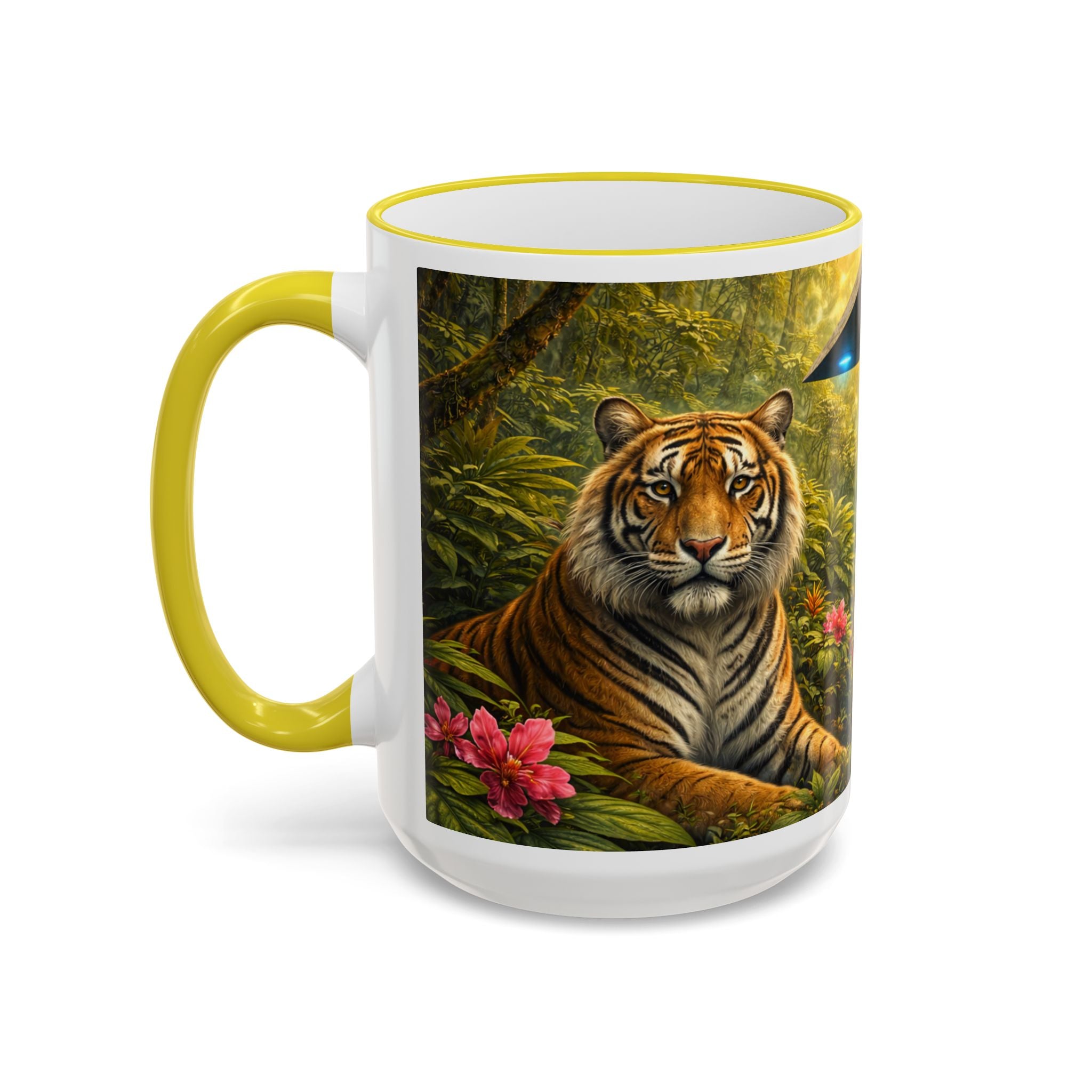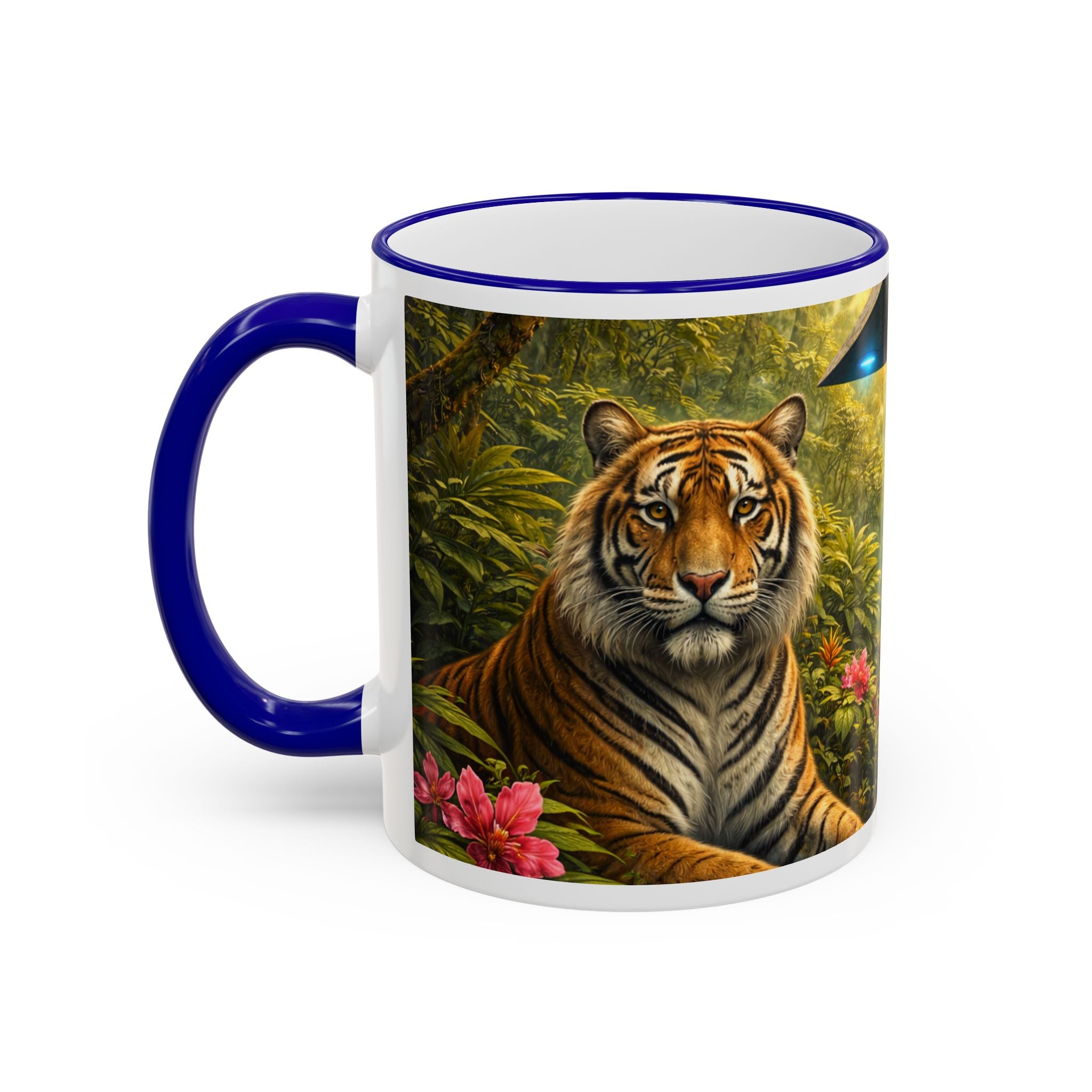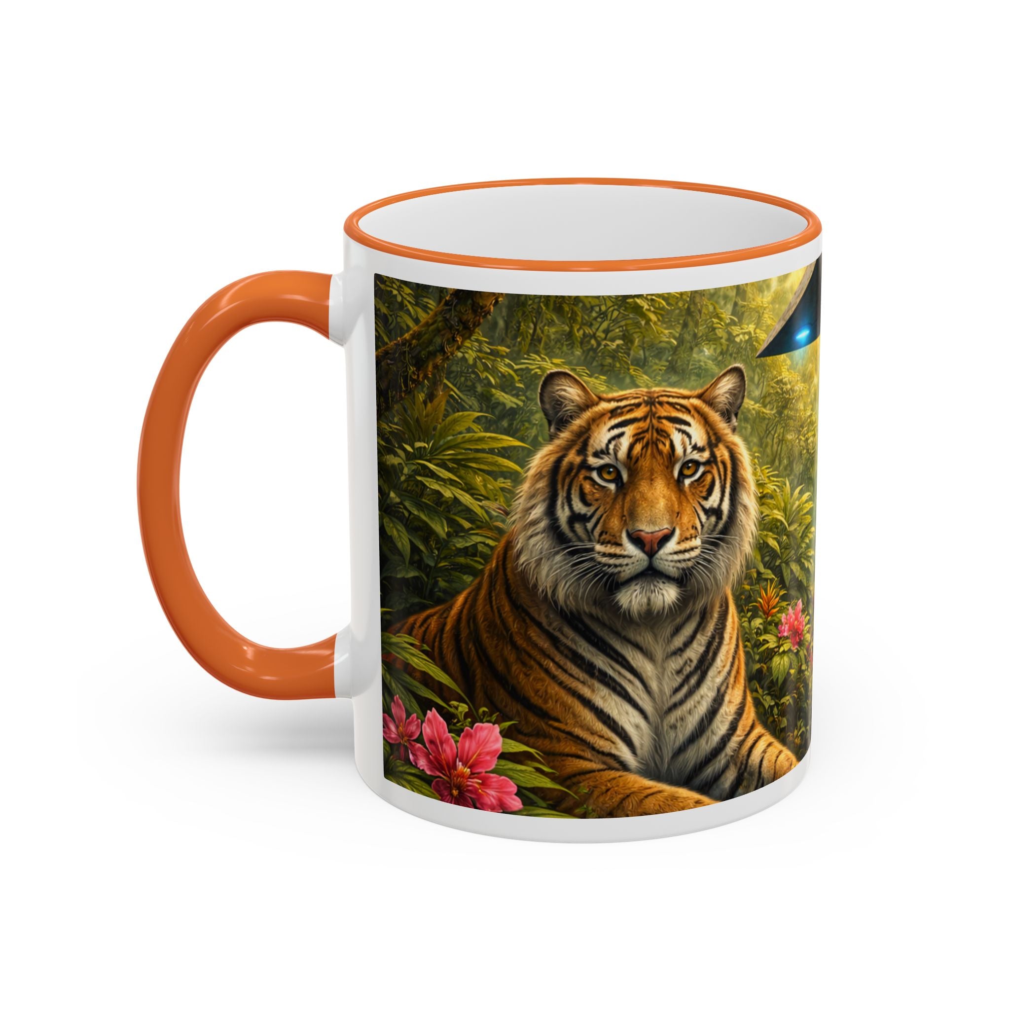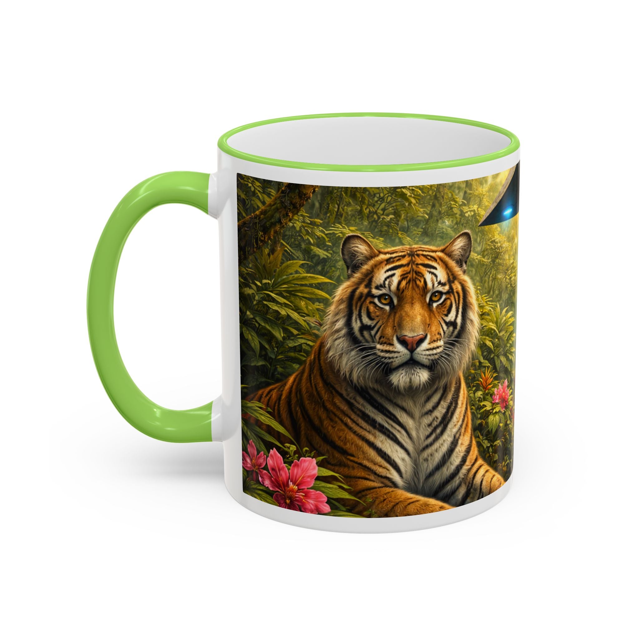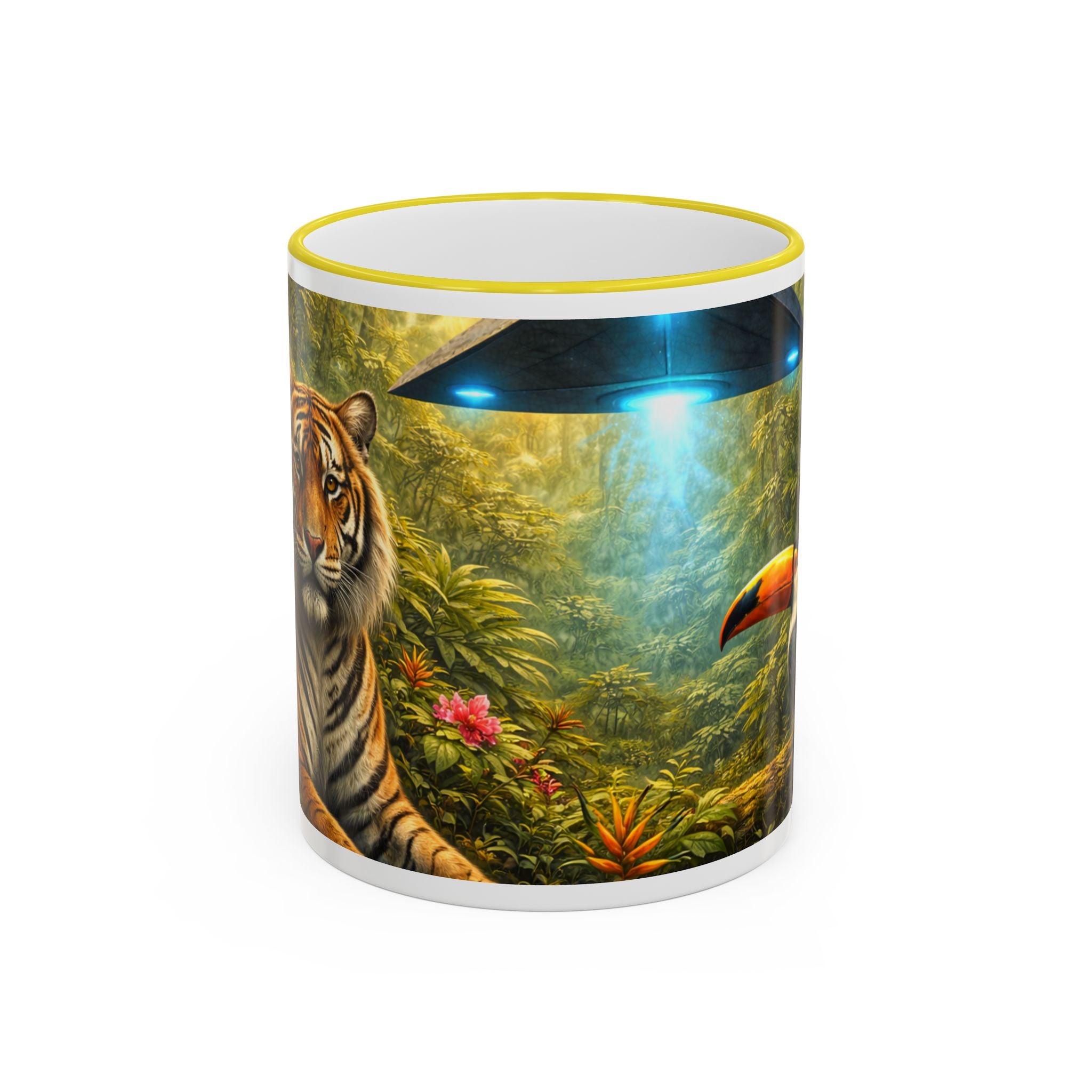 Sip slowly and let your imagination unspool. This ceramic mug pairs a bold colored rim and handle with a vivid, wraparound jungle scene—tiger lounging among orchids beneath mysterious blue light from an otherworldly UFO craft. It feels like a quiet morning at the edge of adventure: warm coffee in hand, the air thick with green leaves and a hint of the unknown. For someone who loves nature with a twist of the fantastic, this mug turns a routine drink into a moment of story and wonder.