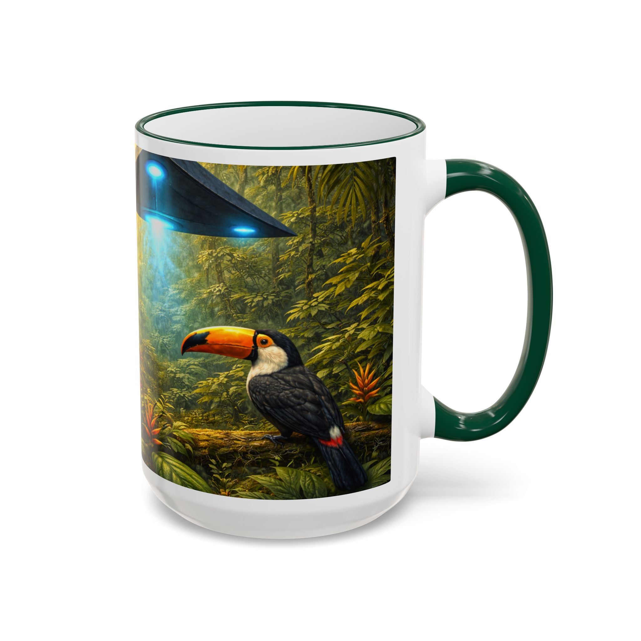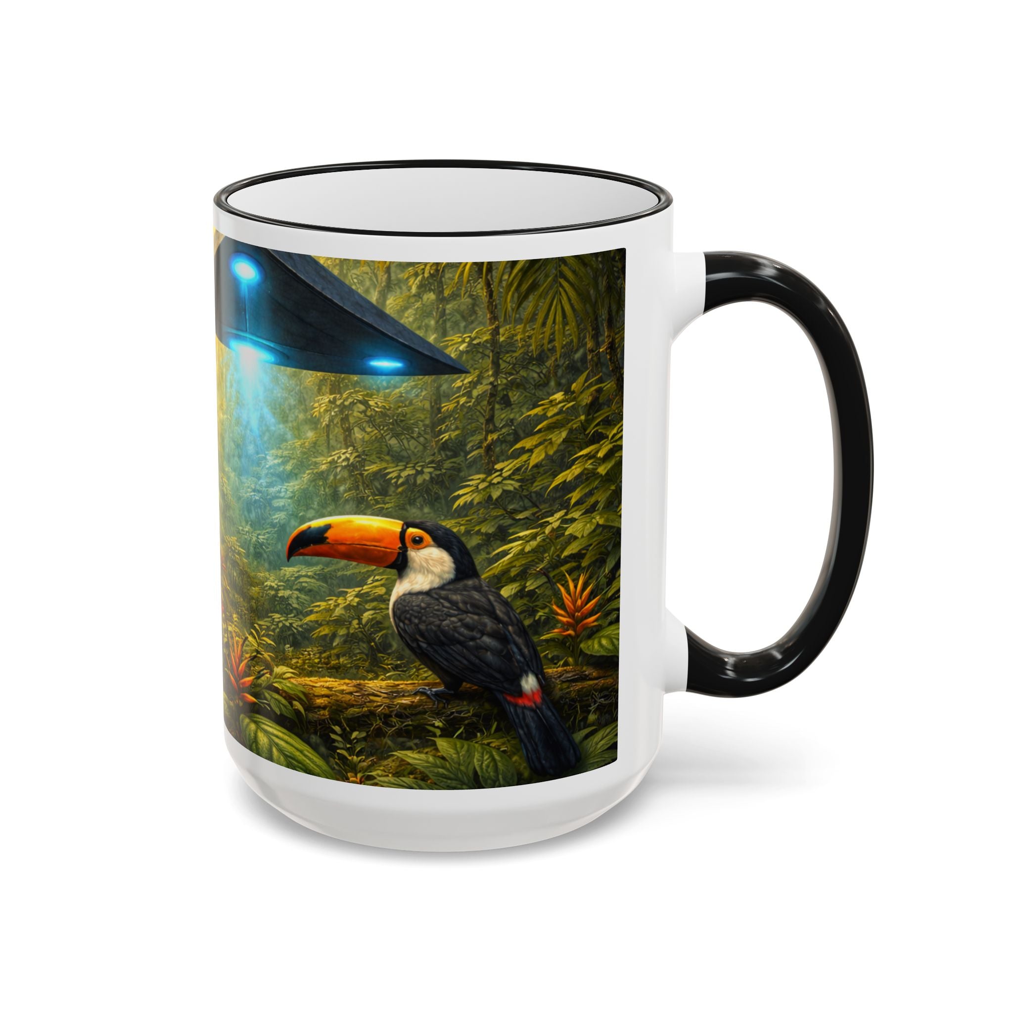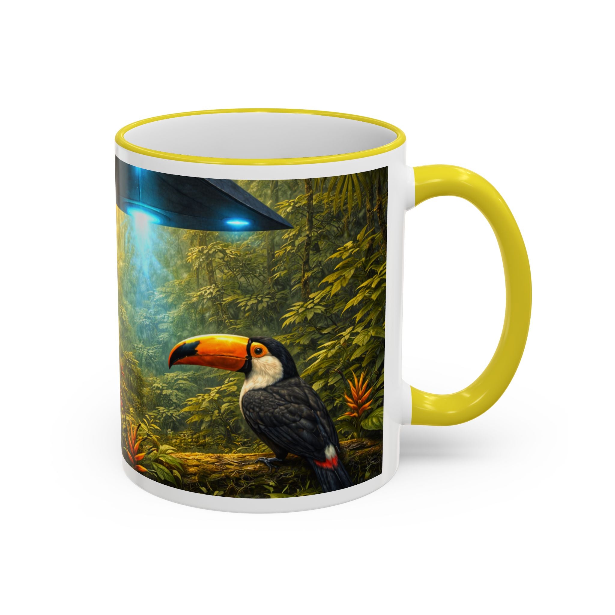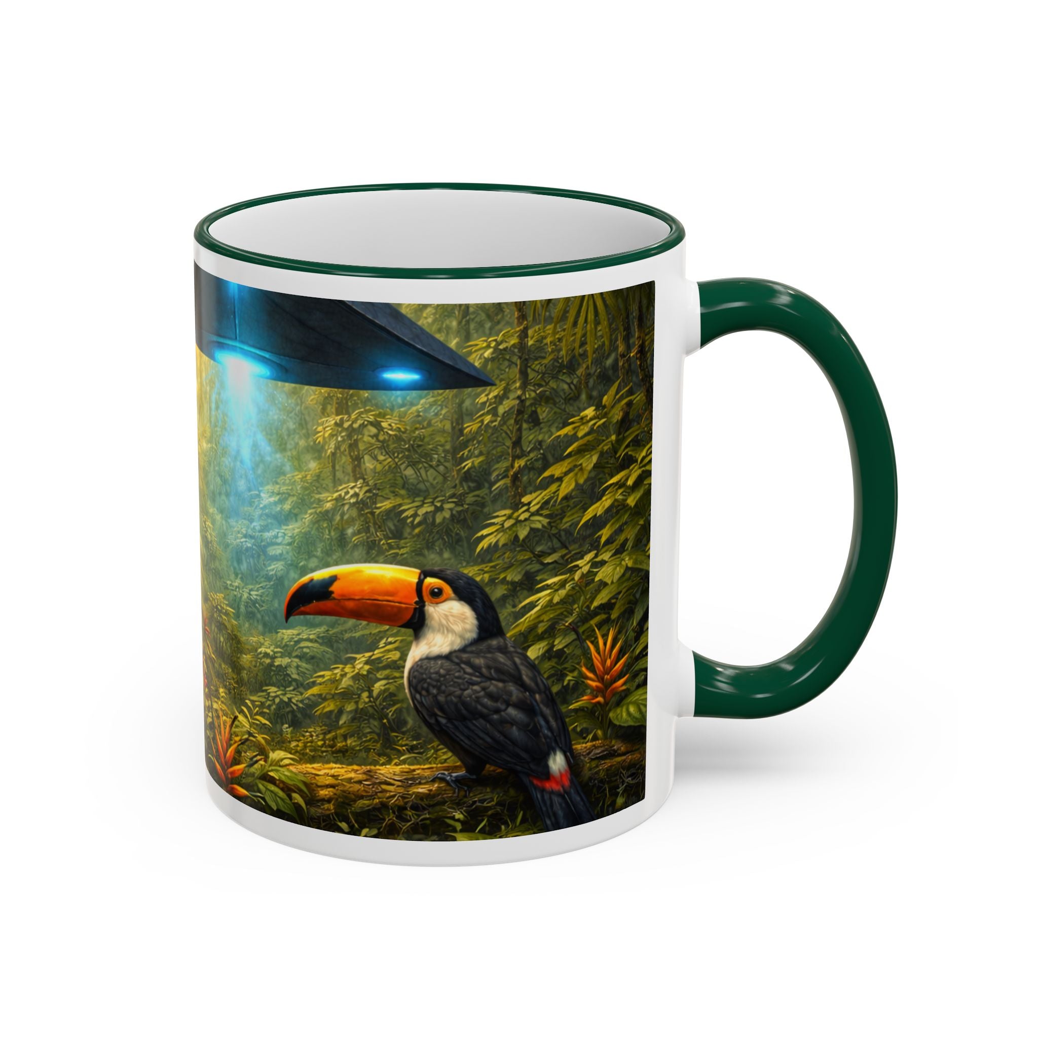 Sip slowly and let your imagination unspool. This ceramic mug pairs a bold colored rim and handle with a vivid, wraparound jungle scene—tiger lounging among orchids beneath mysterious blue light from an otherworldly UFO craft. It feels like a quiet morning at the edge of adventure: warm coffee in hand, the air thick with green leaves and a hint of the unknown. For someone who loves nature with a twist of the fantastic, this mug turns a routine drink into a moment of story and wonder.