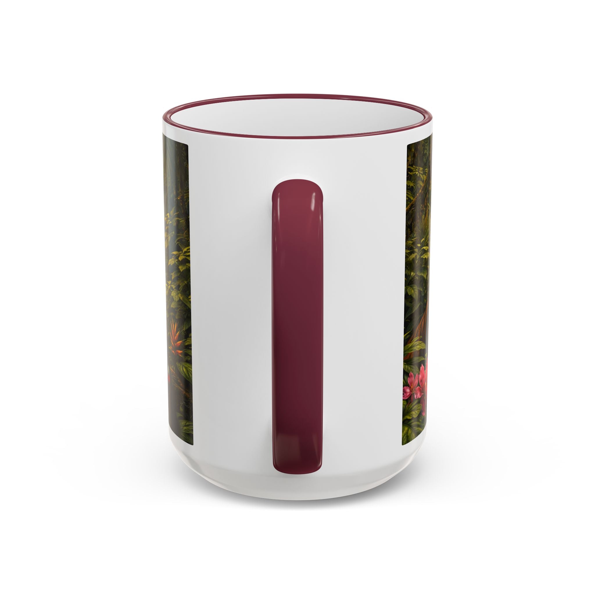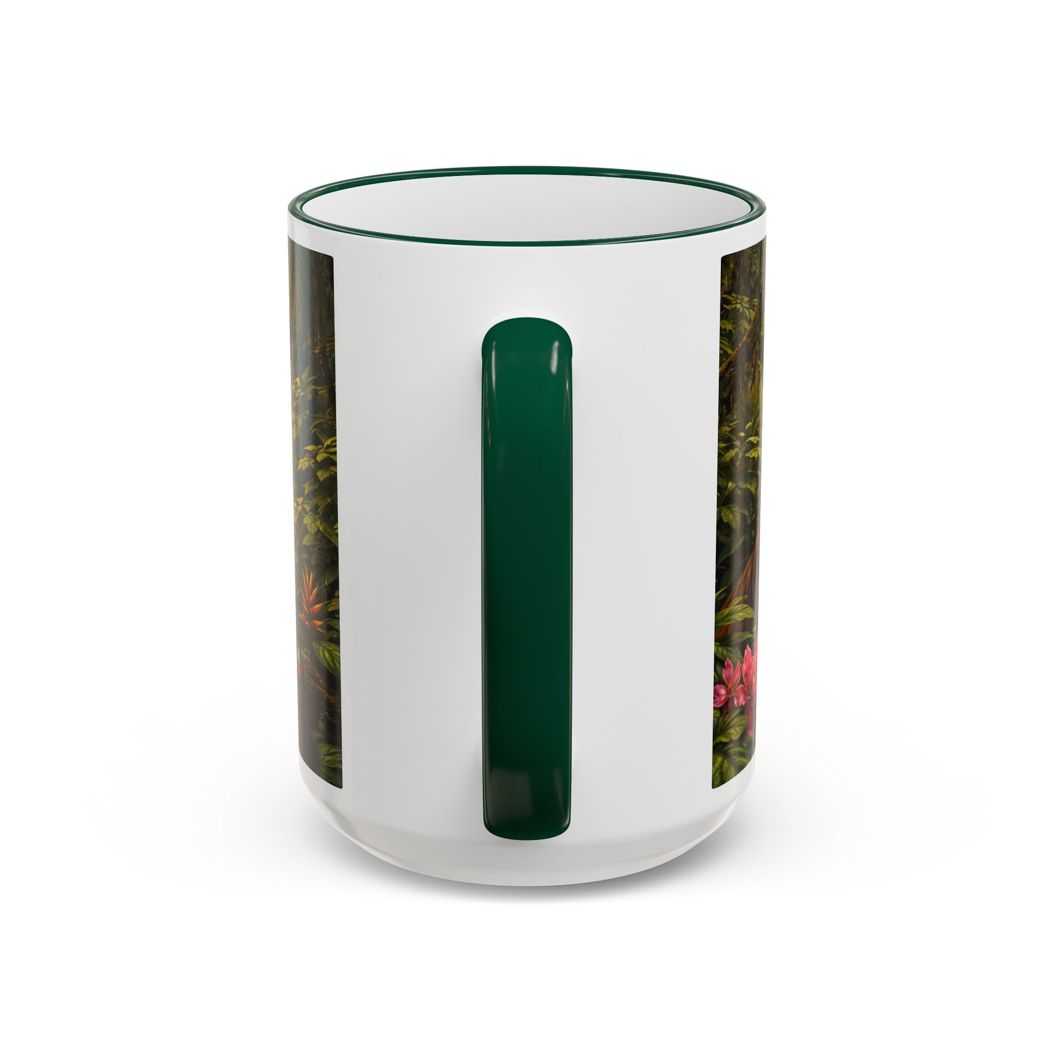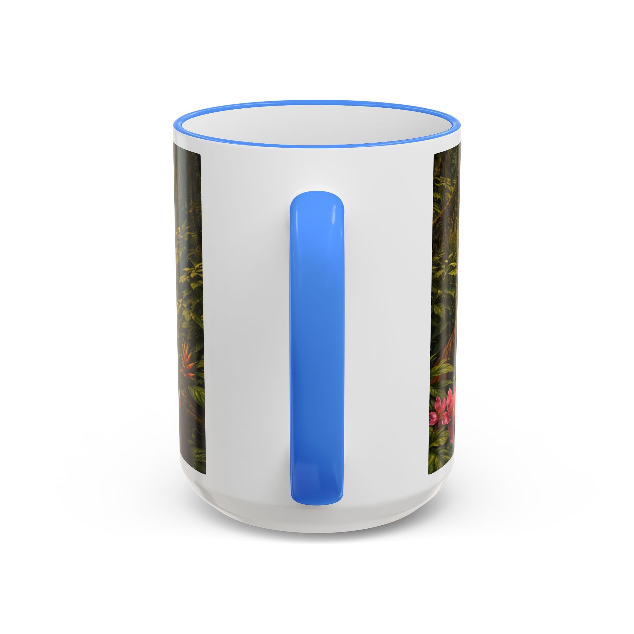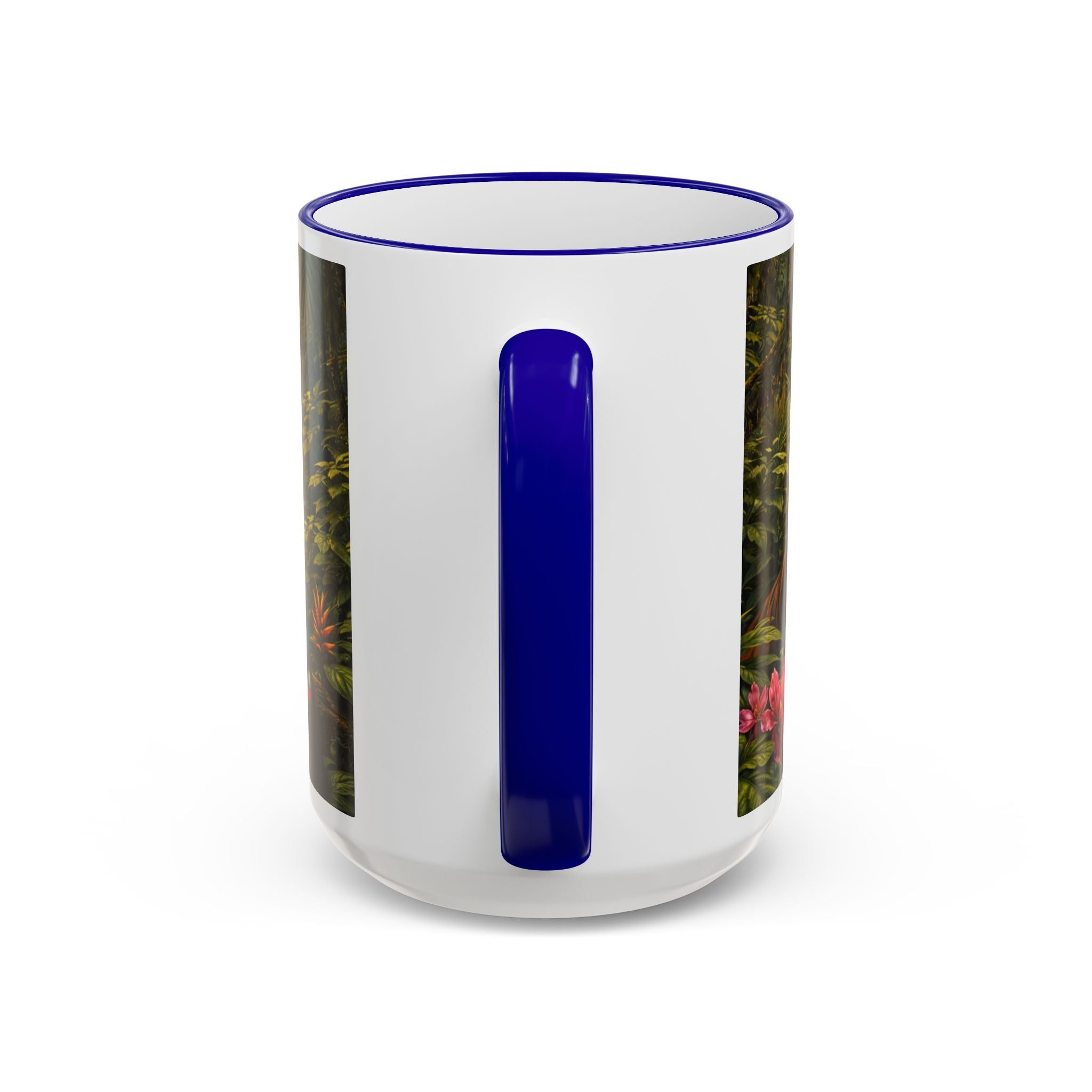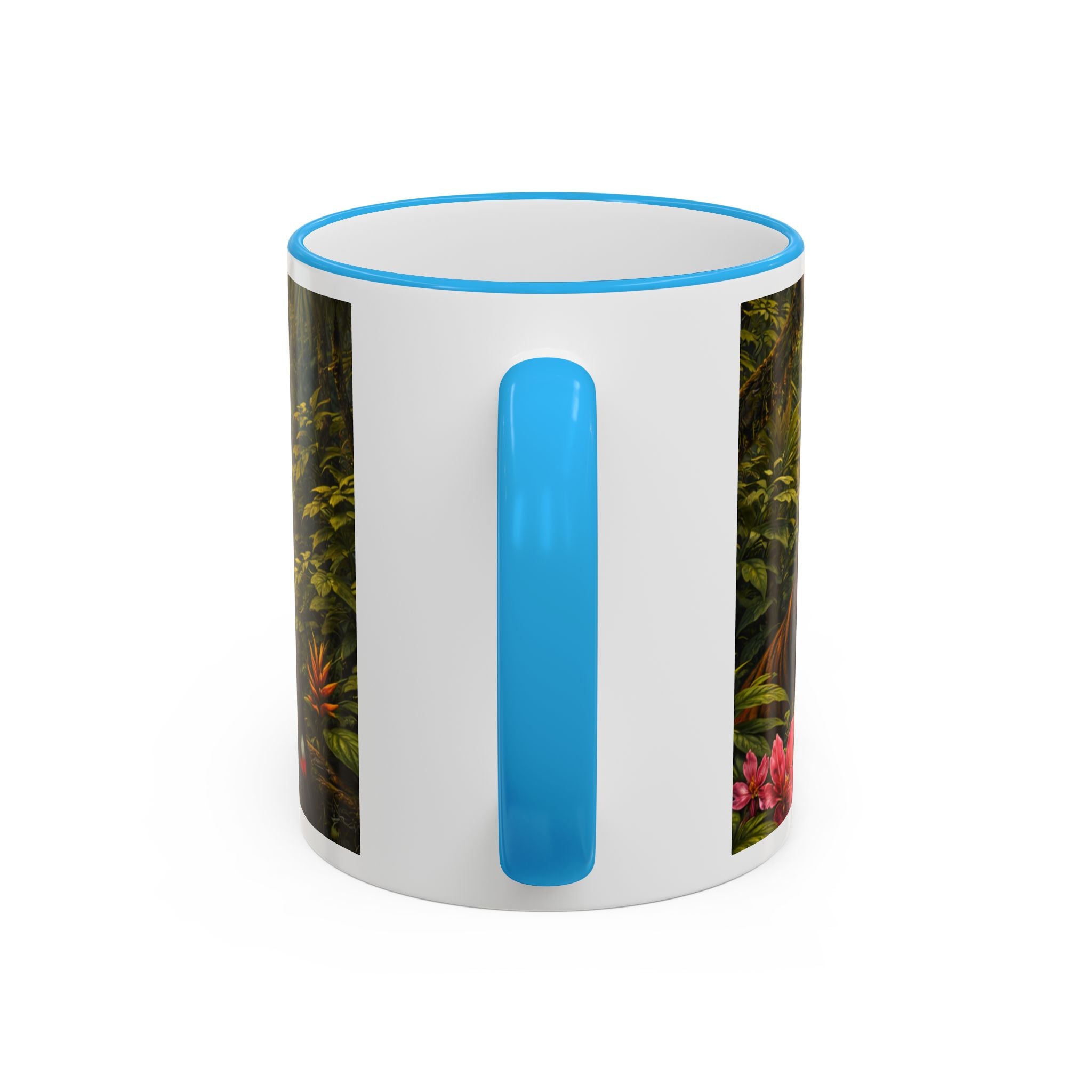 Sip slowly and let your imagination unspool. This ceramic mug pairs a bold colored rim and handle with a vivid, wraparound jungle scene—tiger lounging among orchids beneath mysterious blue light from an otherworldly UFO craft. It feels like a quiet morning at the edge of adventure: warm coffee in hand, the air thick with green leaves and a hint of the unknown. For someone who loves nature with a twist of the fantastic, this mug turns a routine drink into a moment of story and wonder.