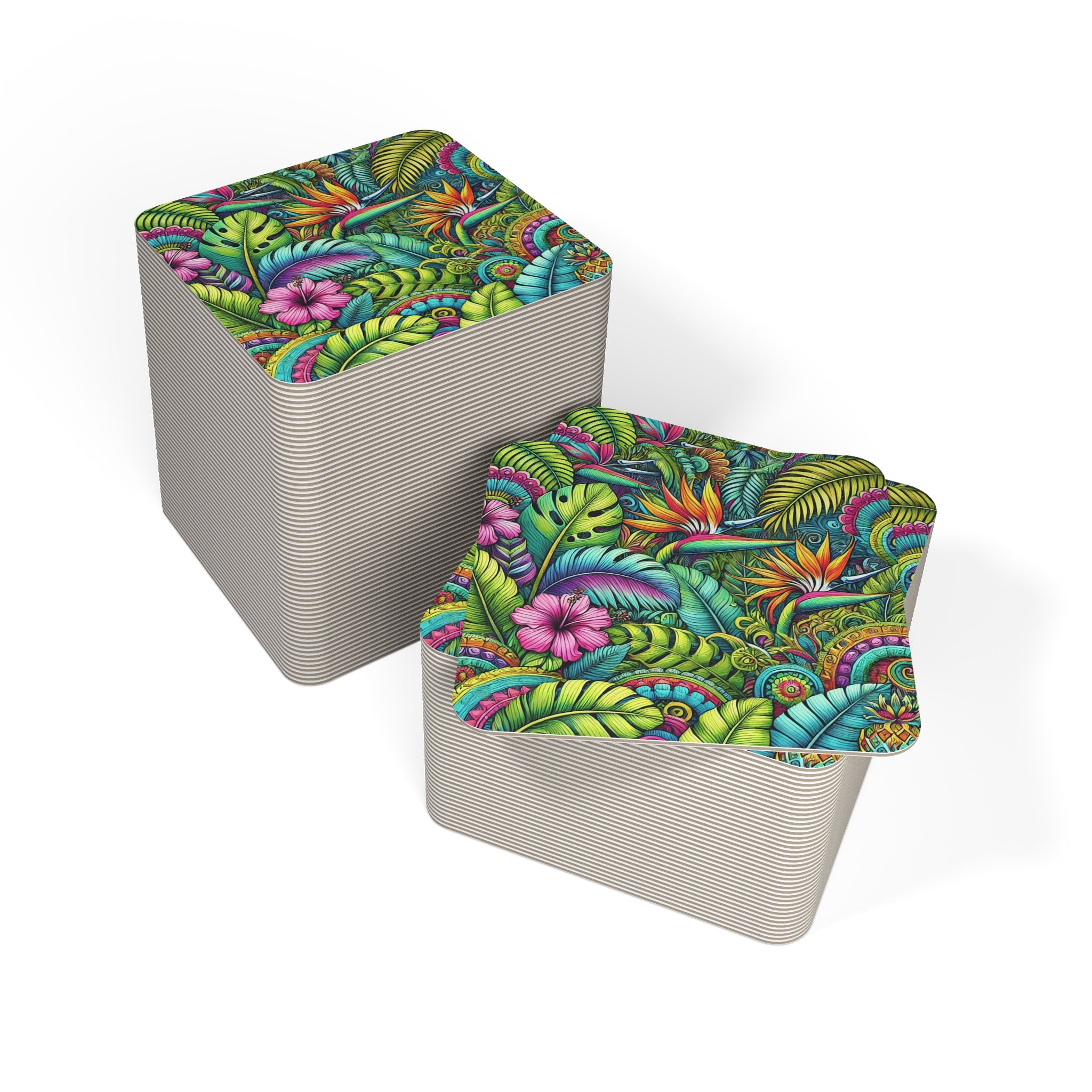 Bright, hand-drawn tropical coasters that bring a rush of color to tabletops. Each 4" square coaster features a single-sided, highly detailed print of lush leaves, hibiscus blooms and bird-of-paradise flowers in vivid greens, pinks and oranges. Because they come in sets of 50 or 100, they work for lively dinner parties, backyard tiki nights, or for refilling a coffee corner at the office. The matte hardboard feels sturdy under glass and cups, and the consistent print across a set creates a cohesive, punchy look that reads like a small work of art across any surface. Assembled in the USA from globally sourced parts, these coasters are an easy way to add bold, tropical energy to gatherings and everyday moments.