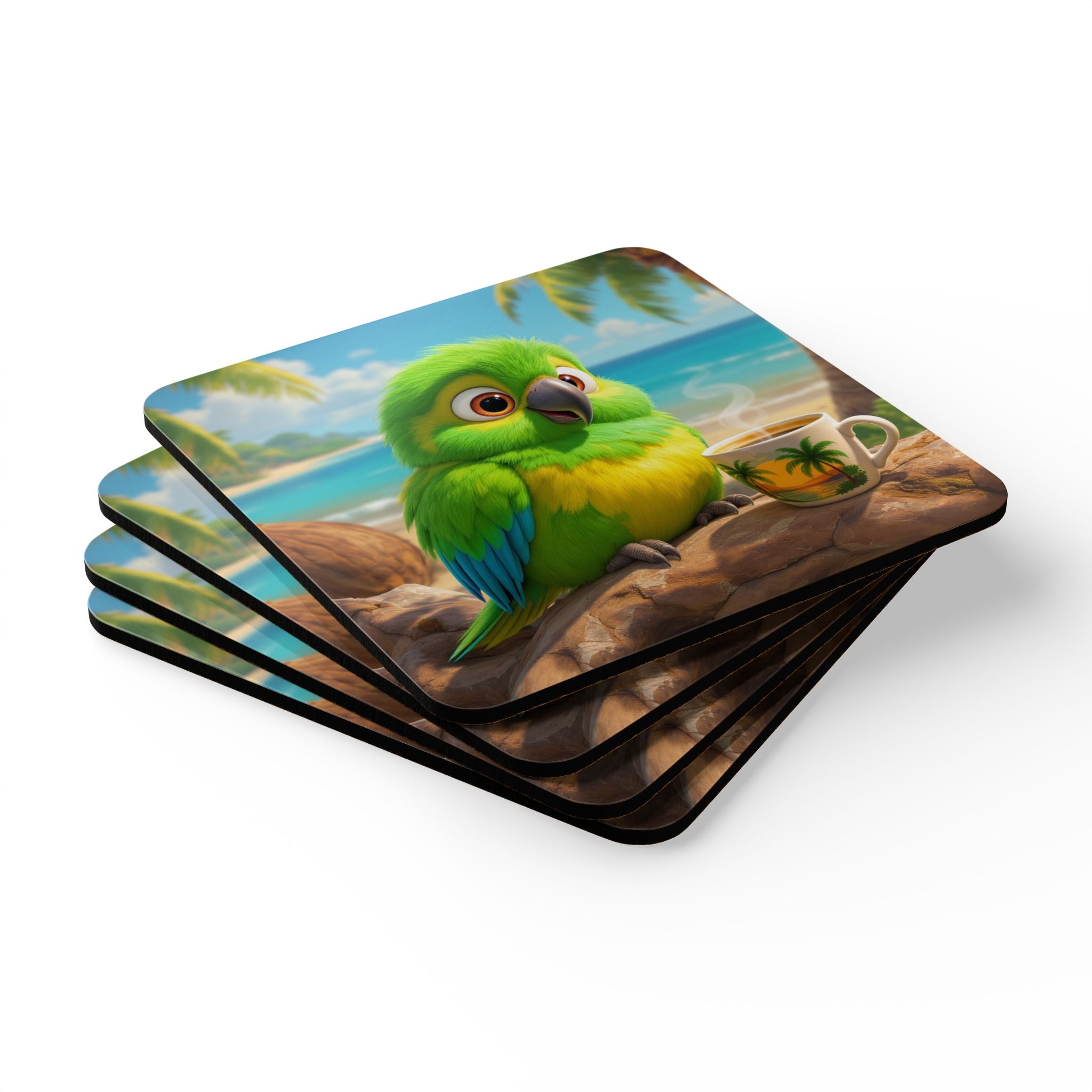 Upgrade your home’s décor with this personalized coaster set featuring a super tropical vibe. Perfect for parties with 1 to 100 in attendance, this 4-piece set includes high-gloss MDF tops and cork backs to prevent sliding. Our exclusive Lulu the parrot drinking coffee design adds a fun and vibrant touch to your space, making it a must-have for anyone who loves hosting gatherings or tropical-themed decor. Ideal for holidays, parties, and everyday use.