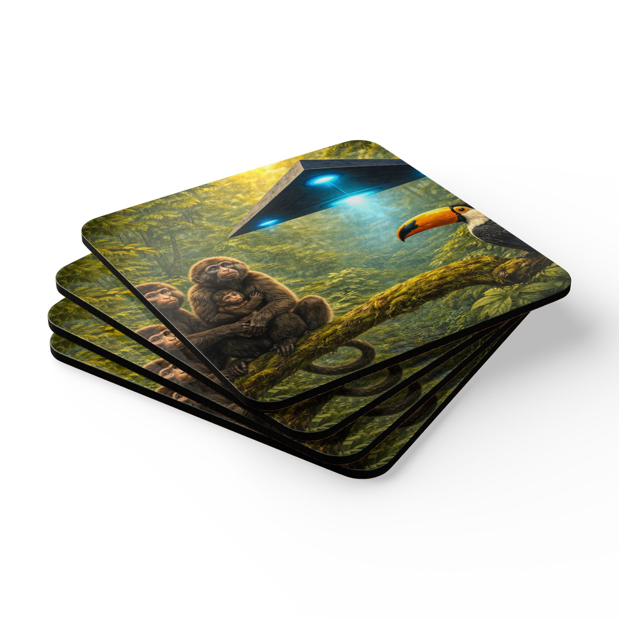 Upgrade your home’s décor with this personalized coaster set featuring a super tropical vibe. Perfect for parties with 1 to 100 in attendance, this 4-piece set includes high-gloss MDF tops and cork backs to prevent sliding. Our exclusive design of UFO and a monkey family, plus toucan, in rainforest that adds a fun and vibrant touch to your space, making it a must-have for anyone who loves hosting gatherings or tropical-themed decor.
