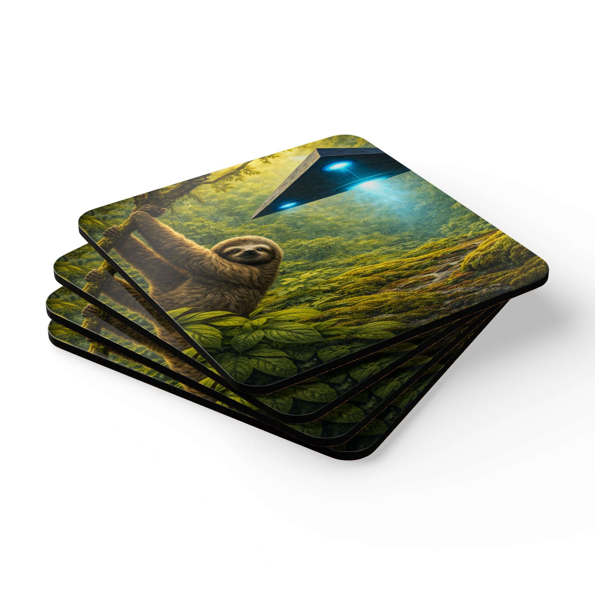 Upgrade your home’s décor with this personalized coaster set featuring a super tropical vibe. Perfect for parties with 1 to 100 in attendance, this 4-piece set includes high-gloss MDF tops and cork backs to prevent sliding. Our exclusive design of UFO and sloth in rainforest adds a fun and vibrant touch to your space, making it a must-have for anyone who loves hosting gatherings or tropical-themed decor.