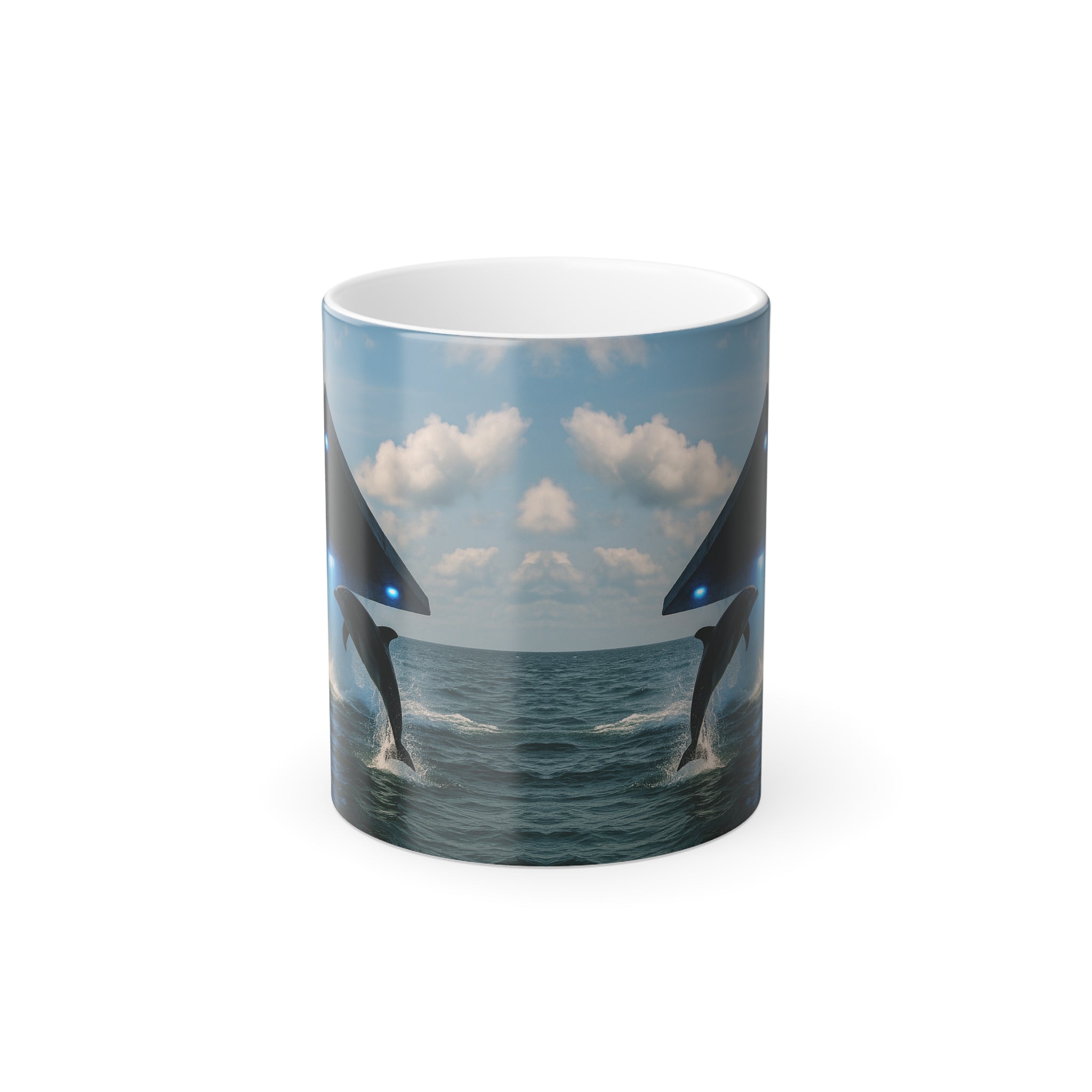 Enjoy the mystery of a UFO and dolphin in the tropical ocean! Personalized mugs are super popular gifts for friends and loved ones. This one changes color and will be the gift that keeps on giving. The heat-reactive surface reveals design once the mug gets warm. The ceramic cup will go back to its original black outside and white inside when it cools down. The C-shaped handle helps keep a sturdy grip. It comes in one size – 11oz (0.33l) – plenty for that big morning cup of coffee.