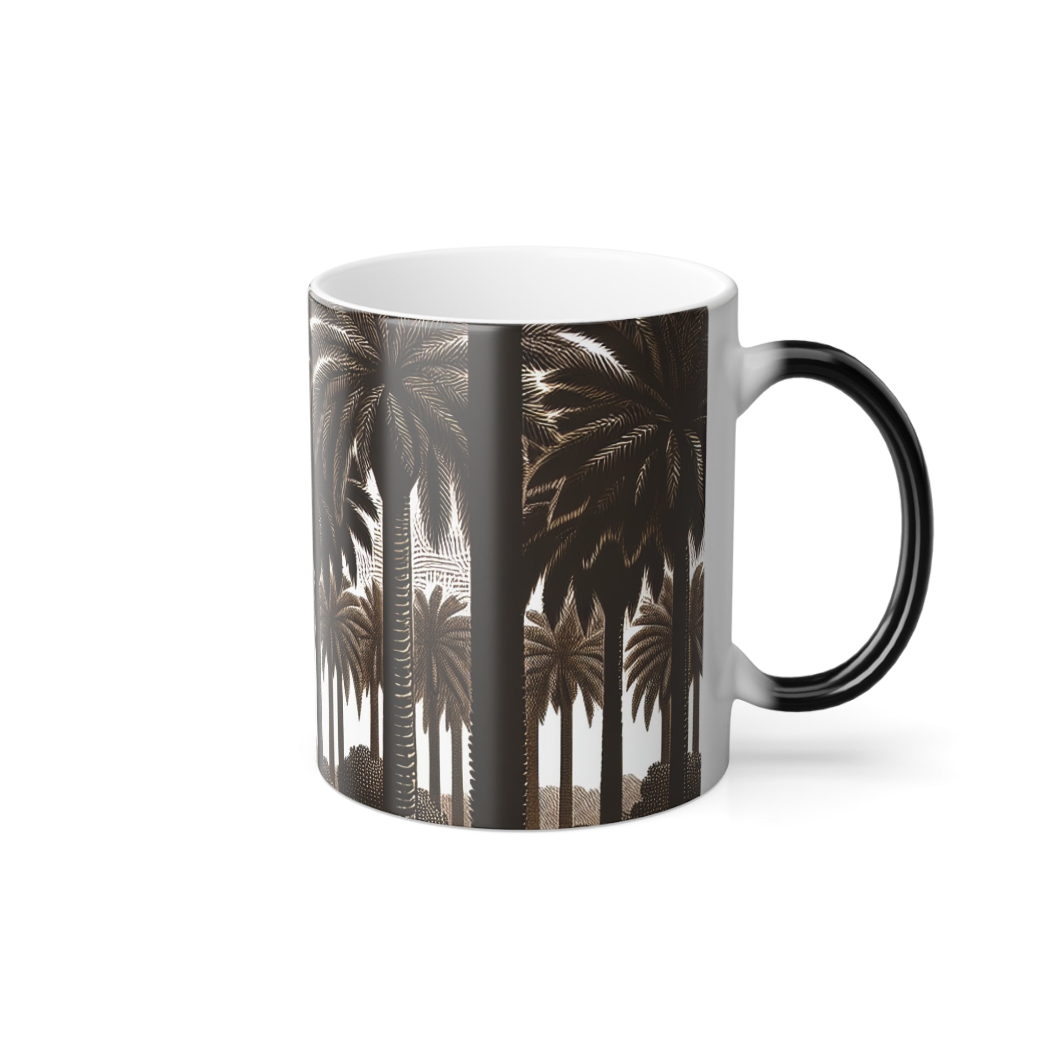 Personalized mugs are super popular gifts for friends and loved ones. This one changes color and will be the gift that keeps on giving. The heat-reactive surface reveals our original art once the mug gets warm. The ceramic cup will go back to its original black outside and white inside when it cools down. The C-shaped handle helps keep a sturdy grip. It comes in one size – 11oz (0.33l) – plenty for that big morning cup of coffee. Features our Woodcut Palm Grove design taking you on a virtual vacation to the tropicis with every sip!