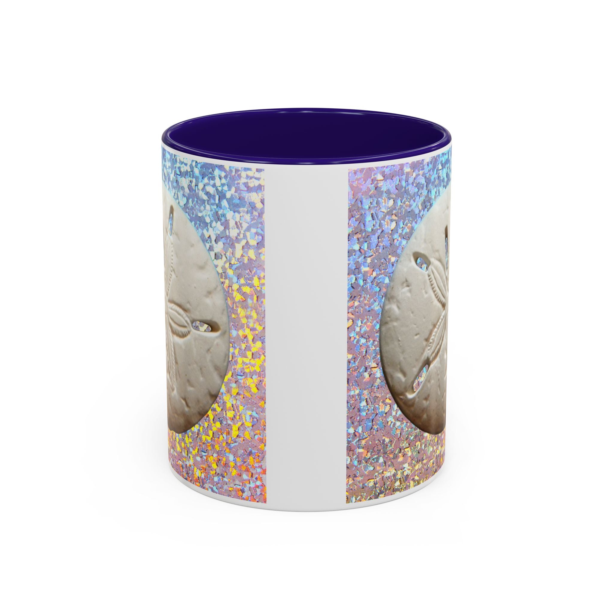 Mugs are a staple in every kitchen and when they're combined with a custom flair, they become instant favorites. Available in 12 color options, these mugs hold 11oz or 15oz of your favorite pick-me-up juice and come with a colored handle and interior. The glossy finish adds a classy touch that perfectly complements the high-fidelity artwork print. Features our original Disco Sand Dollar design created from photograph of a real sand dollar from a tropical beach. Mug takes you on a virtual vacation with every sip!