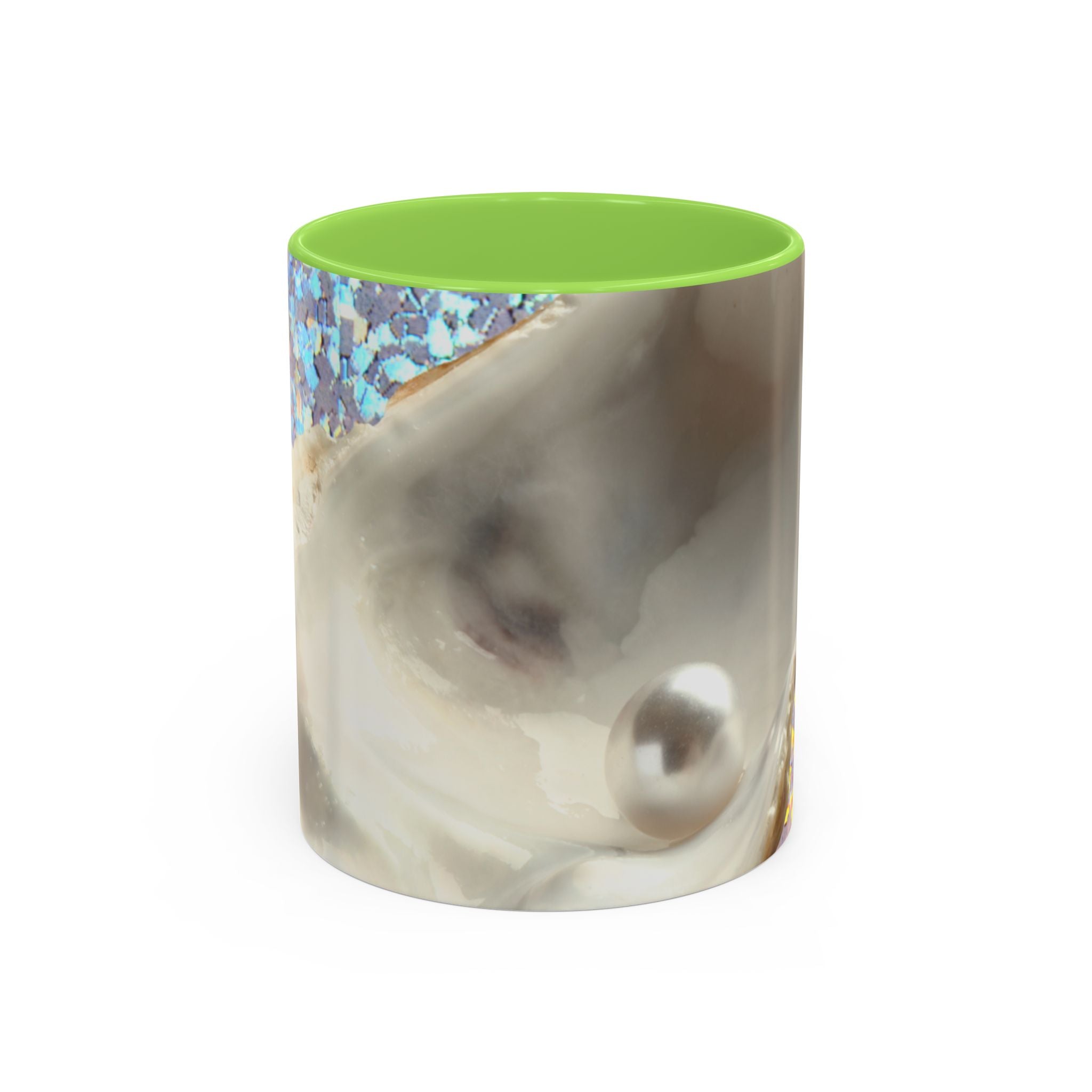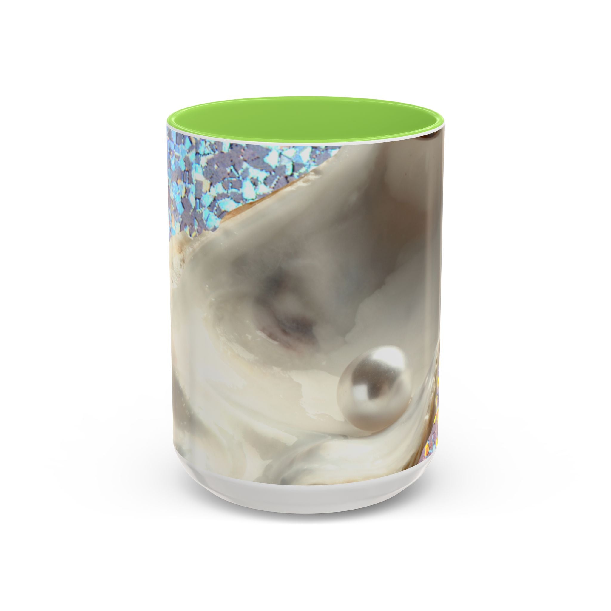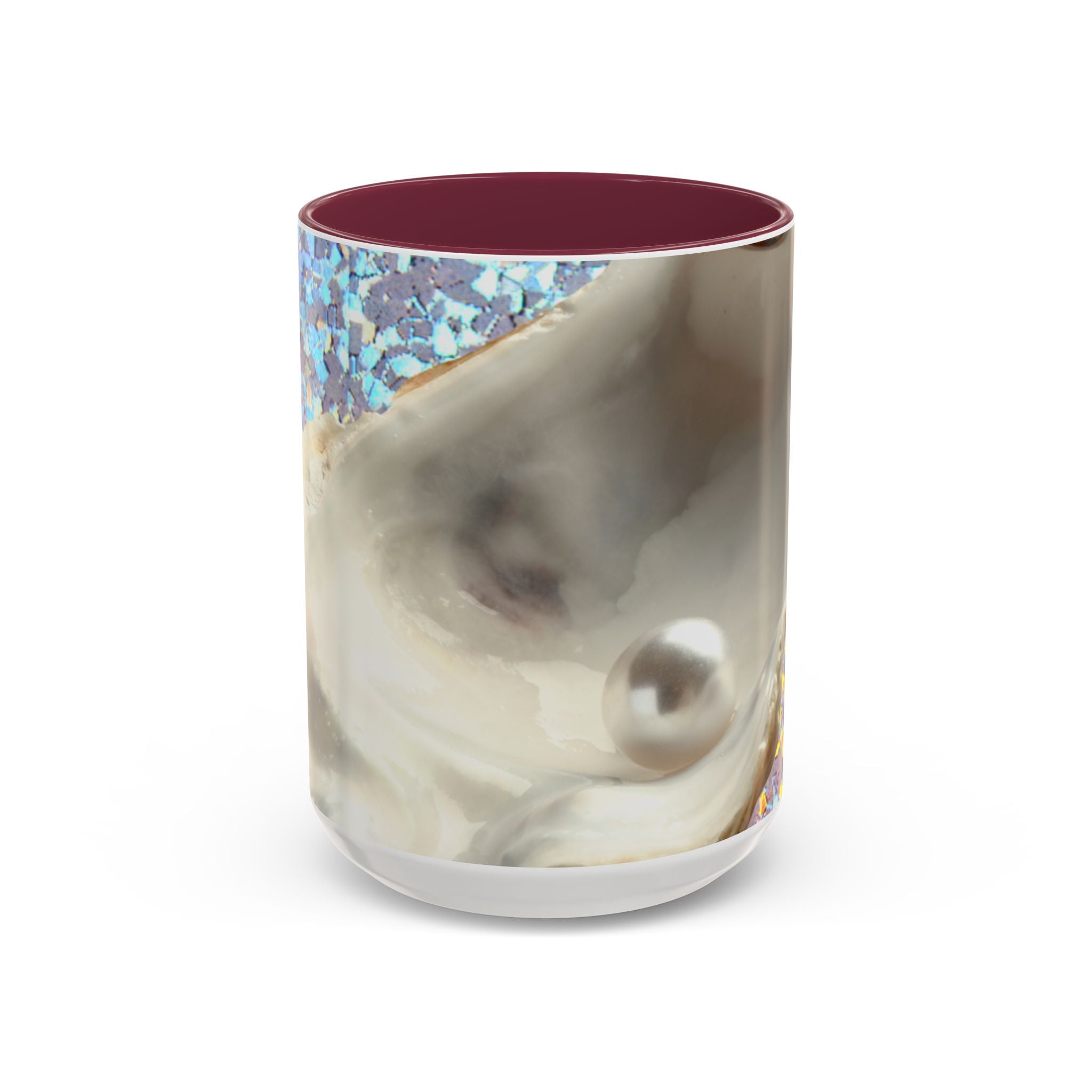 Mugs are a staple in every kitchen and when they're combined with a custom flair, they become instant favorites. Available in 12 color options, these mugs hold 11oz or 15oz of your favorite pick-me-up juice and come with a colored handle and interior. The glossy finish adds a classy touch that perfectly complements the high-fidelity artwork print. Features our original Disco Pearl Oyster macro design created from photograph of a real shell! Look at that gorgeous white pearl, the gemstone of the sea. Mug will take you on a coastal vacay with every sip!