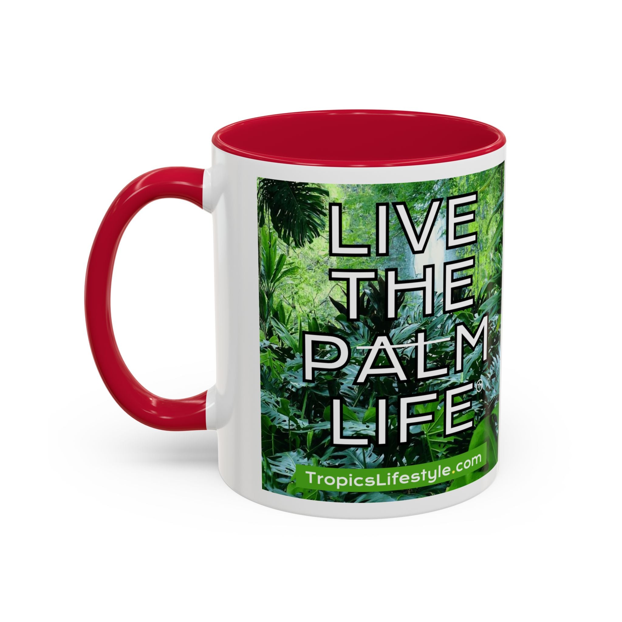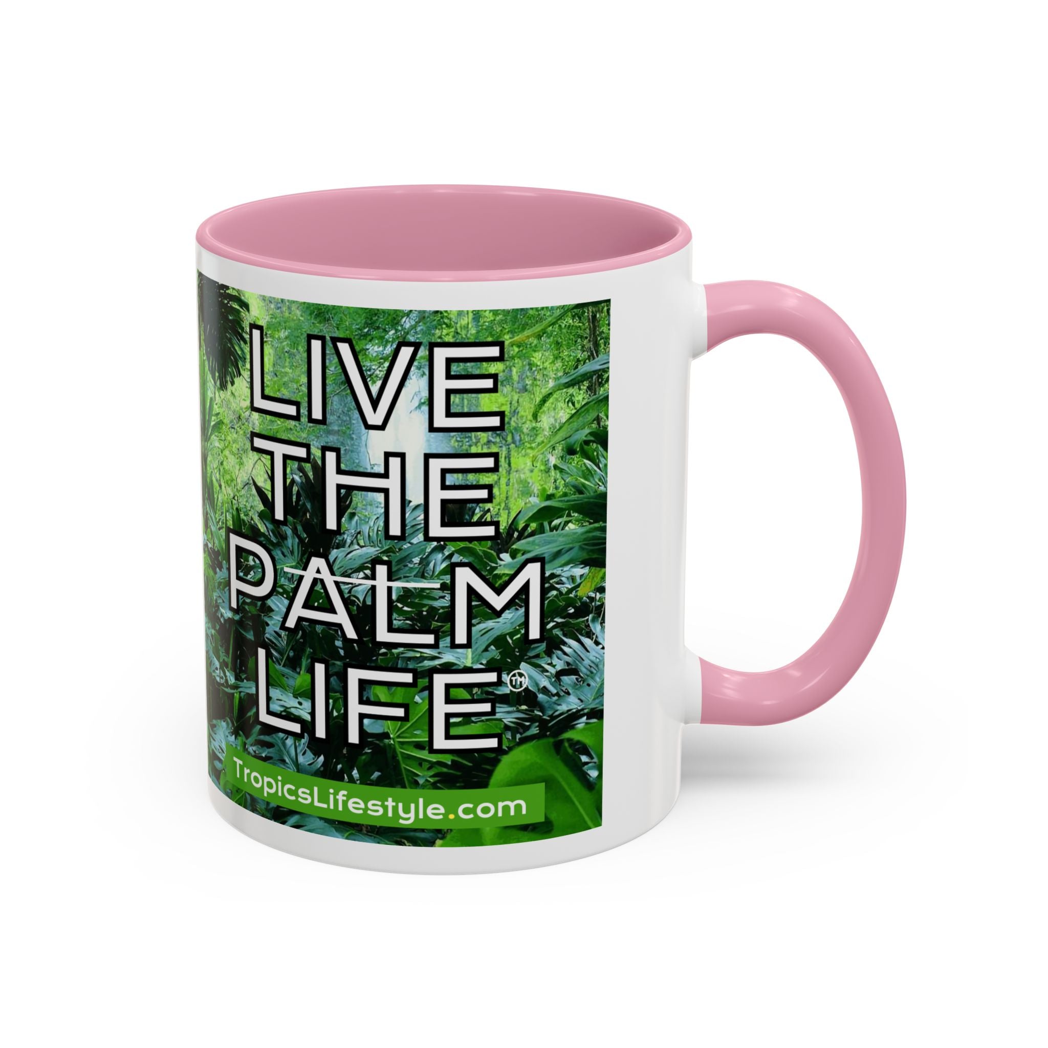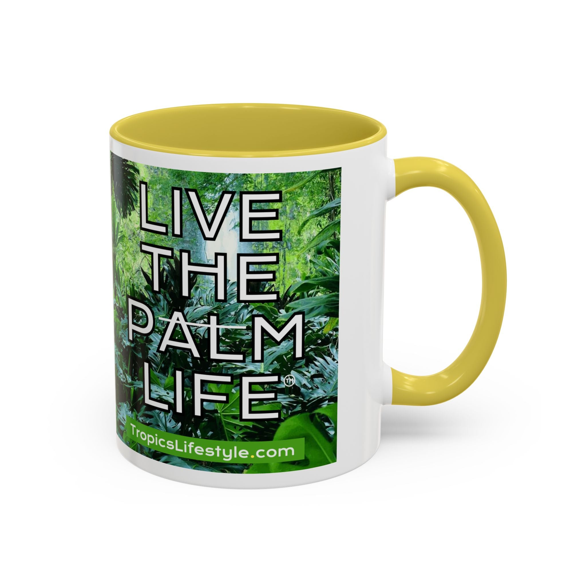 Mugs are a staple in every kitchen and when they're combined with a custom flair, they become instant favorites. Available in 12 color options, these mugs hold 11oz or 15oz of your favorite pick-me-up juice and come with a colored handle and interior. The glossy finish adds a classy touch that perfectly complements the high-fidelity artwork print. Features our original Live the Palm Life tropical design, encouraging you to relax and live in the moment every day!