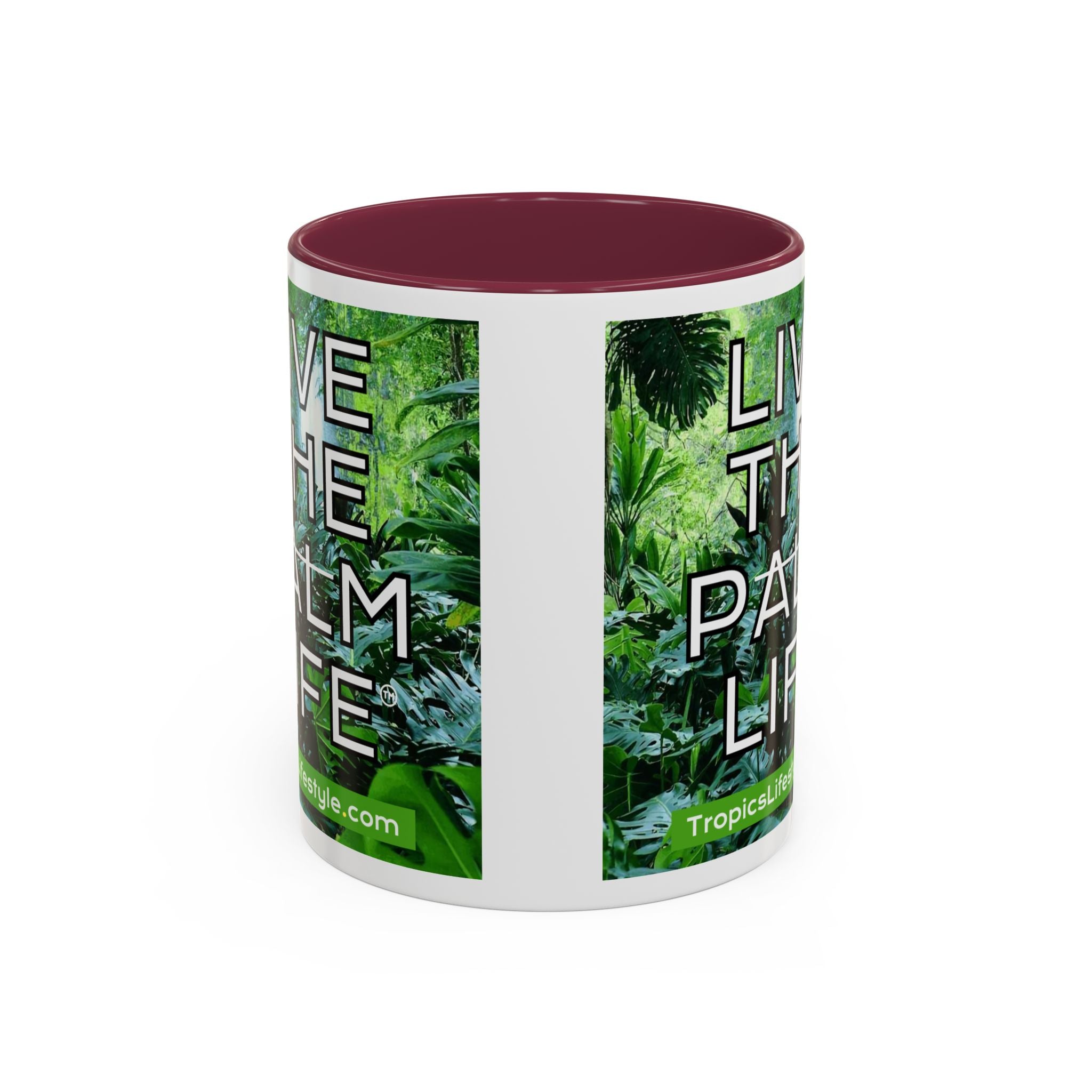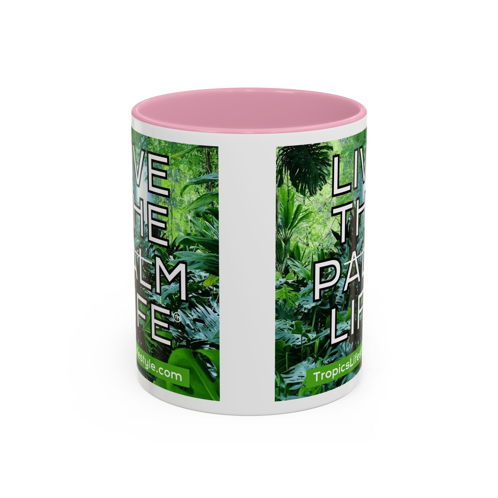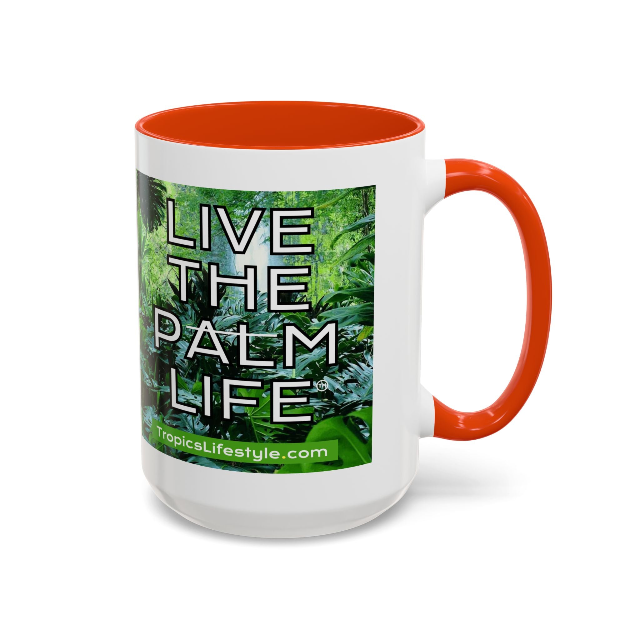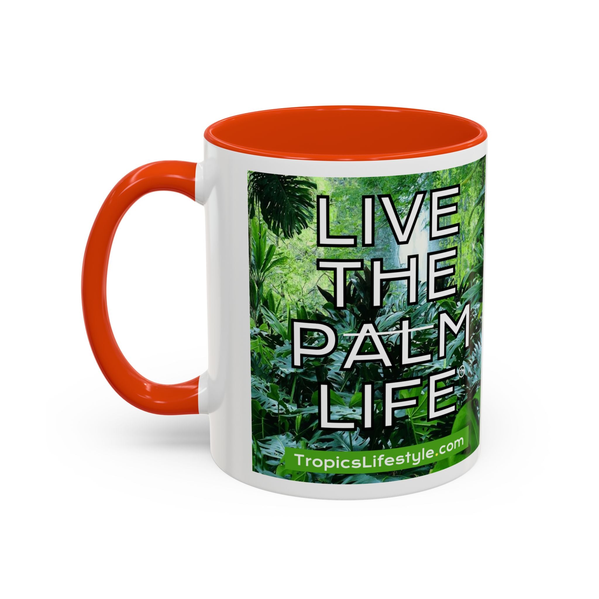 Mugs are a staple in every kitchen and when they're combined with a custom flair, they become instant favorites. Available in 12 color options, these mugs hold 11oz or 15oz of your favorite pick-me-up juice and come with a colored handle and interior. The glossy finish adds a classy touch that perfectly complements the high-fidelity artwork print. Features our original Live the Palm Life tropical design, encouraging you to relax and live in the moment every day!