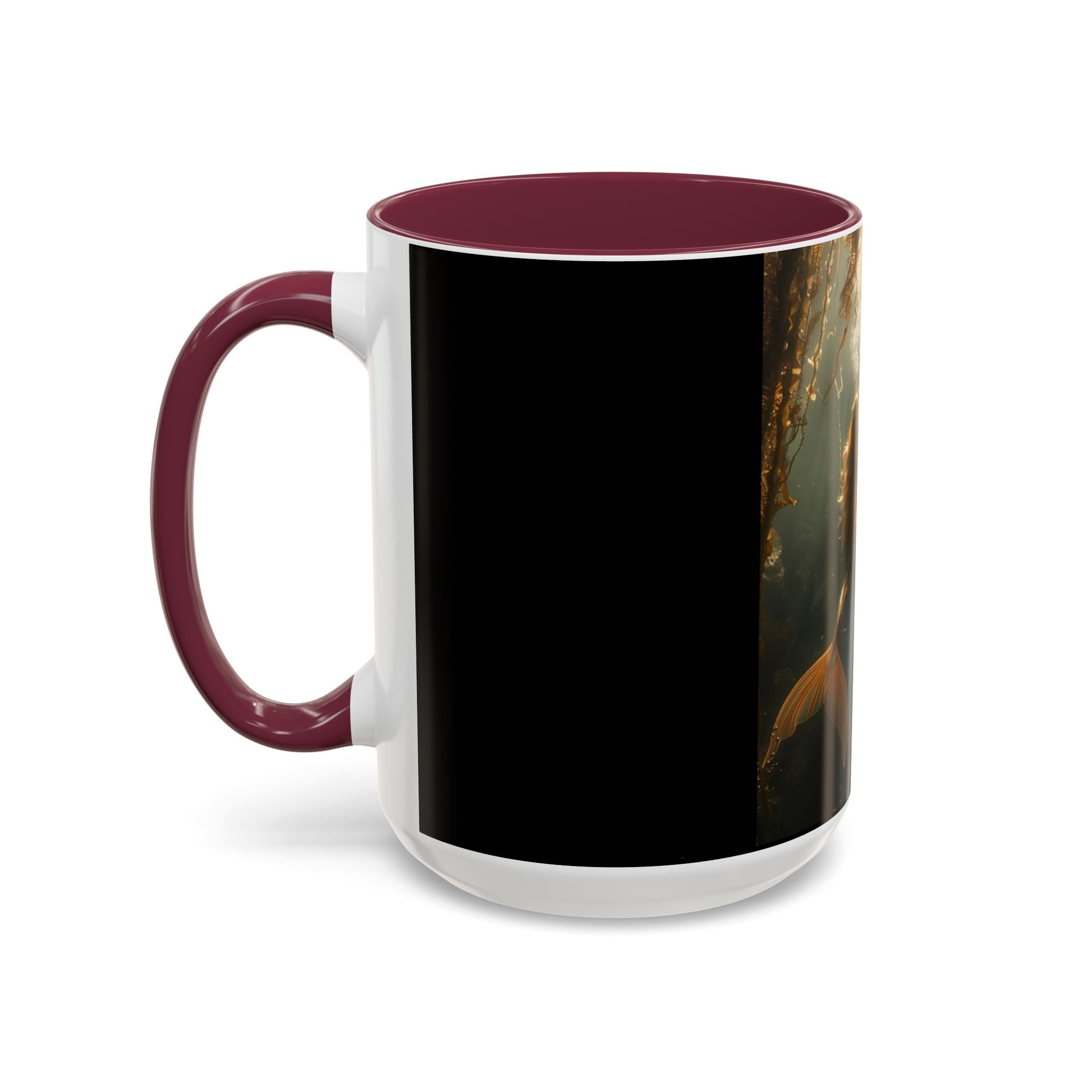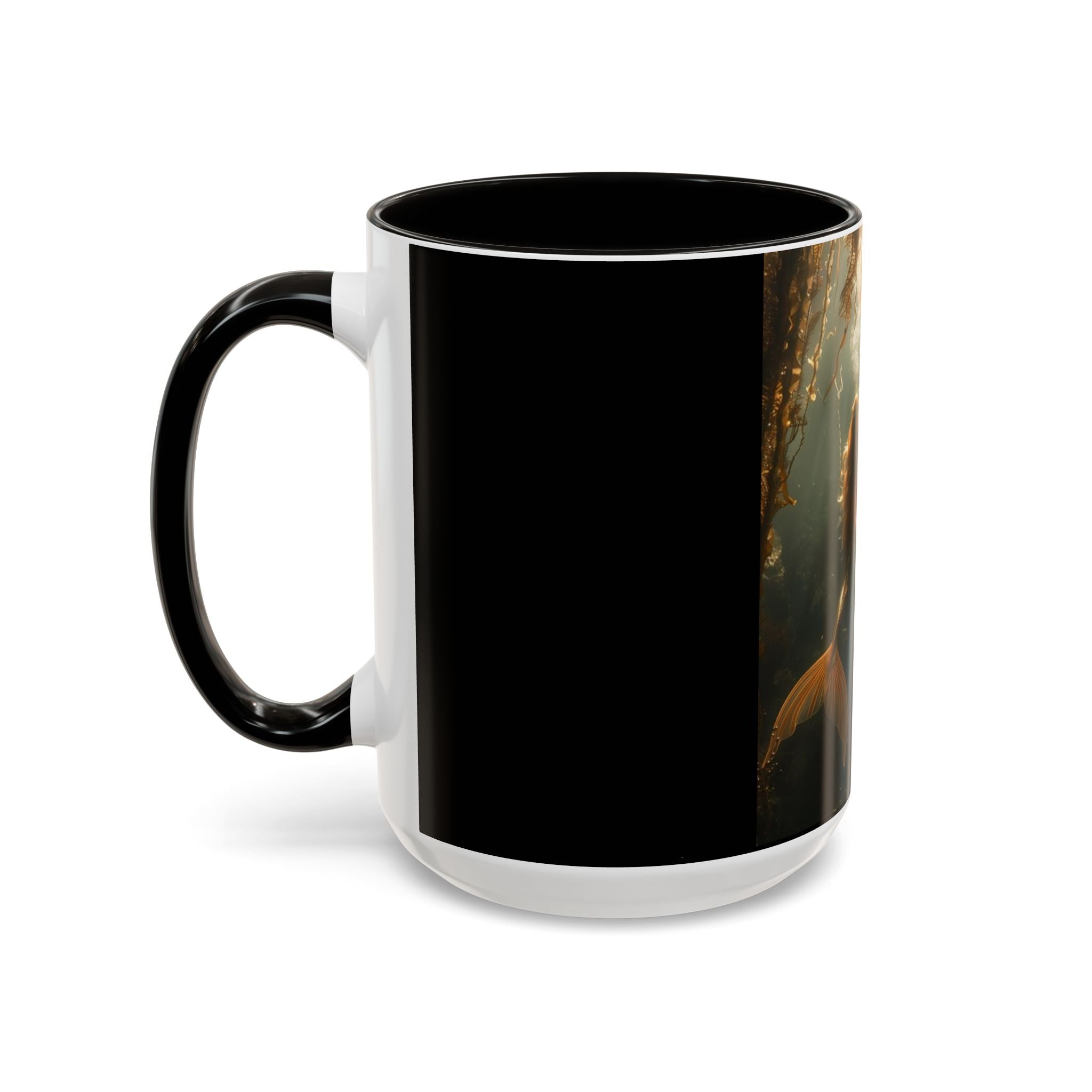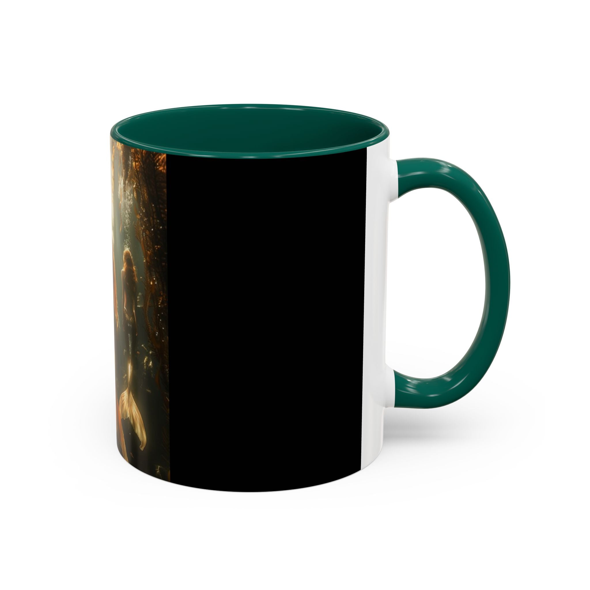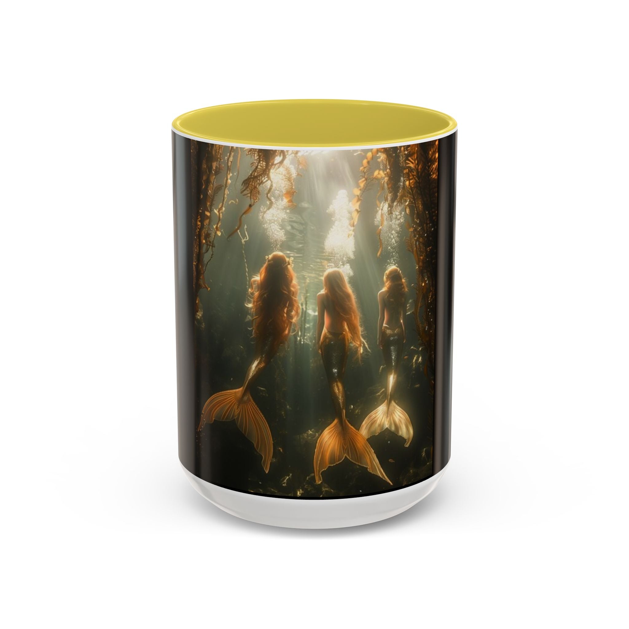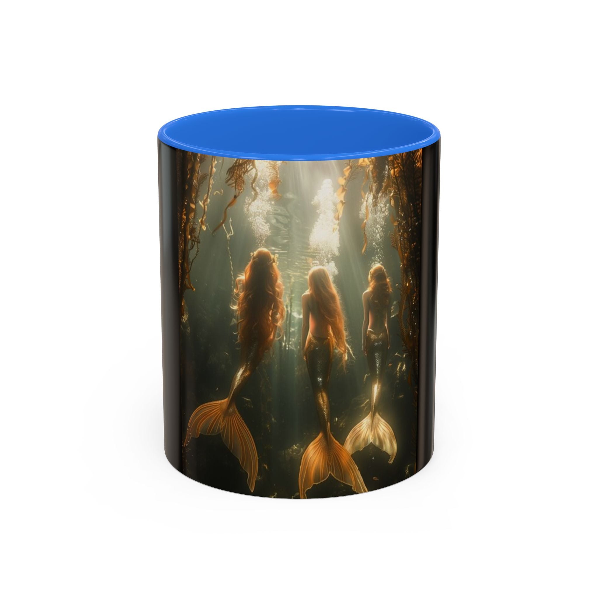 Mugs are a staple in every kitchen and when they're combined with a custom flair, they become instant favorites. Available in 12 color options, these mugs hold 11oz or 15oz of your favorite pick-me-up juice and come with a colored handle and interior. The glossy finish adds a classy touch that perfectly complements the high-fidelity artwork print. Features our original Three Mermaid Sisters timeless design, showcasing an underwater playground taking you to Paradise with them every day. Black main body.