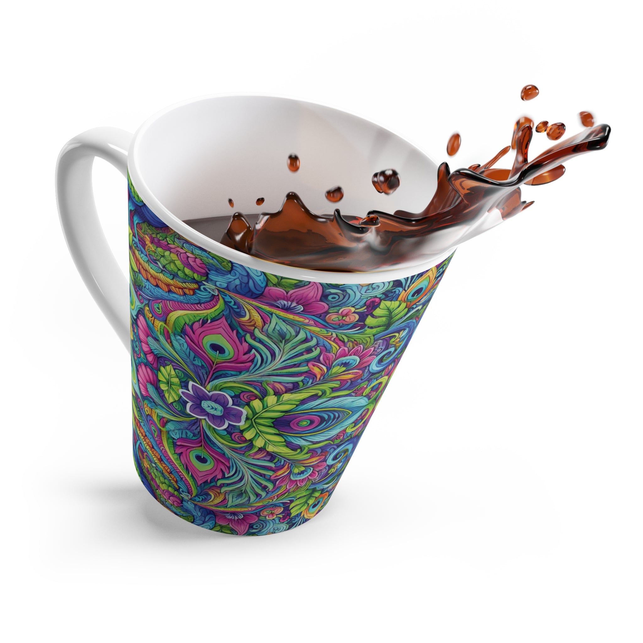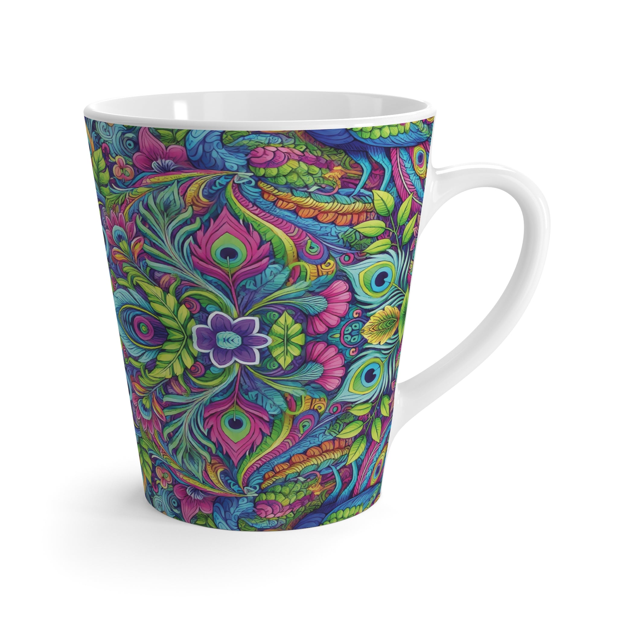 Introducing our vibrant Latte Mug, a delightful addition to your kitchenware collection. Featuring a beautiful and colorful design of peacocks in a prism pattern, this mug radiates a fresh, lively vibe that can brighten your mornings and elevate your coffee experience. Perfect for anyone who appreciates nature-inspired aesthetics, this mug is ideal for coffee lovers, tea enthusiasts, or anyone looking to enjoy their favorite beverages in style.