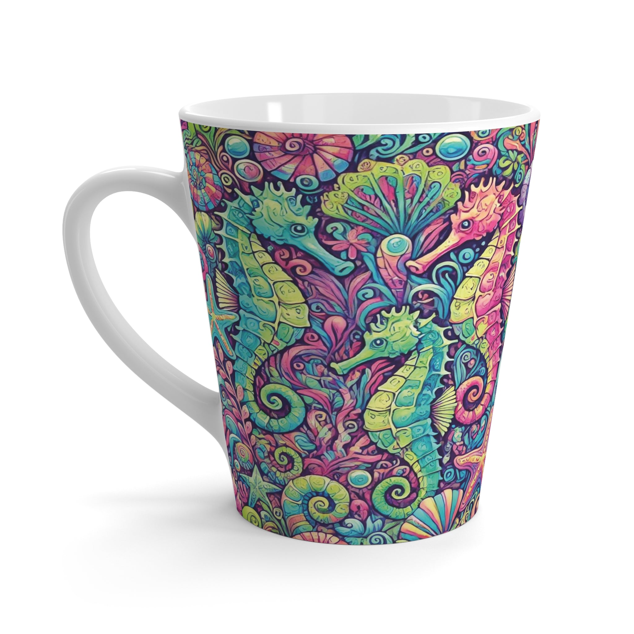 Introducing our vibrant Latte Mug, a delightful addition to your kitchenware collection. Featuring beautiful tropical seahorsese in bright  colors, this mug radiates a fresh, lively vibe that can brighten your mornings and elevate your coffee experience. Perfect for anyone who appreciates nature-inspired aesthetics, this mug is ideal for coffee lovers, tea enthusiasts, or anyone looking to enjoy their favorite beverages in style.