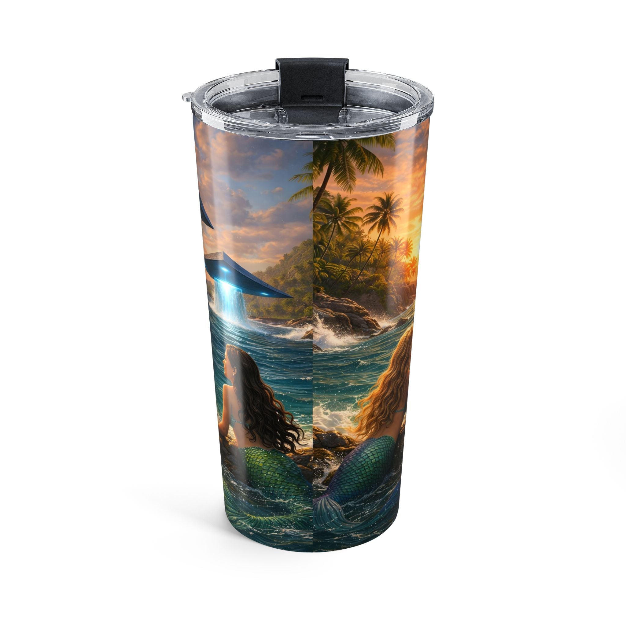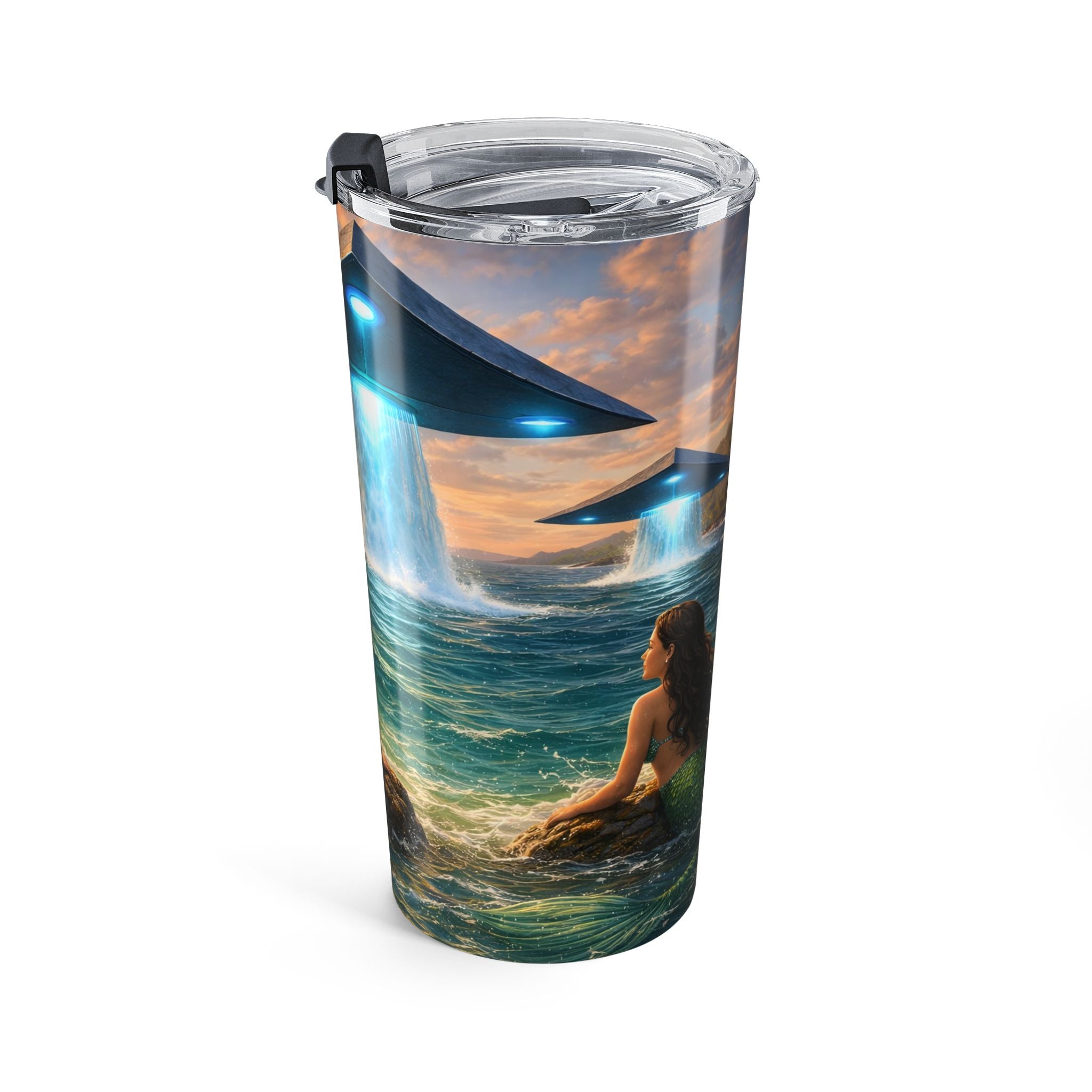 This 20 oz stainless steel tumbler wraps a vivid coastal-science-fiction scene around every sip—mermaids perched on rocky shores beneath a sunset sky as sleek, glowing UFOs hover and beam light into the waves. It feels like dusk at the edge of the world: salt air, warm light, and a small electric hum of otherworldly possibility. Use it on morning drives, late-night writing sessions, or while sketching new worlds. The glossy wraparound print keeps the artwork rich and bold, and the vacuum-insulated steel body keeps coffee and other drinks at the right temperature while you lose yourself in the story on the cup.