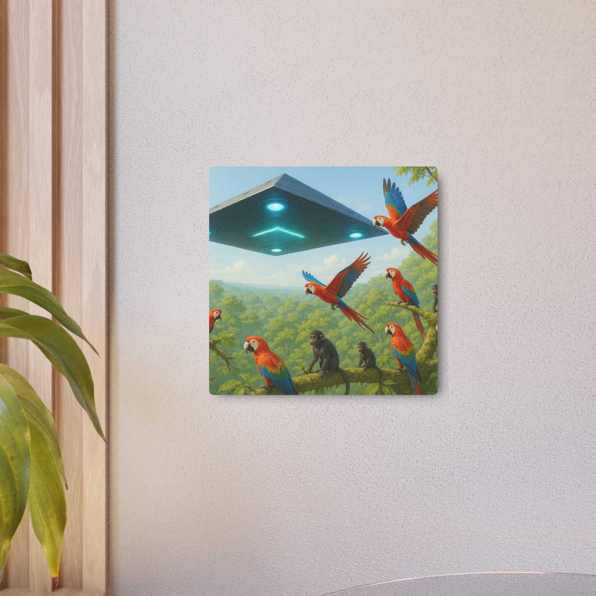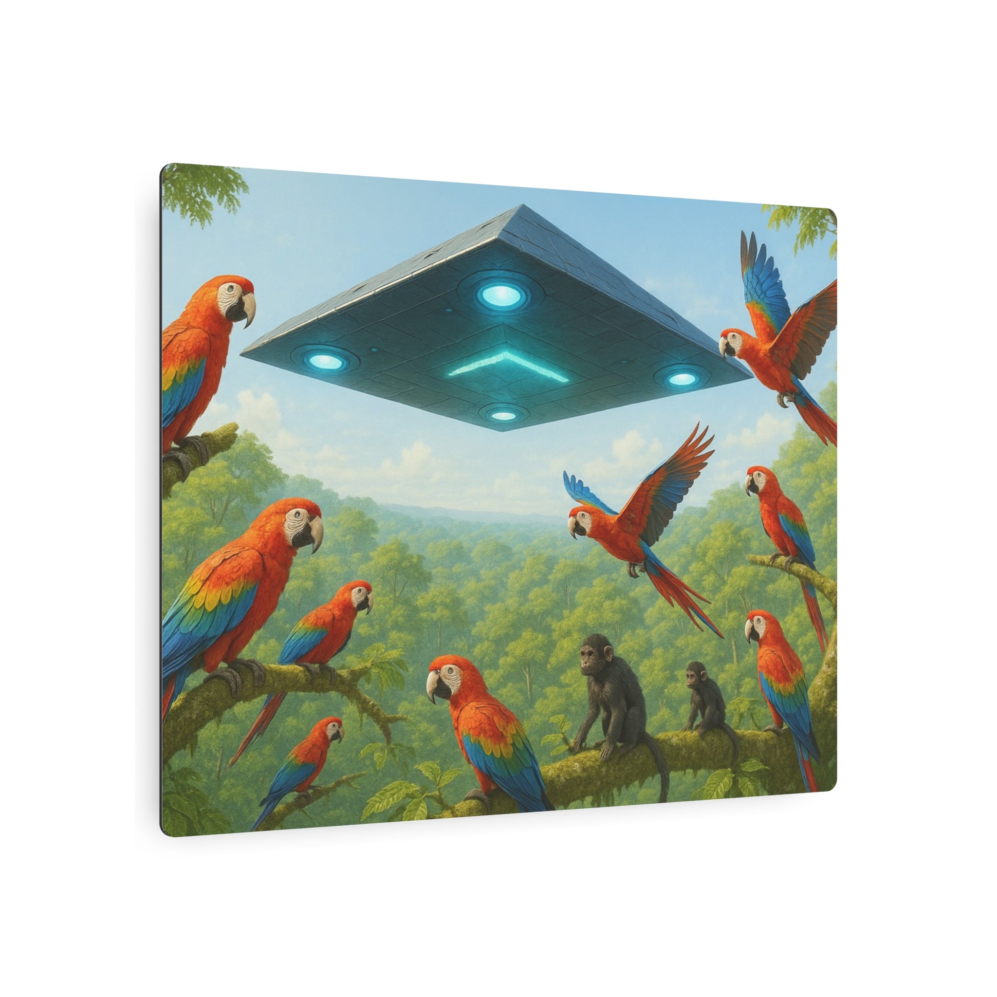 A vibrant metal art sign that brings a surreal jungle scene into your home. Vivid macaws wheel through sunlit canopy while a sleek, hovering craft casts cool light over curious primates below. The matte finish keeps colors rich without glare, and the thin aluminum panel hangs flat and light on your wall. This piece works as a conversation-starting accent in a living room, a creative studio, or a playful nursery — any space that welcomes color, imagination, and a touch of the uncanny.