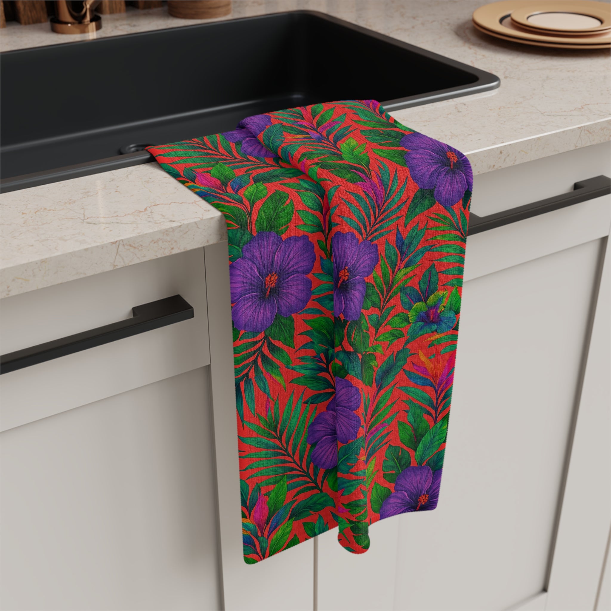 A lush, tropical tea towel that brings a quiet slice of rainforest into the kitchen. Soft, quick-drying microfiber shows off a repeating pattern of lovely rainforest purple flowers and layered green foliage — bright accents against deep verdant leaves. Lightweight and absorbent, it slips into a crowded sink-side routine and dries fast after use. Use it to wipe down counters, line a bread basket, or add a botanical splash to morning coffee rituals. The sewn hem and one-sided print keep the design crisp wash after wash, and the compact 16" × 25" size tucks easily into drawers or hangs from a hook to liven any small space.