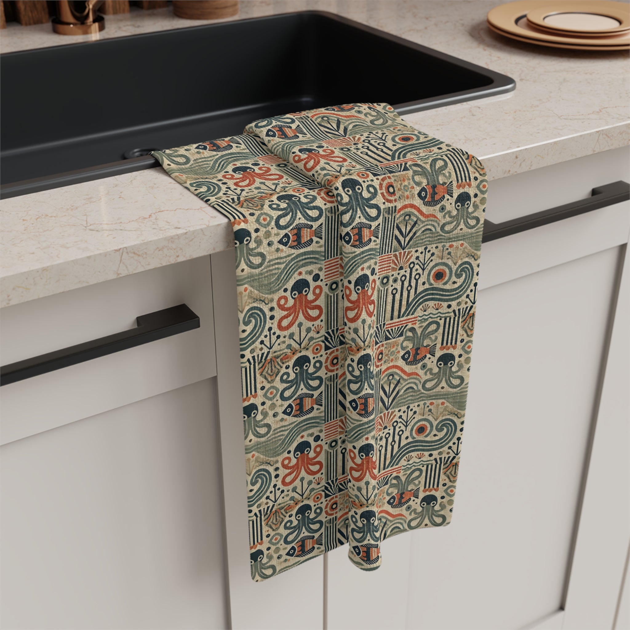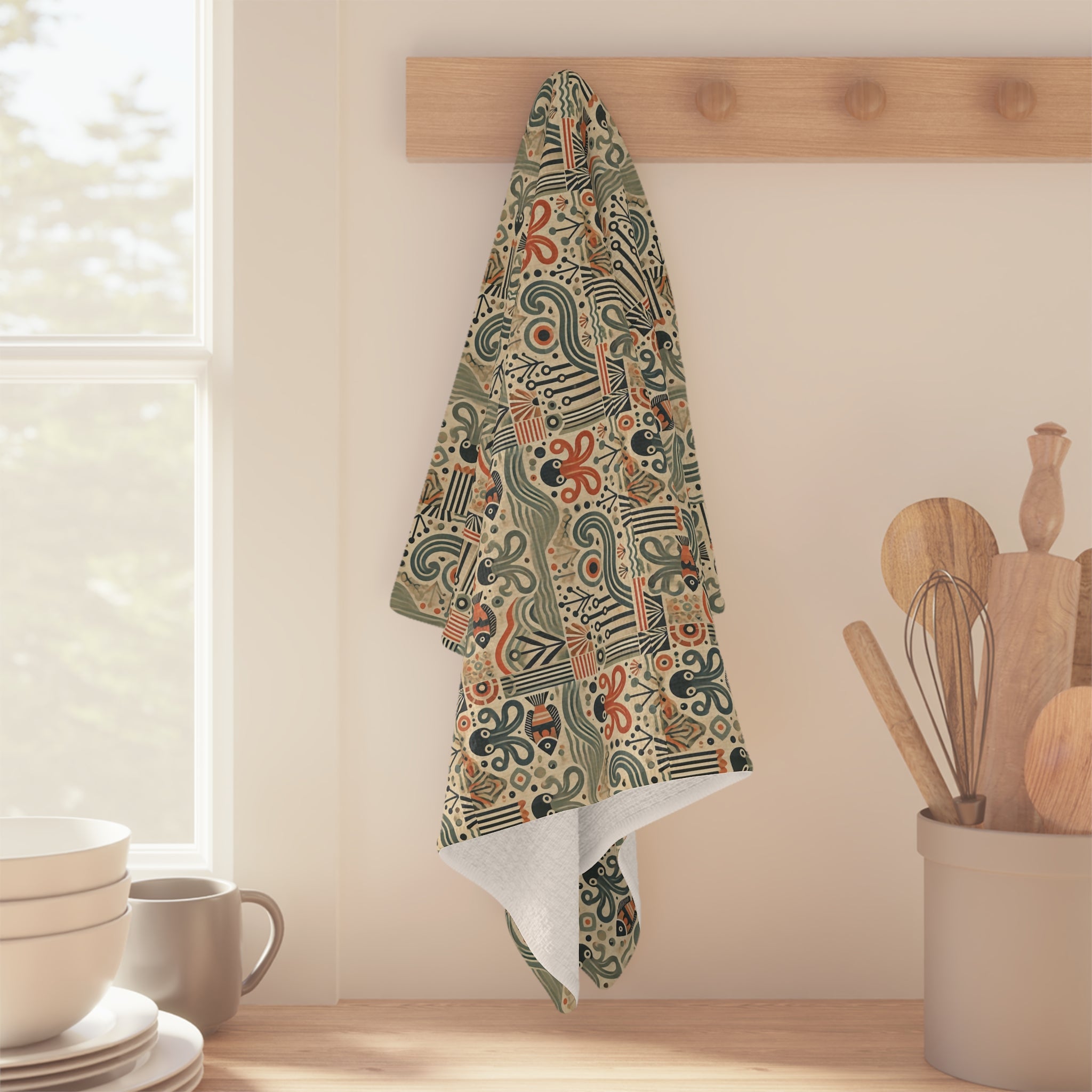 Soft, quick-drying microfiber with a quiet, vintage-inspired tile print that brings warmth to everyday kitchen moments. The towel’s muted sage, terracotta, and cream pattern reads like hand-stamped ceramic — familiar and comforting without shouting. Lightweight and highly absorbent, it slips into a busy cook’s rhythm: wiping counter spills, polishing glassware, or lining a bread basket. With neatly hemmed edges and a one-sided print, it holds up to frequent use while keeping the design front and center. This towel fits a home where slow mornings, fragrant tea, and well-loved dishes matter. It layers easily with woven linens or rustic ceramics for a cohesive, lived-in table setting during brunches, casual dinners, or quiet weekday rituals.