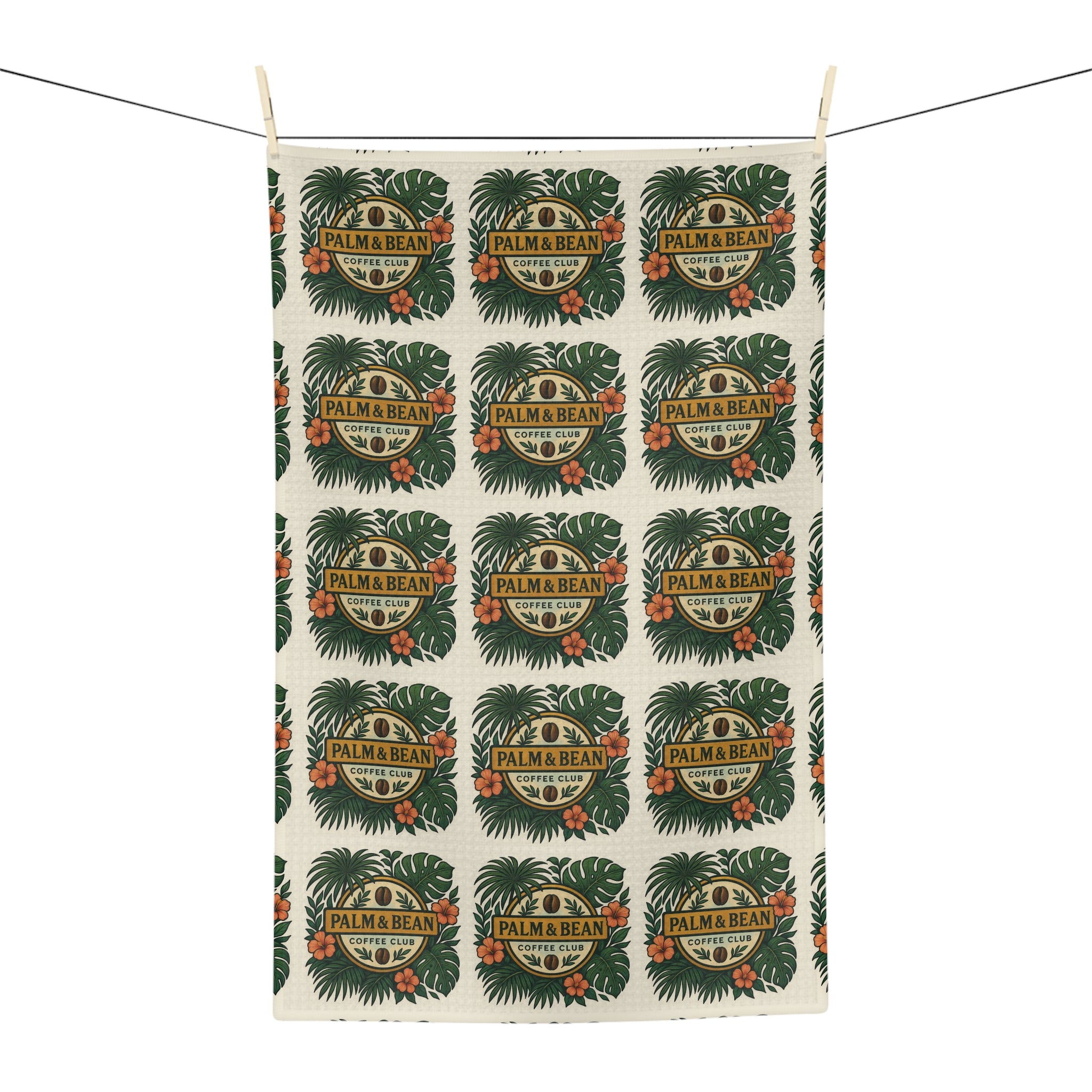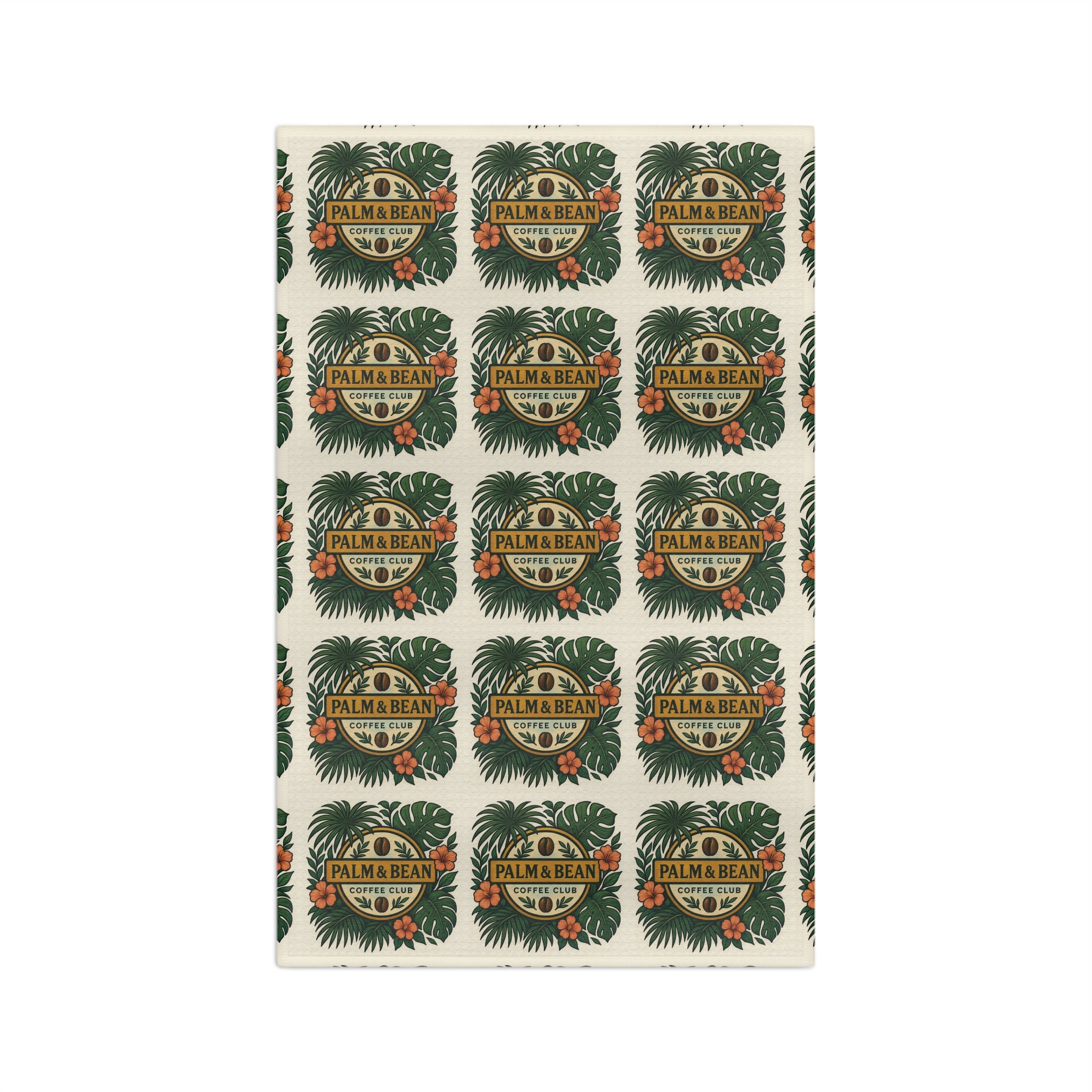 Lush, sun-warmed mornings meet practical kitchen use with this microfiber tea towel. The repeated vintage tropical logo sits against a warm cream backdrop, bringing slow-coffee, island-market energy to dish duty and countertop moments. Lightweight but highly absorbent, the towel moves easily from drying delicate glassware to wiping up citrus-splashed counters. Its hemmed edges and sewn-in care label promise dependable wear, while the single-sided print keeps the design crisp and bright where it matters. Tuck it over a handle, hang it from a hook, or fold it into a picnic basket — it carries a small, cheerful reminder of leafy palms, ripe fruit, and relaxed mornings.