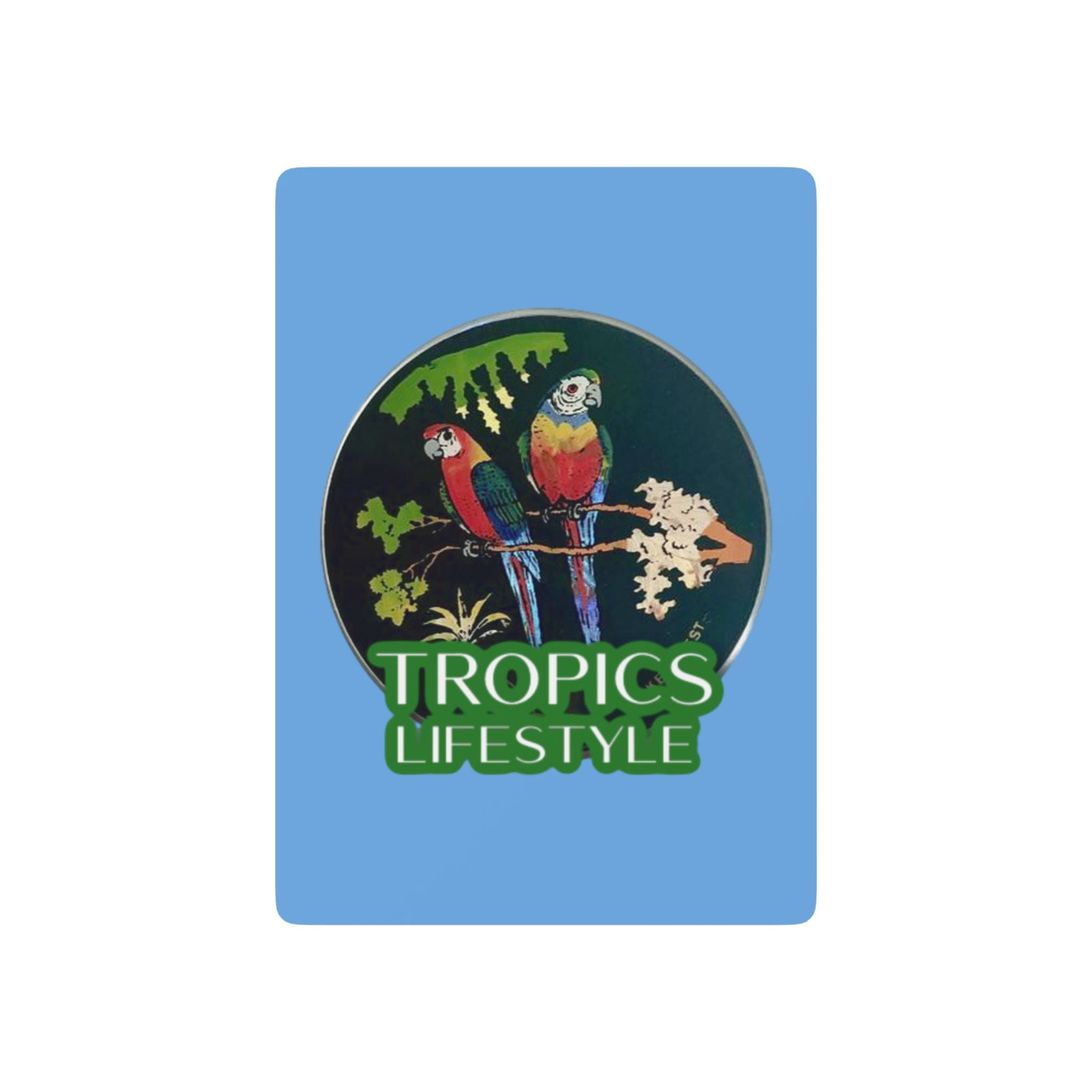 Here's a standard deck of playing cards to add tropical vibes to any card game! Each set of these Poker-sized cards, consists of four suits: hearts, diamonds, clubs and spaces. Made with smooth, 300gsm premium card stock that’s perfect for dealing and shuffling. Card Dimensions: 2.5" x 3.5"; a total of 52 playing cards with 2 Joker cards. Our exclusive, original Two Brazilian Parrots, light blue, tropical design gives off vacay vibes. Made with photo of vintage, aluminum wall plate encased in glass, created using real butterfly wings and reverse painting techniques by Brazilian crafts people. It brings so much more entertainment to the table, making this deck truly functional art.