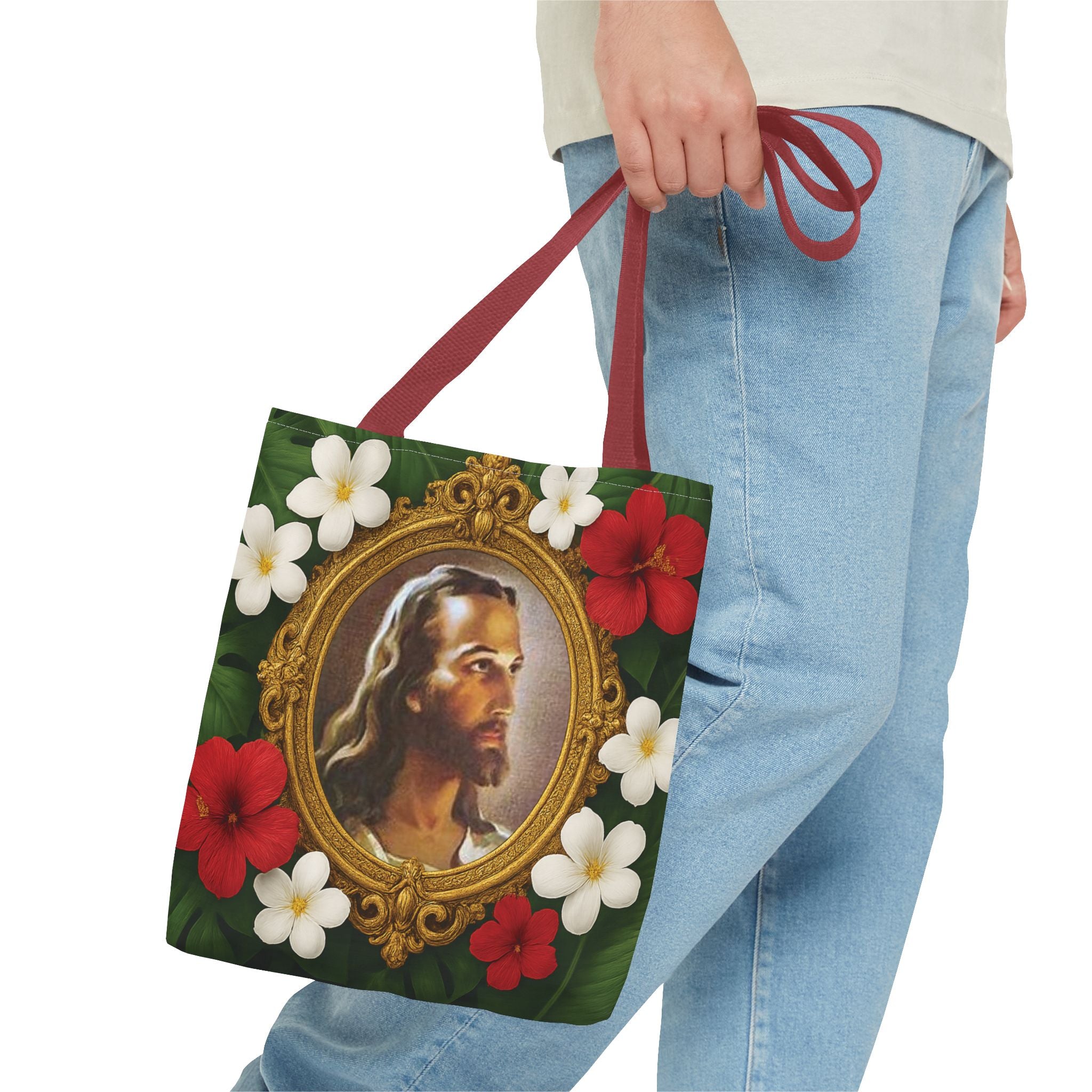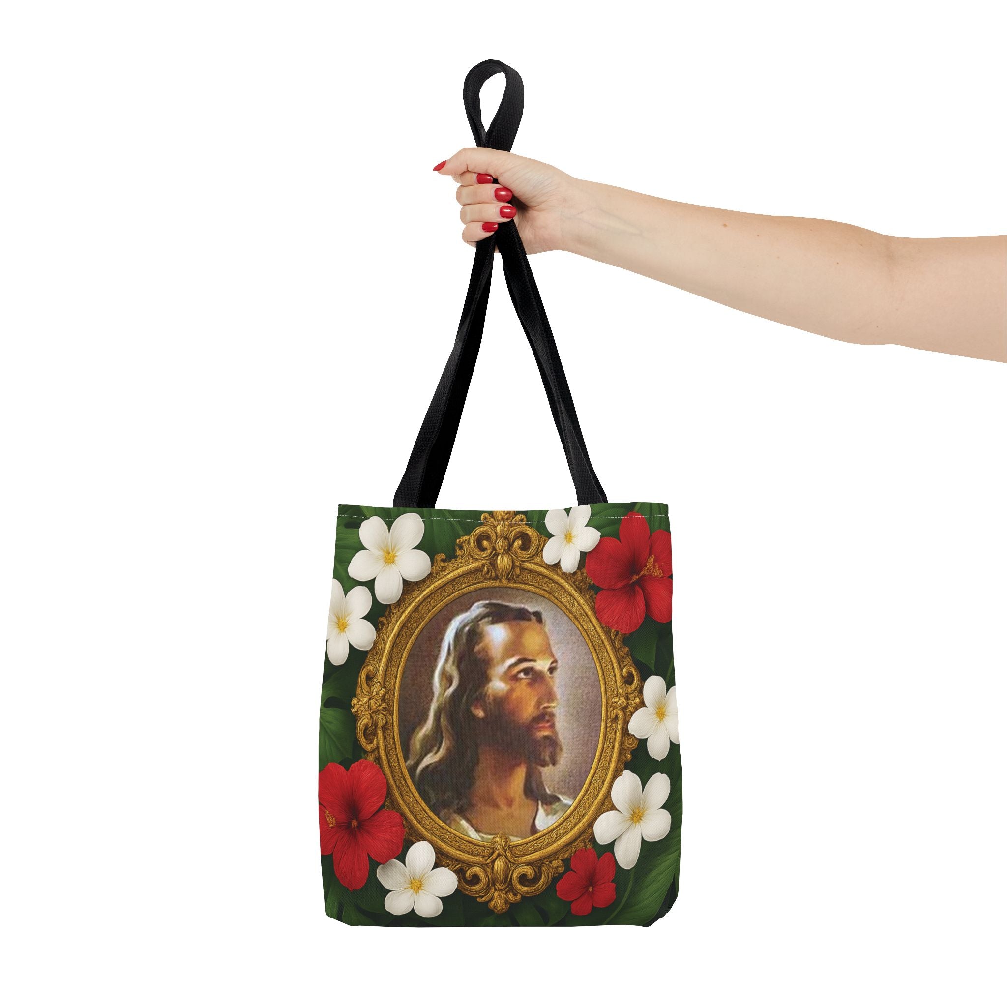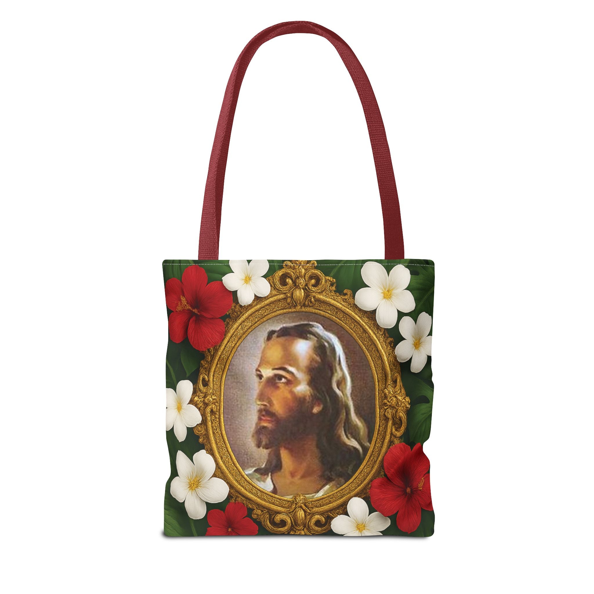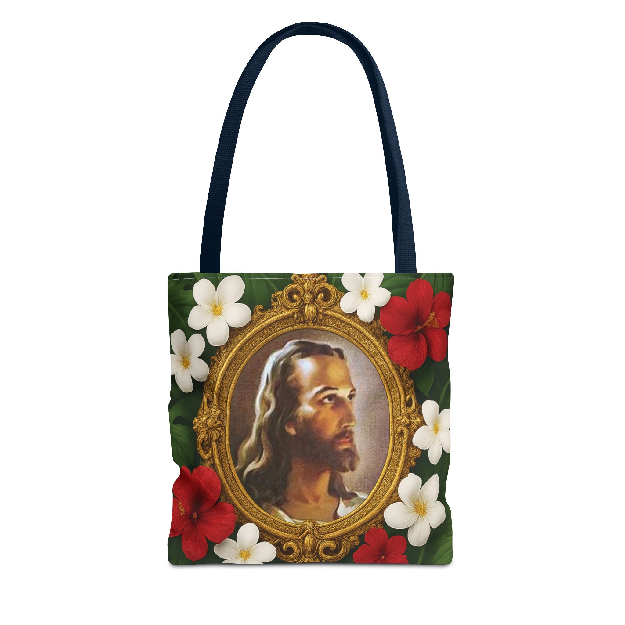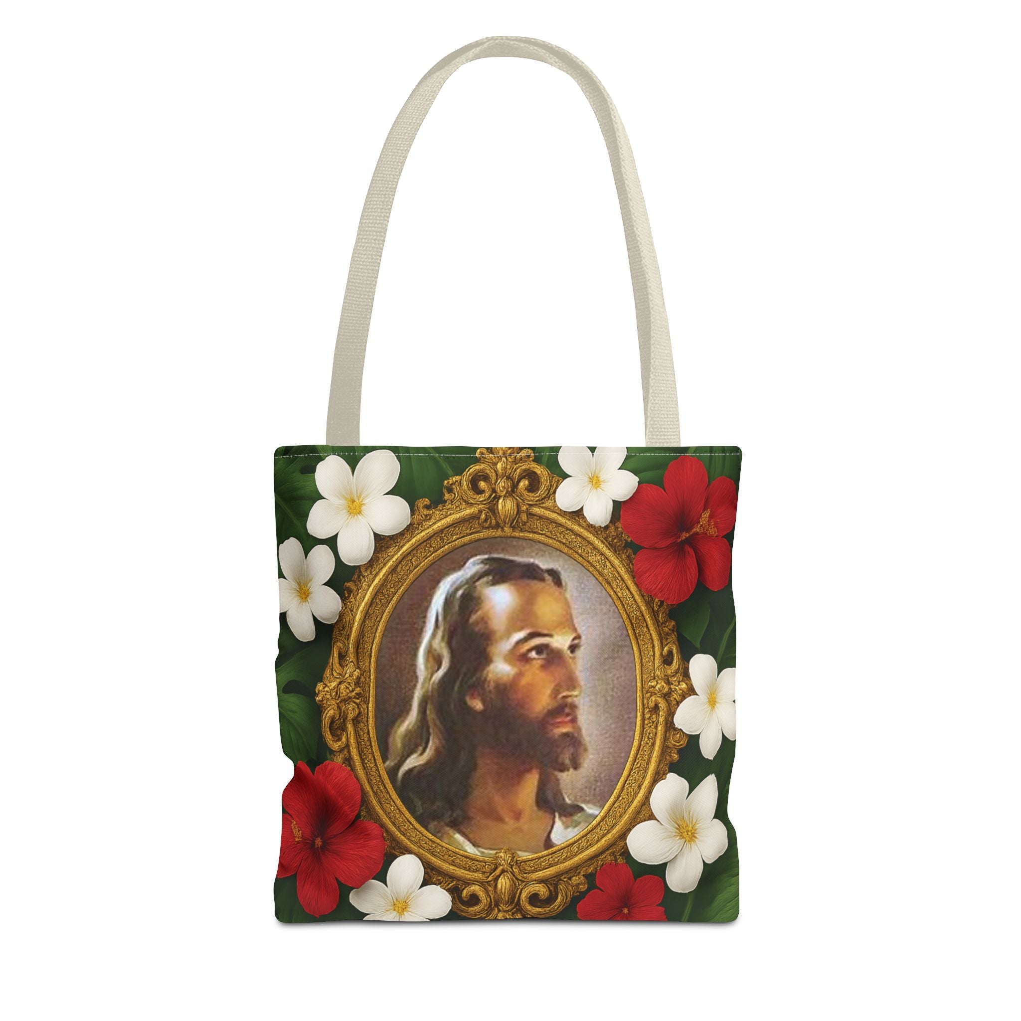 Introducing this vibrant Tote Bag, perfect for expressing your faith and unique style while staying practical. We took the classic "Head of Christ" 1940 portrait painting of Jesus by Warner Sallman, and gave it an update for tropical decor decorators by adding an ornate gold frame surrounded by lush rainforest leaves and tropical flowers. This beautiful bag is your ideal companion for city strolls, beach days, or shopping trips. It offers both functionality and flair. It’s a great gift for birthdays, holidays, or any celebration where you want to impress loved ones with a thoughtful, stylish choice. Elevate your everyday adventures with this indispensable accessory, perfect for those who appreciate both aesthetics and sustainability.