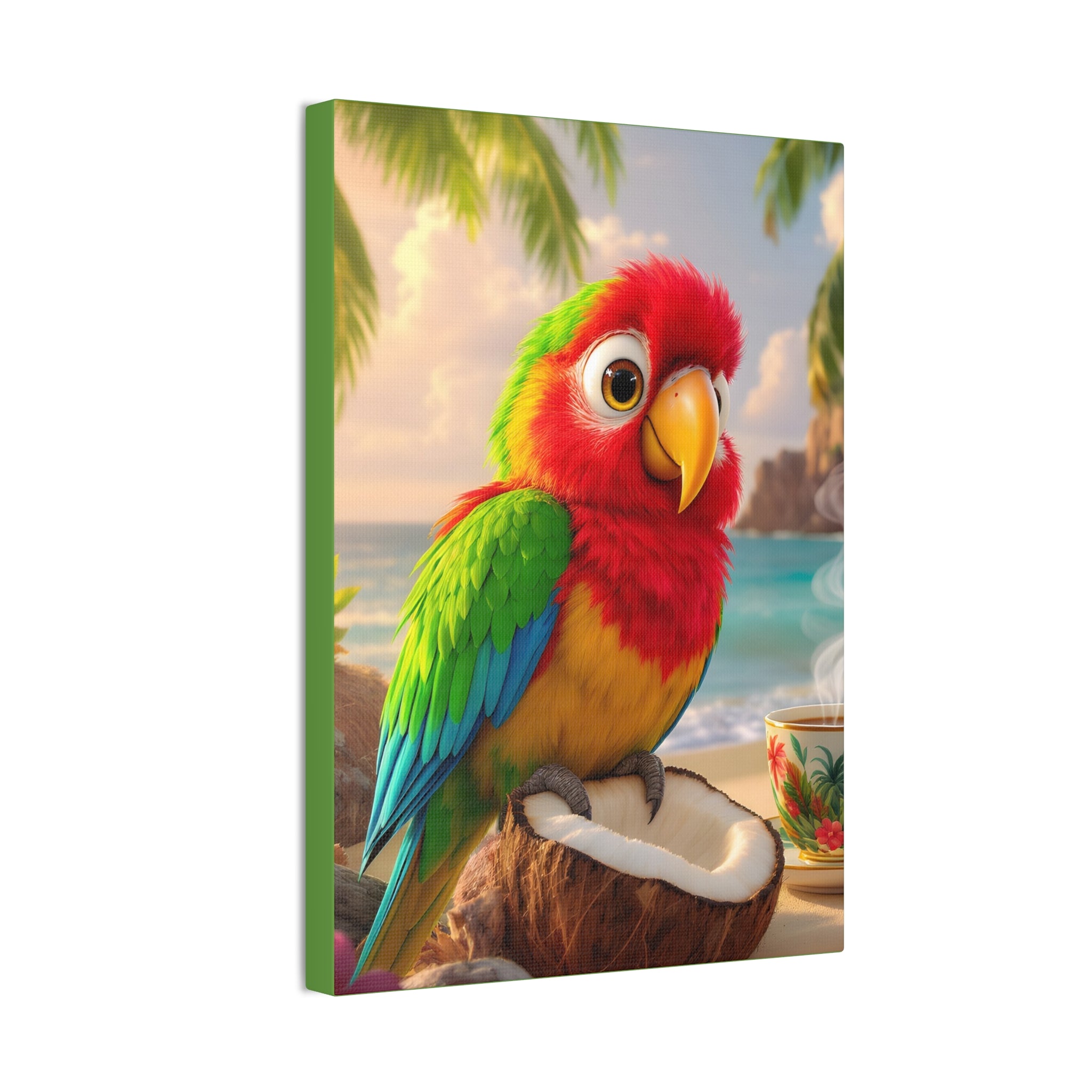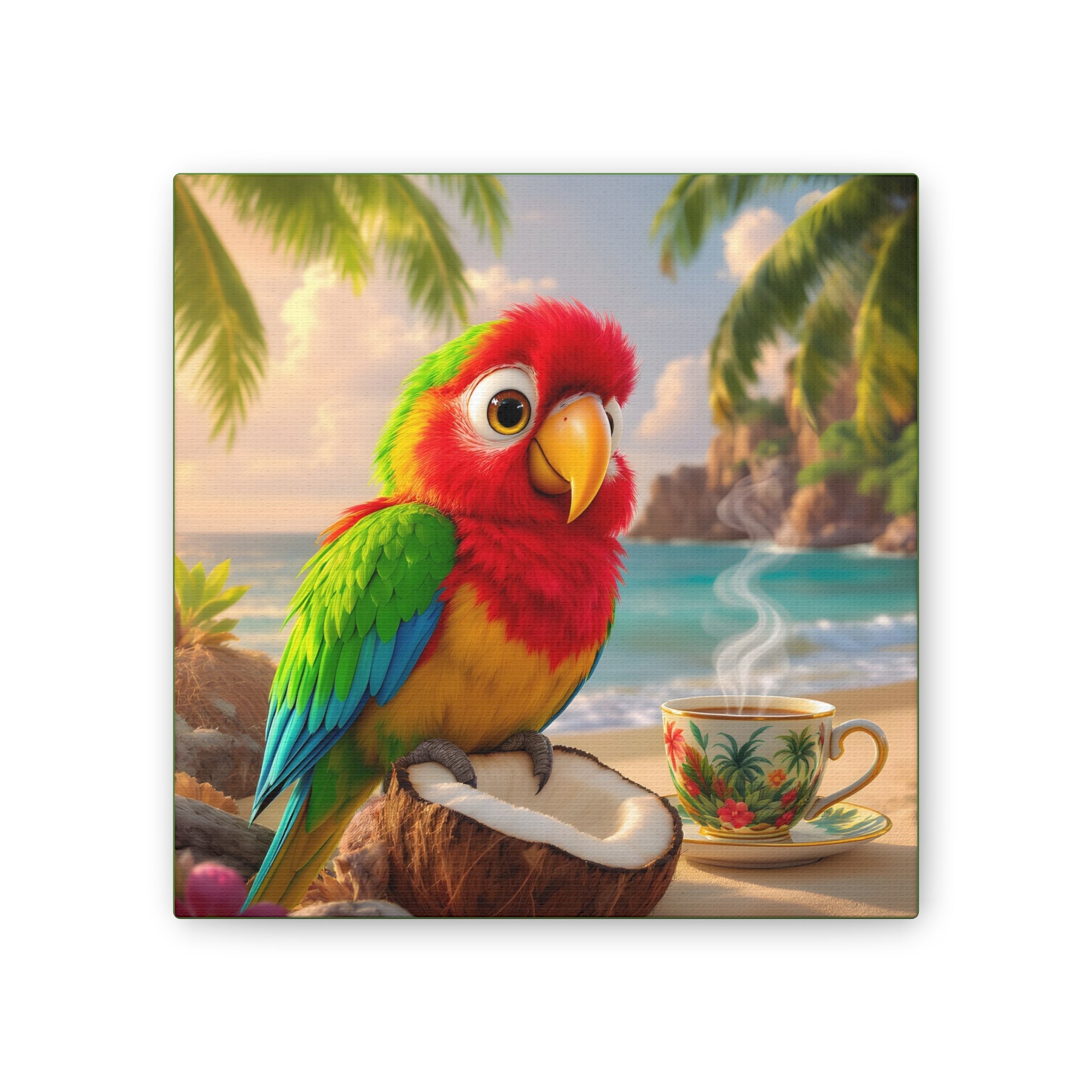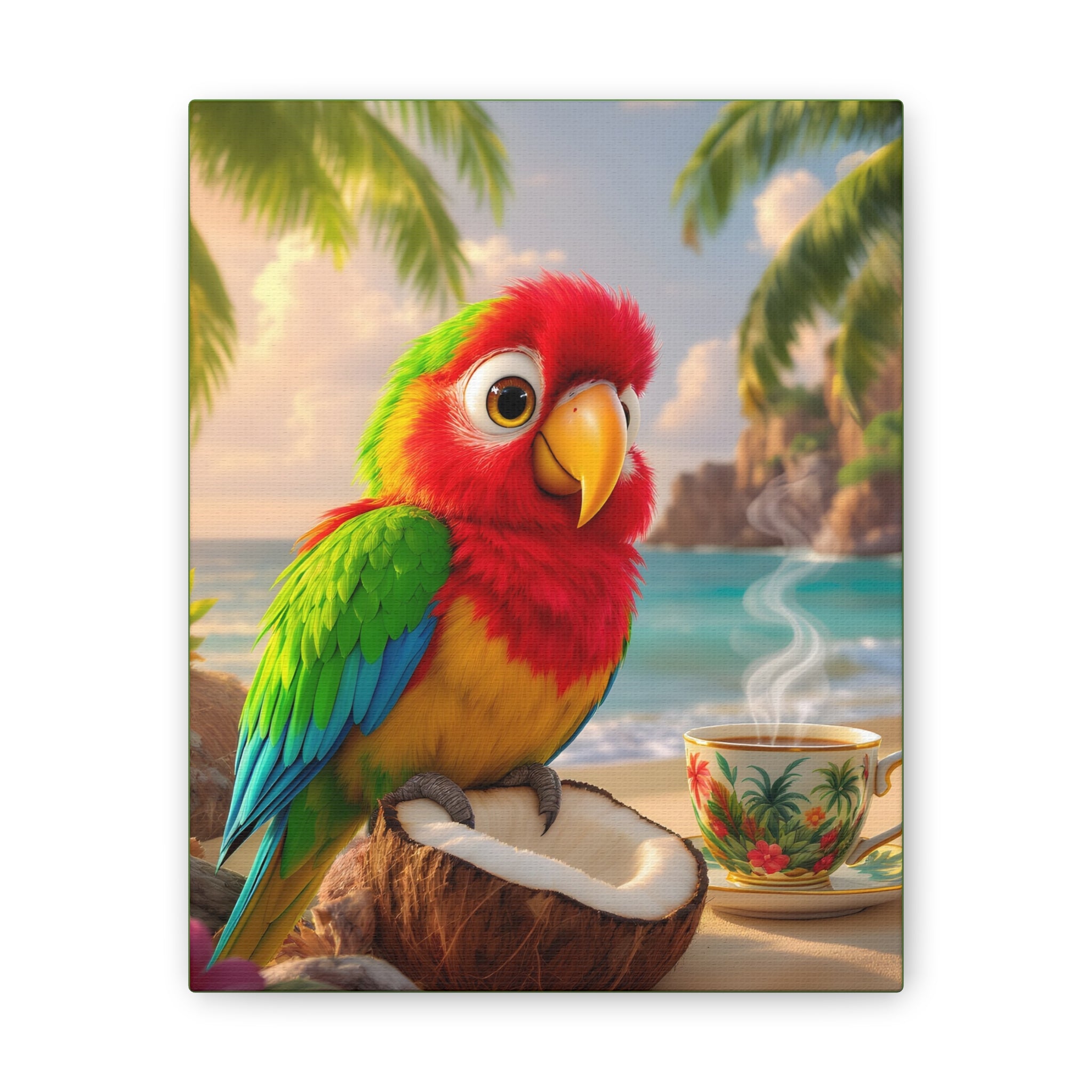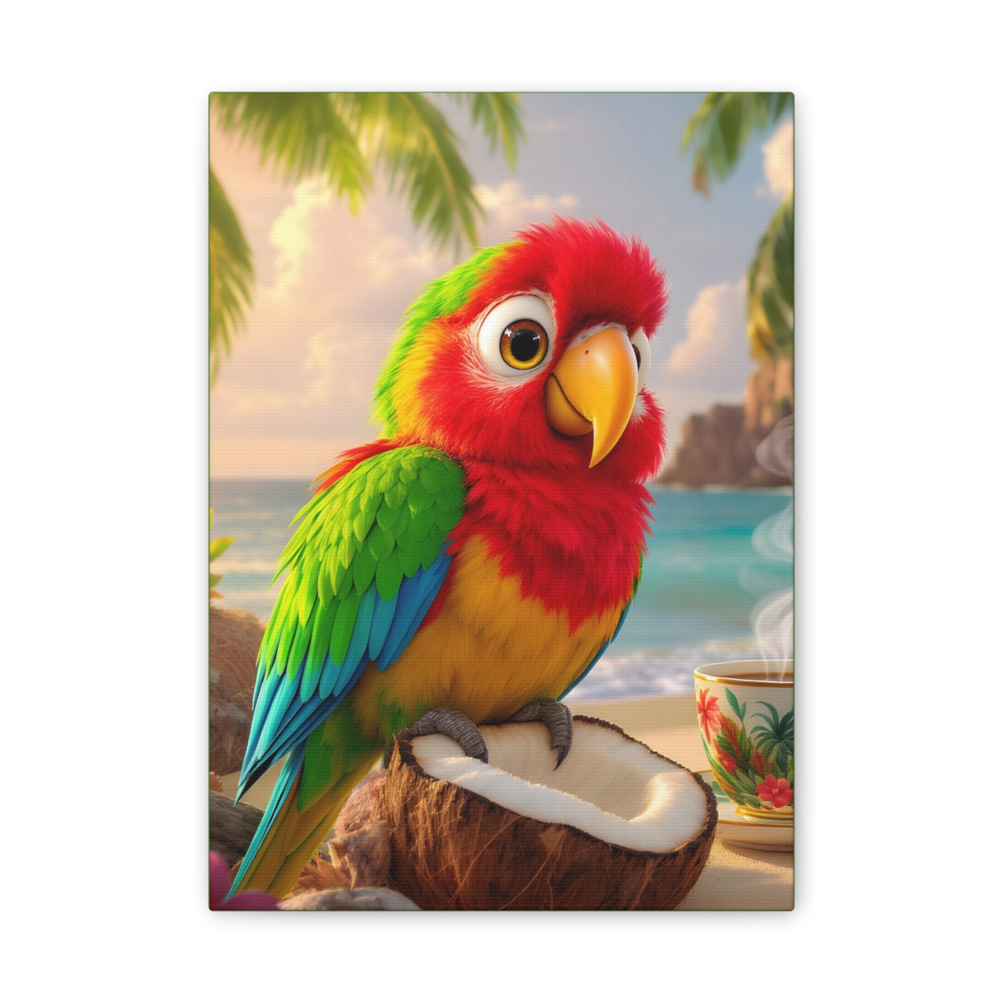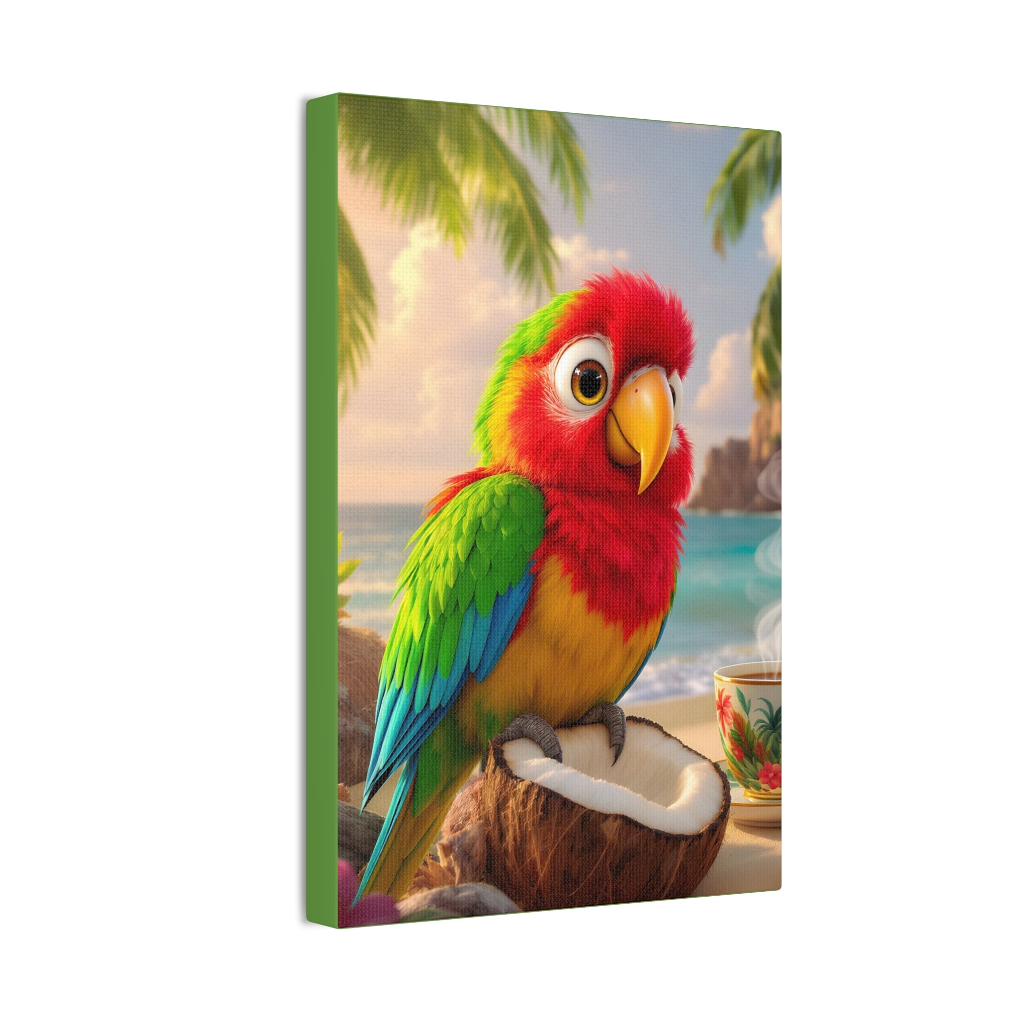 Bring a splash of tropical warmth to your walls with this vibrant stretched canvas, green sides. A cheerful parrot, Tiki, perches on a coconut against a sunlit beach and a steaming cup, rendered in bright, saturated inks that pop from every angle. The 0.75" pinewood stretcher gives the piece a clean, gallery-ready profile that hangs easily and adds instant color to a living room, kitchen, nursery, or vacation home. Light catches the textured polyester surface, accentuating the painterly details and palm-fringed horizon — it feels like a small, daily escape to the shore.