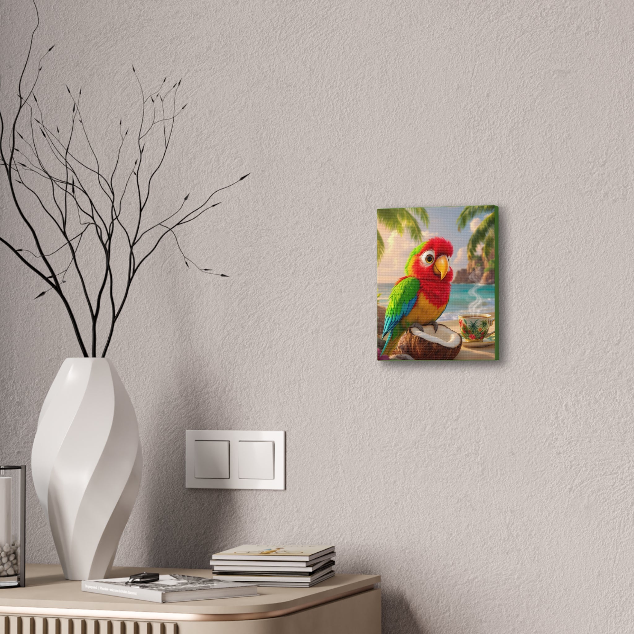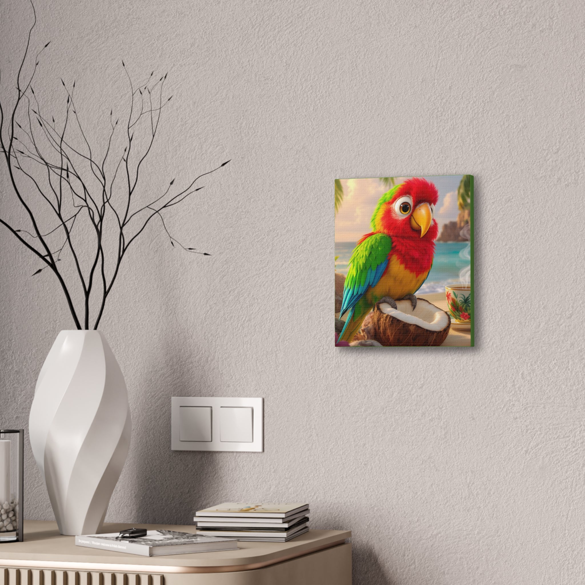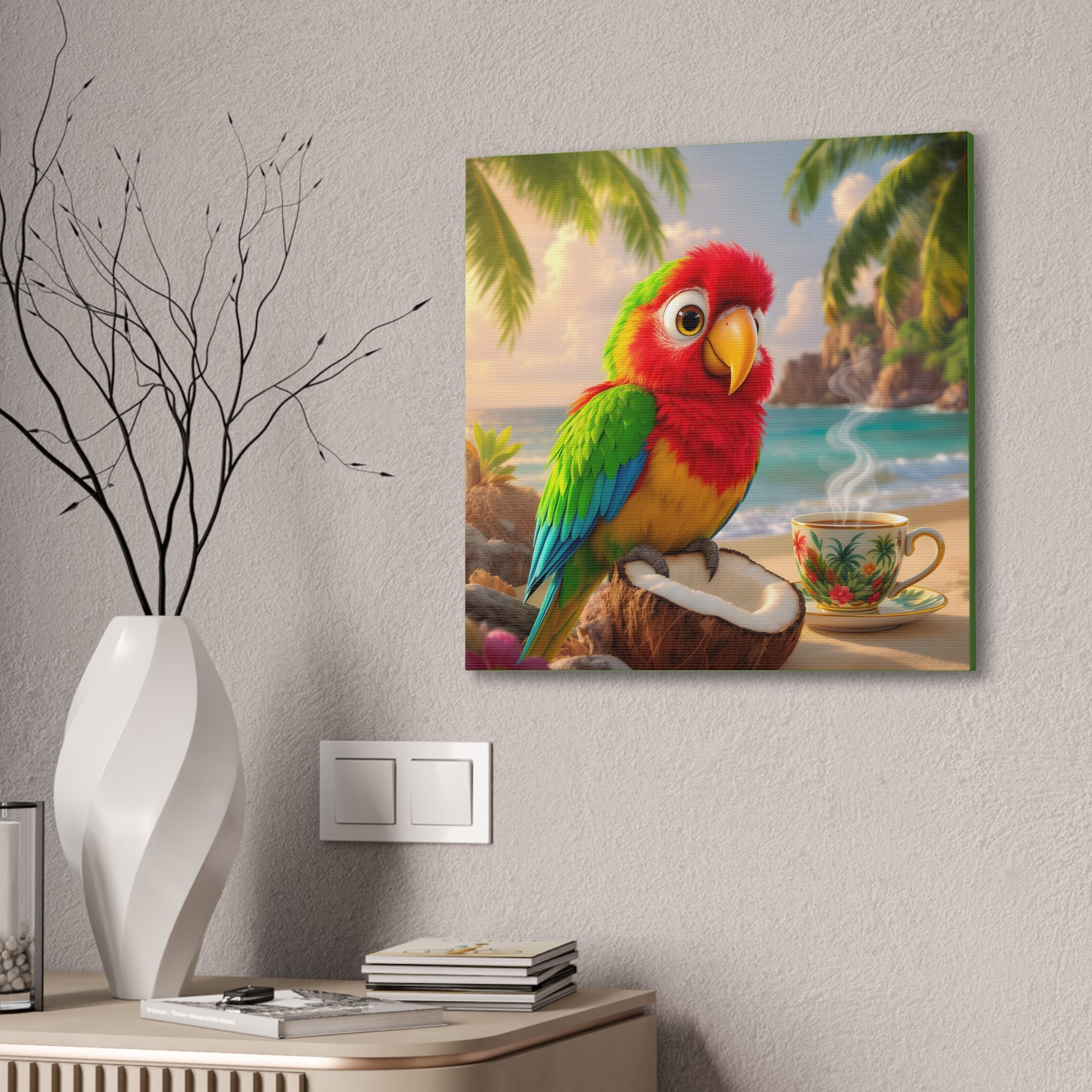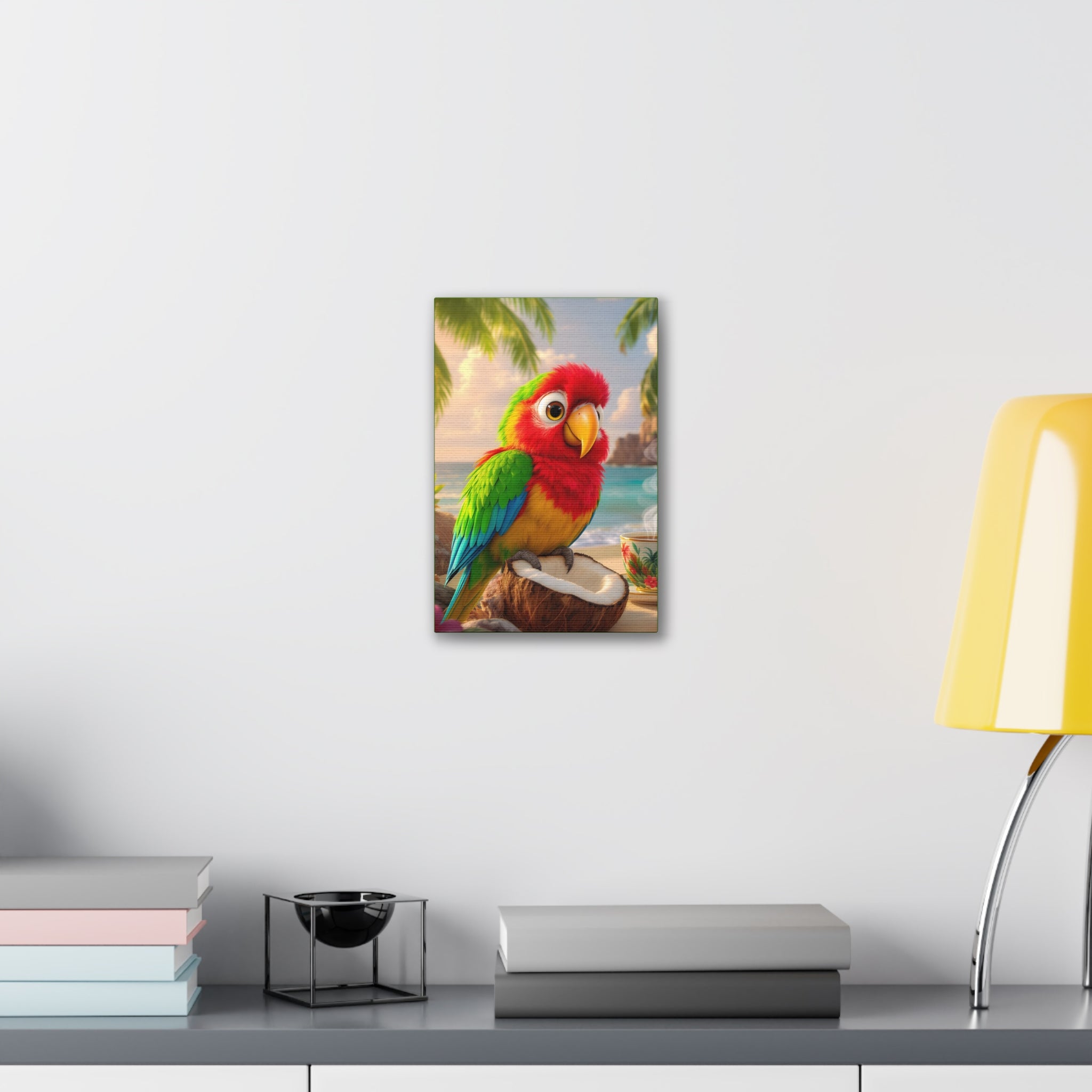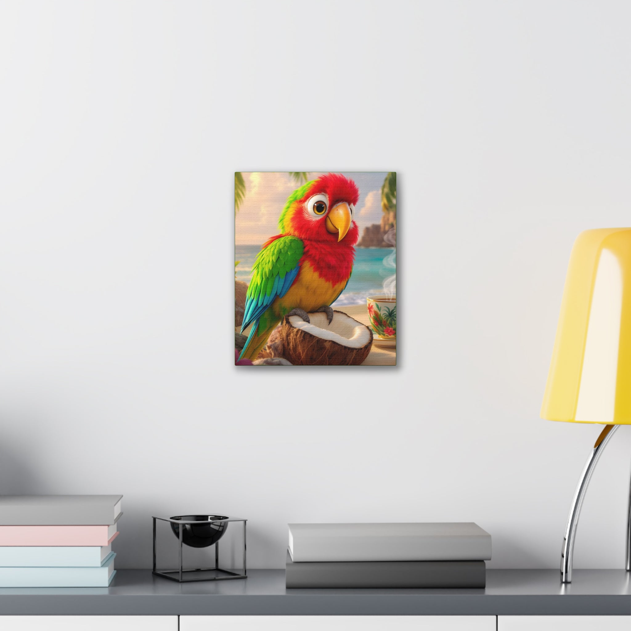 Bring a splash of tropical warmth to your walls with this vibrant stretched canvas, green sides. A cheerful parrot, Tiki, perches on a coconut against a sunlit beach and a steaming cup, rendered in bright, saturated inks that pop from every angle. The 0.75" pinewood stretcher gives the piece a clean, gallery-ready profile that hangs easily and adds instant color to a living room, kitchen, nursery, or vacation home. Light catches the textured polyester surface, accentuating the painterly details and palm-fringed horizon — it feels like a small, daily escape to the shore.