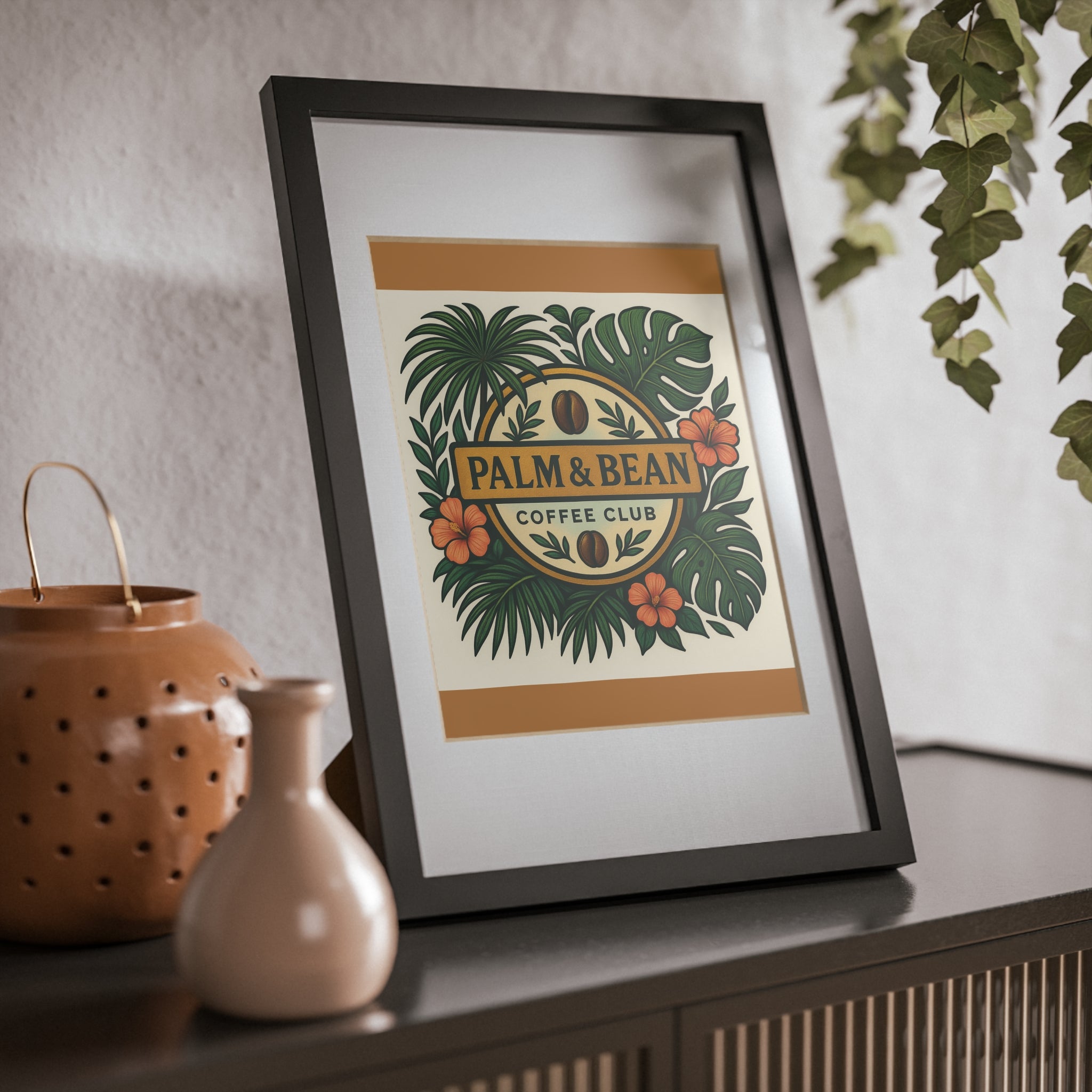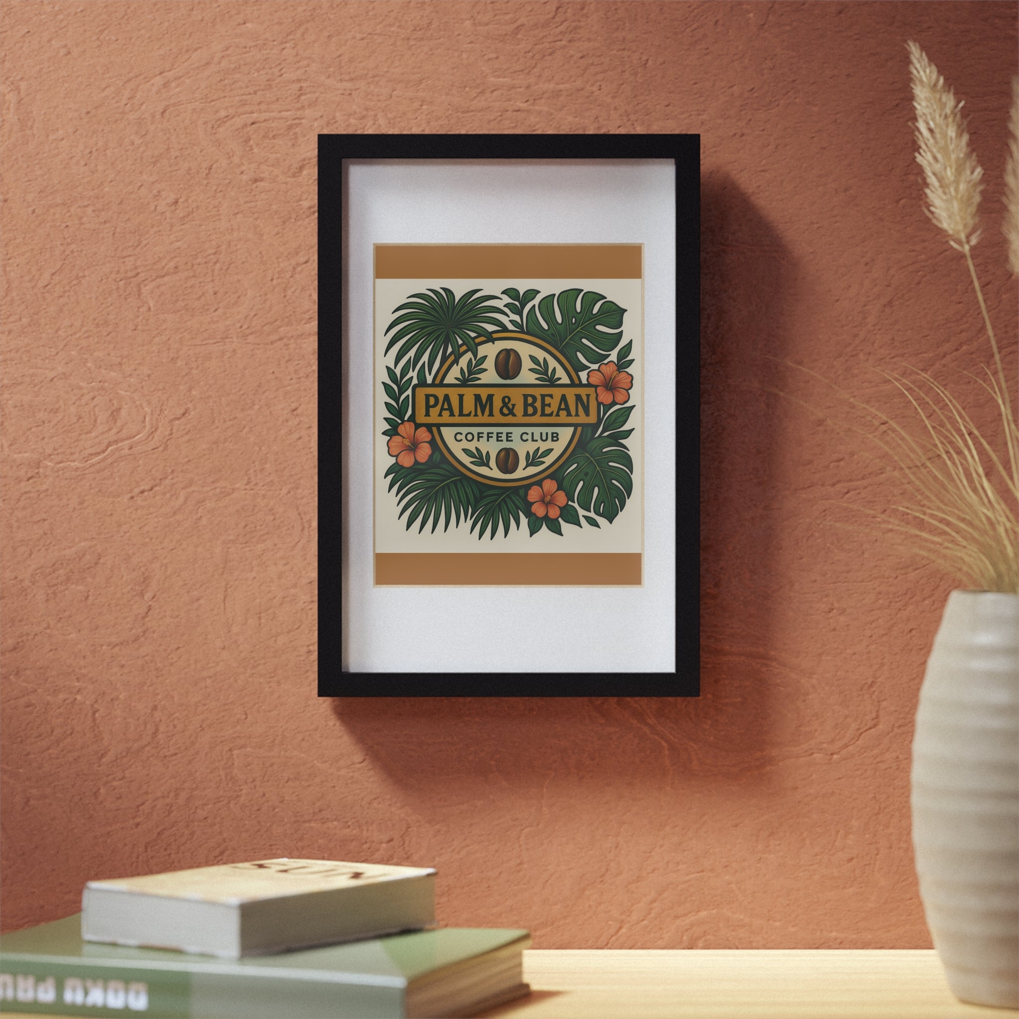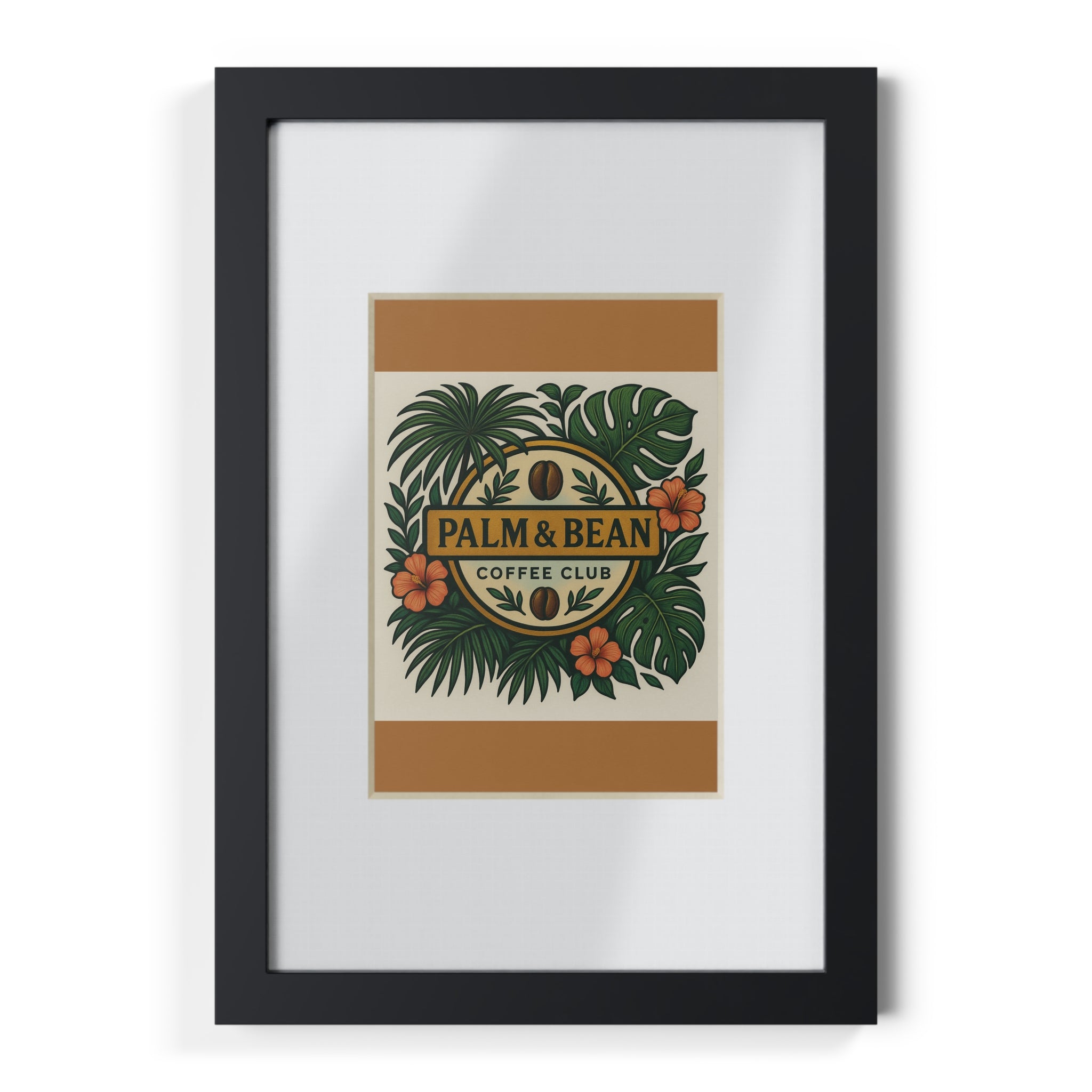 Bring bright, joyful art into any room with a sleek black framed poster celebrating our cool Palm & Bean Coffee Club logo, dark gold background. The print sits on crisp 200gsm paper inside a white matboard and a slim black MDF frame, covered with a clear Perspex insert for a clean, gallery-ready look. Easy to display — hang it with the included loops or prop it on a shelf with the built-in stand. The rich, vibrant colors stay true thanks to modern printing techniques, making every detail pop whether it’s a playful illustration or a calming landscape. Choose sizes to suit a nook, hallway, or focal wall.