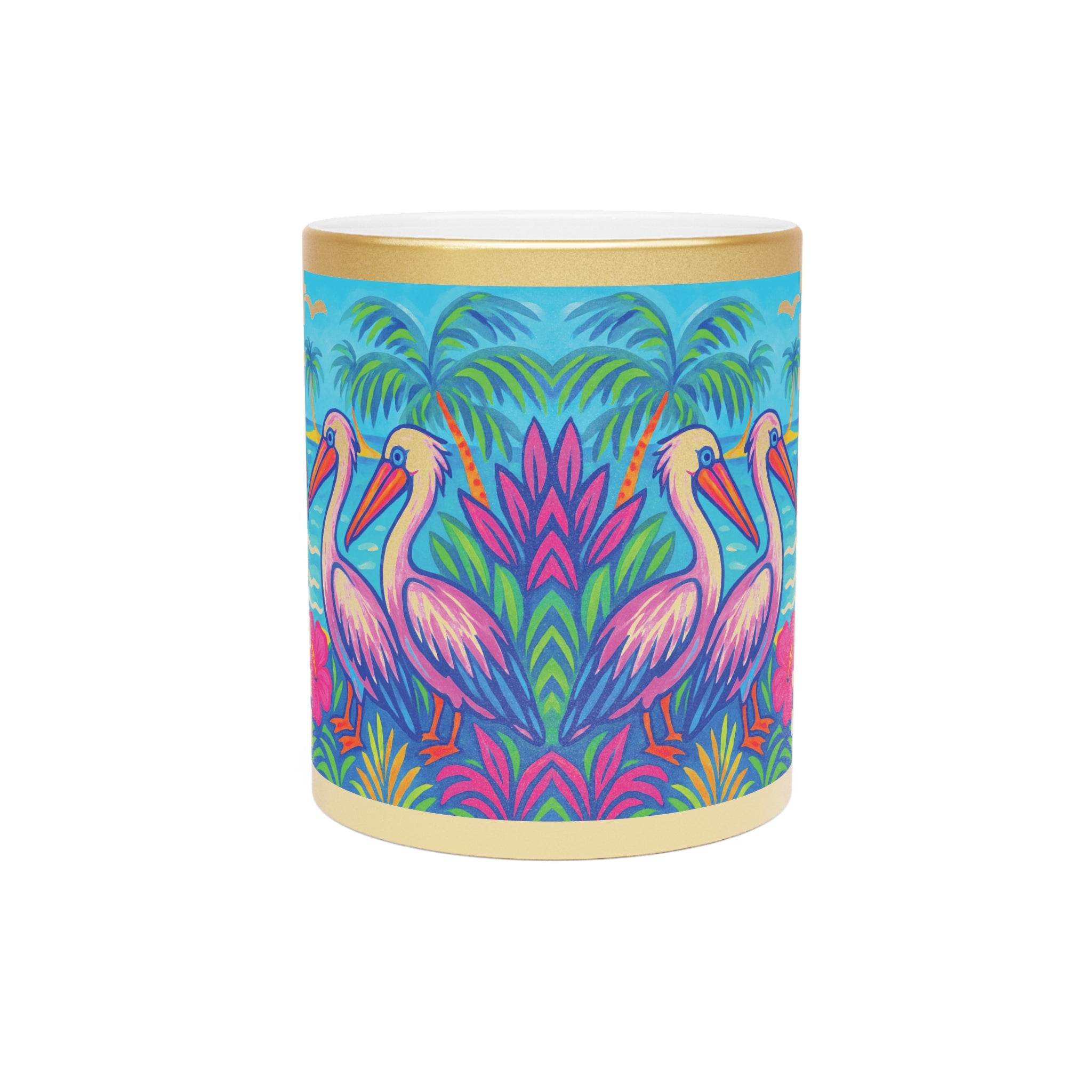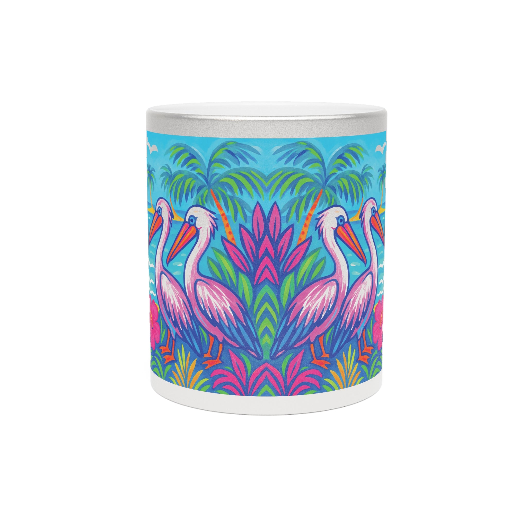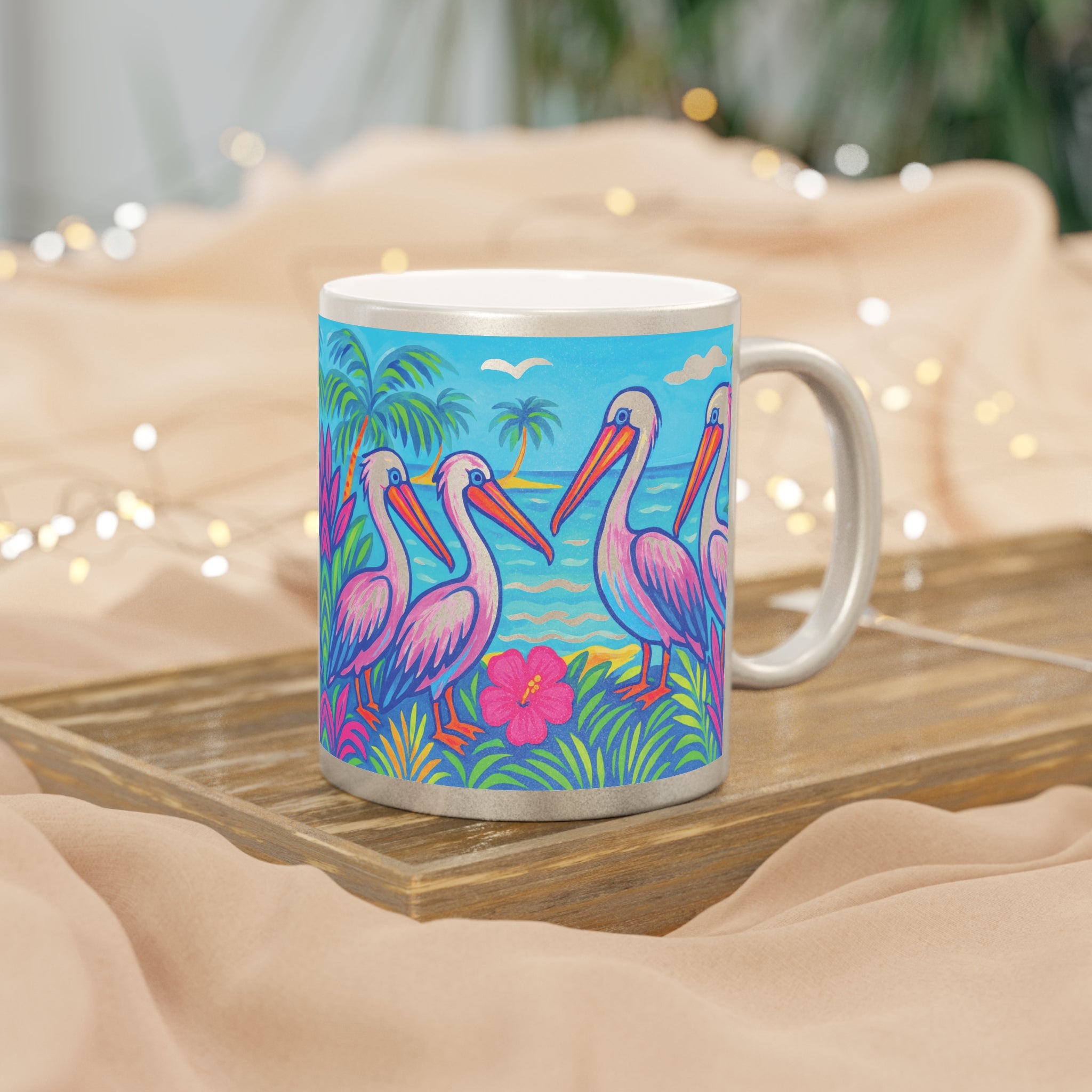Introducing a stunning tropical Metallic Mug that brings a touch of joy to your morning routine fun-loving pelican friends on a tropical beach! This ceramic mug, available in shimmering Gold or Silver metallic finishes, radiates a unique charm that enhances your favorite hot beverages. Whether you’re savoring coffee, tea, or a cozy hot chocolate, this mug is designed to elevate your sipping experience.