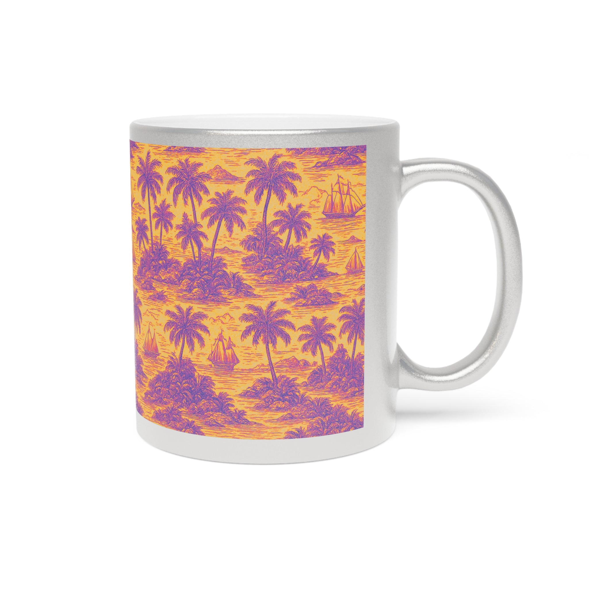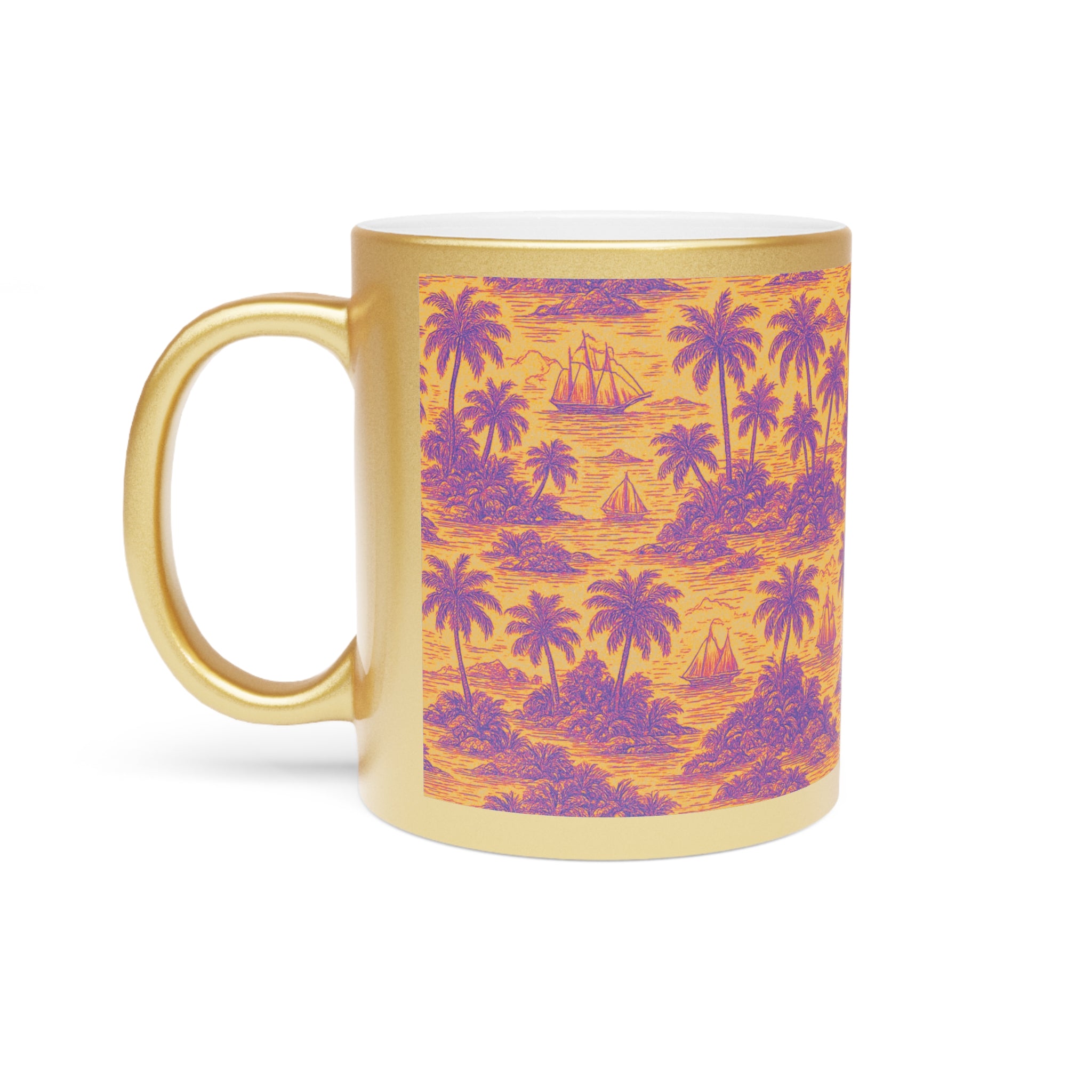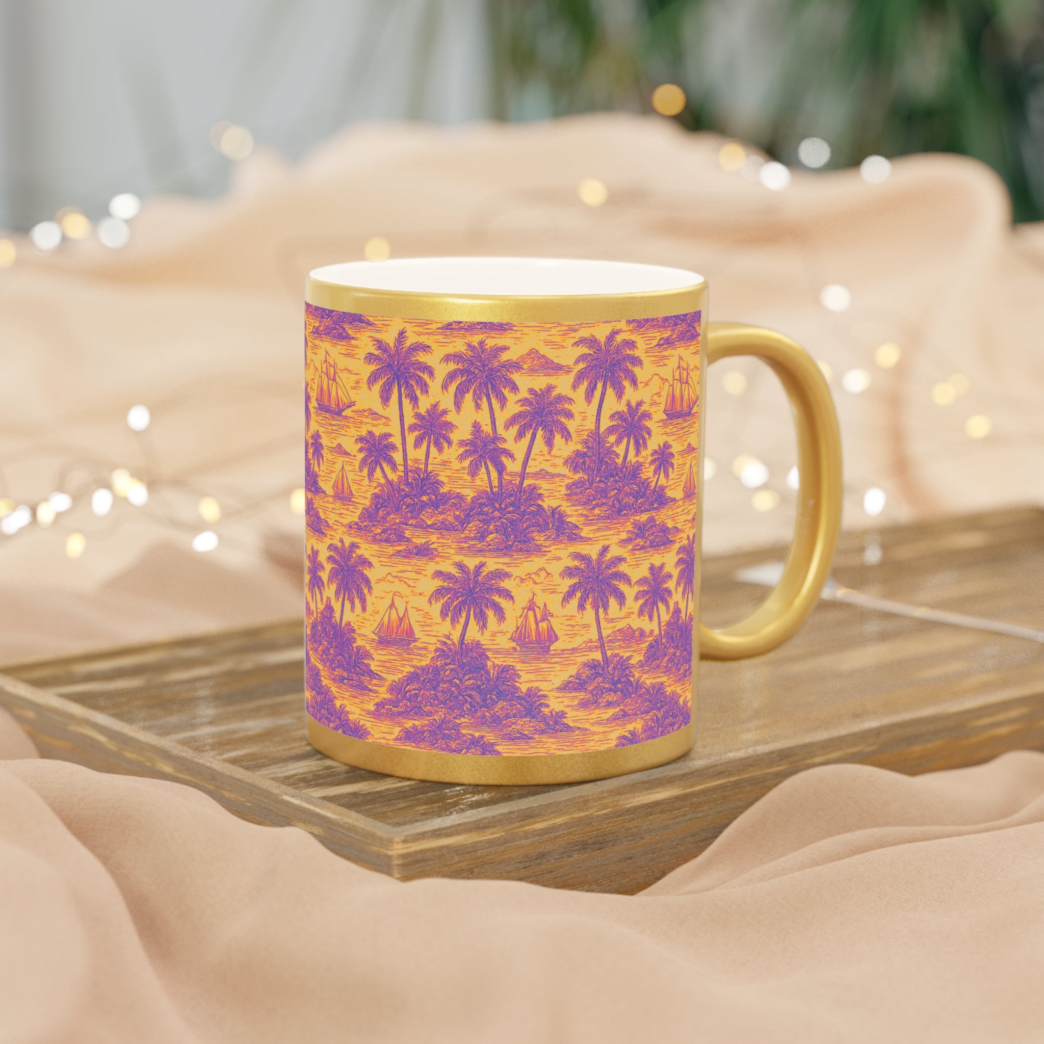 Introducing a stunning tropical Metallic Mug with striking palm tree and coastal toile design in purple/orange that brings a touch of elegance to your morning routine. This ceramic mug, available in shimmering Gold or Silver metallic finishes, radiates a unique charm that enhances your favorite hot beverages. Whether you’re savoring coffee, tea, or a cozy hot chocolate, this mug is designed to elevate your sipping experience.