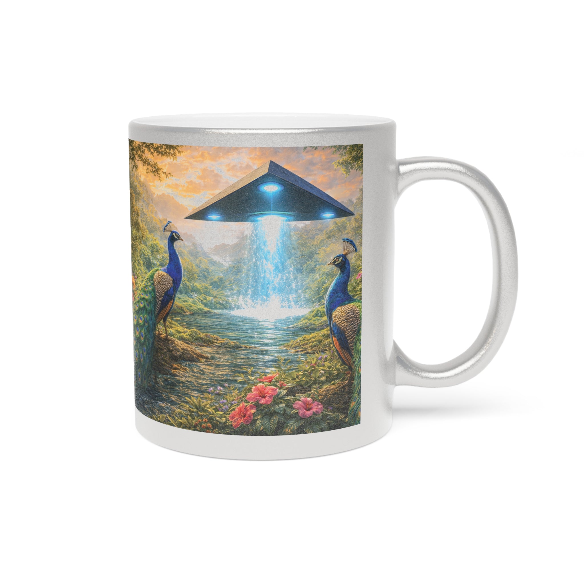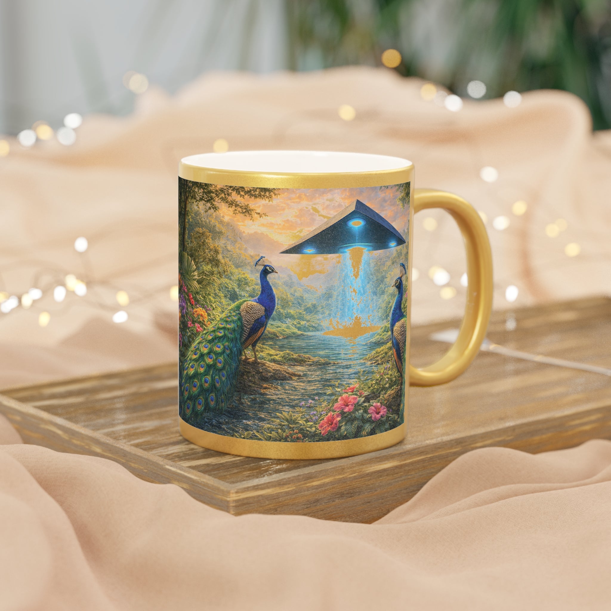 Introducing a stunning tropical Metallic Mug with UFO and peacocks that brings a touch of elegance to your morning routine. This ceramic mug, available in shimmering Gold or Silver metallic finishes, radiates a unique charm that enhances your favorite hot beverages. Whether you’re savoring coffee, tea, or a cozy hot chocolate, this mug is designed to elevate your sipping experience.