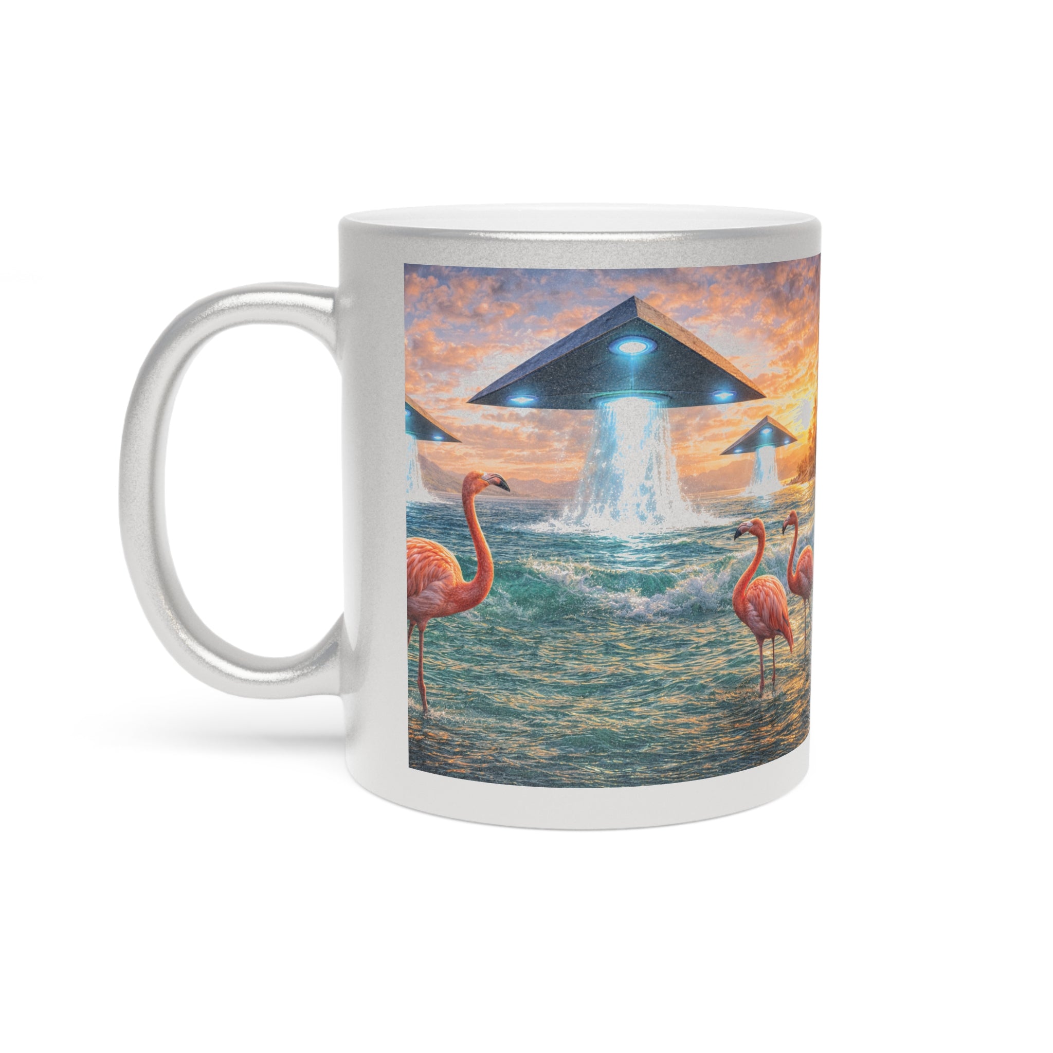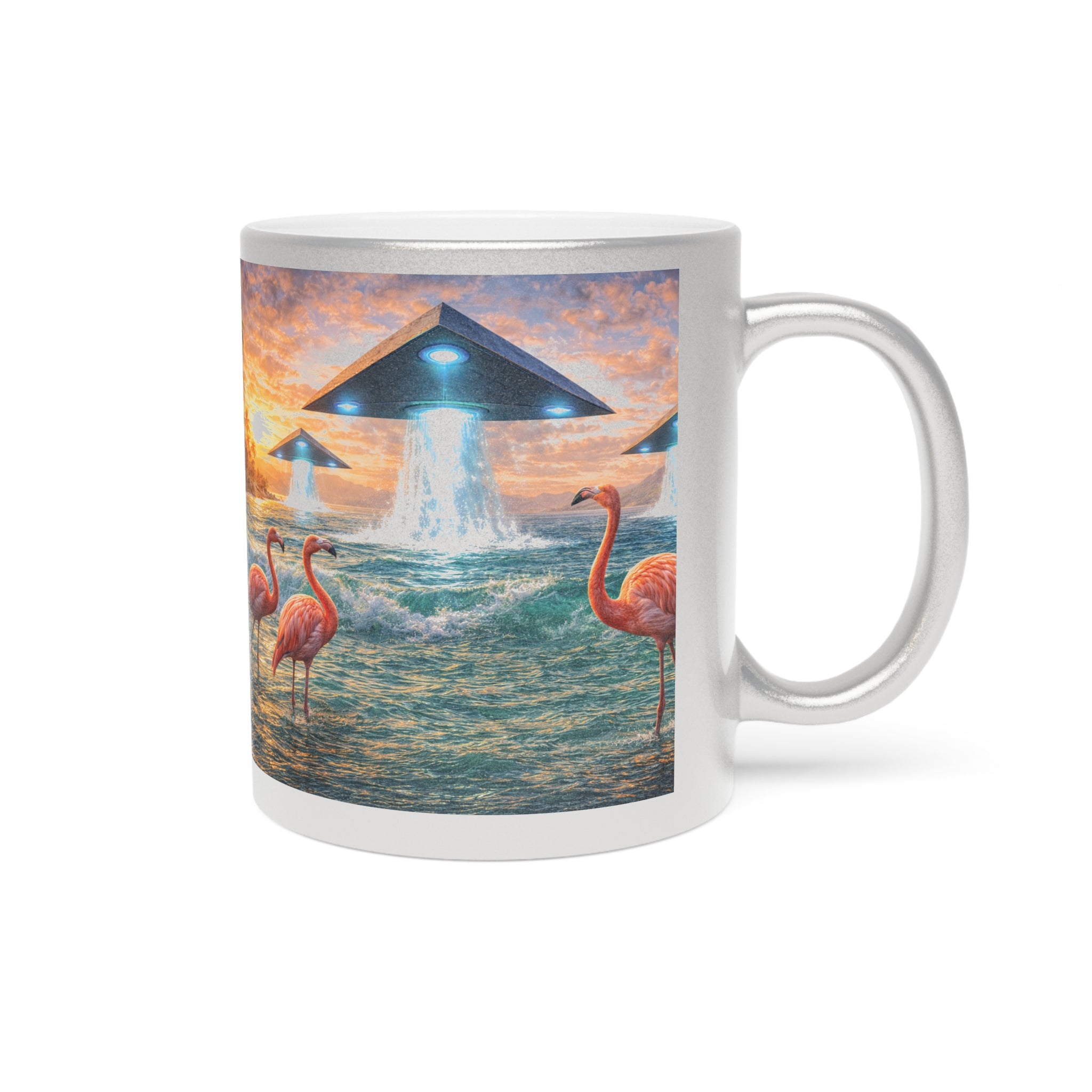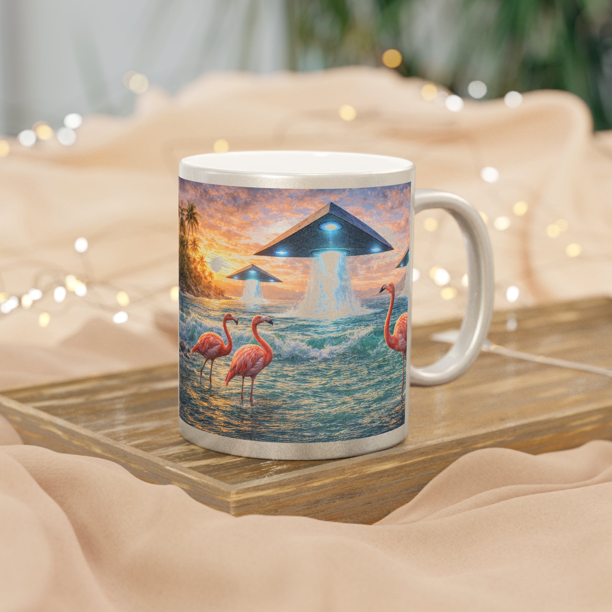 Introducing a stunning tropical Metallic Mug with UFOs scouting out a flock of flamingos; it brings a touch of mystery and elegance to your morning routine. This ceramic mug, available in shimmering Gold or Silver metallic finishes, radiates a unique charm that enhances your favorite hot beverages. Whether you’re savoring coffee, tea, or a cozy hot chocolate, this mug is designed to elevate your sipping experience.