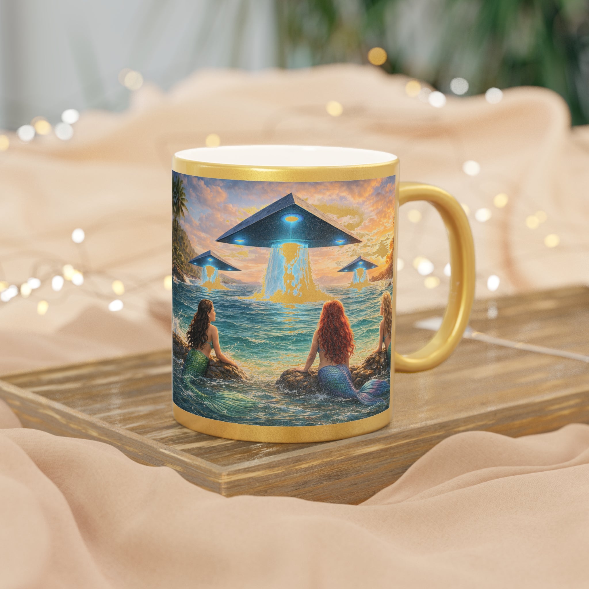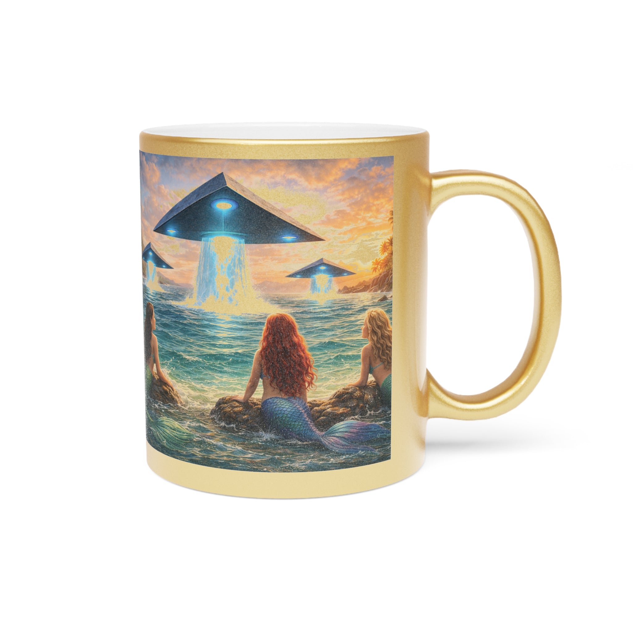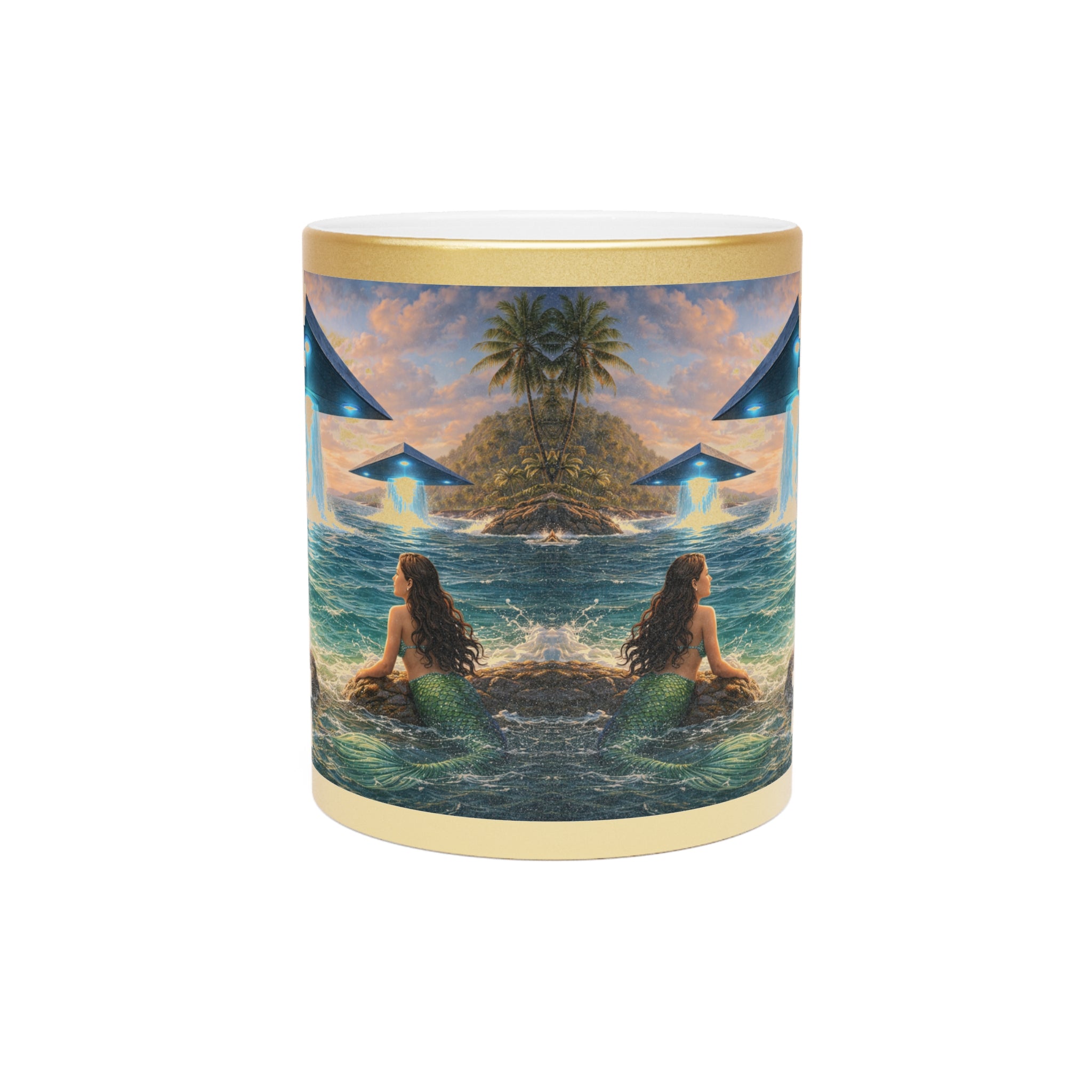 Introducing a stunning tropical Metallic Mug with UFOs and mermaids that brings a touch of elegance to your morning routine. This ceramic mug, available in shimmering Gold or Silver metallic finishes, radiates a unique charm that enhances your favorite hot beverages. Whether you’re savoring coffee, tea, or a cozy hot chocolate, this mug is designed to elevate your sipping experience.