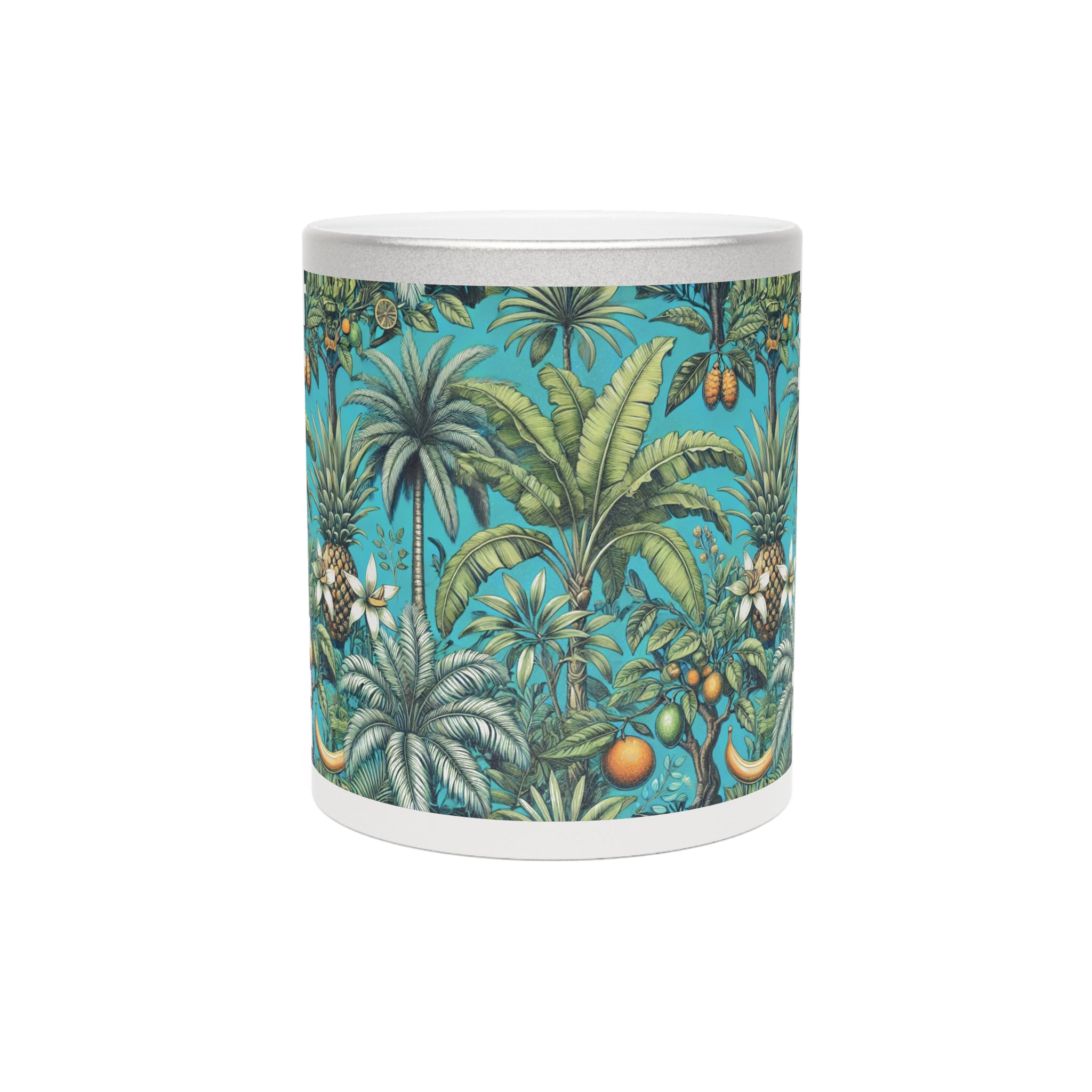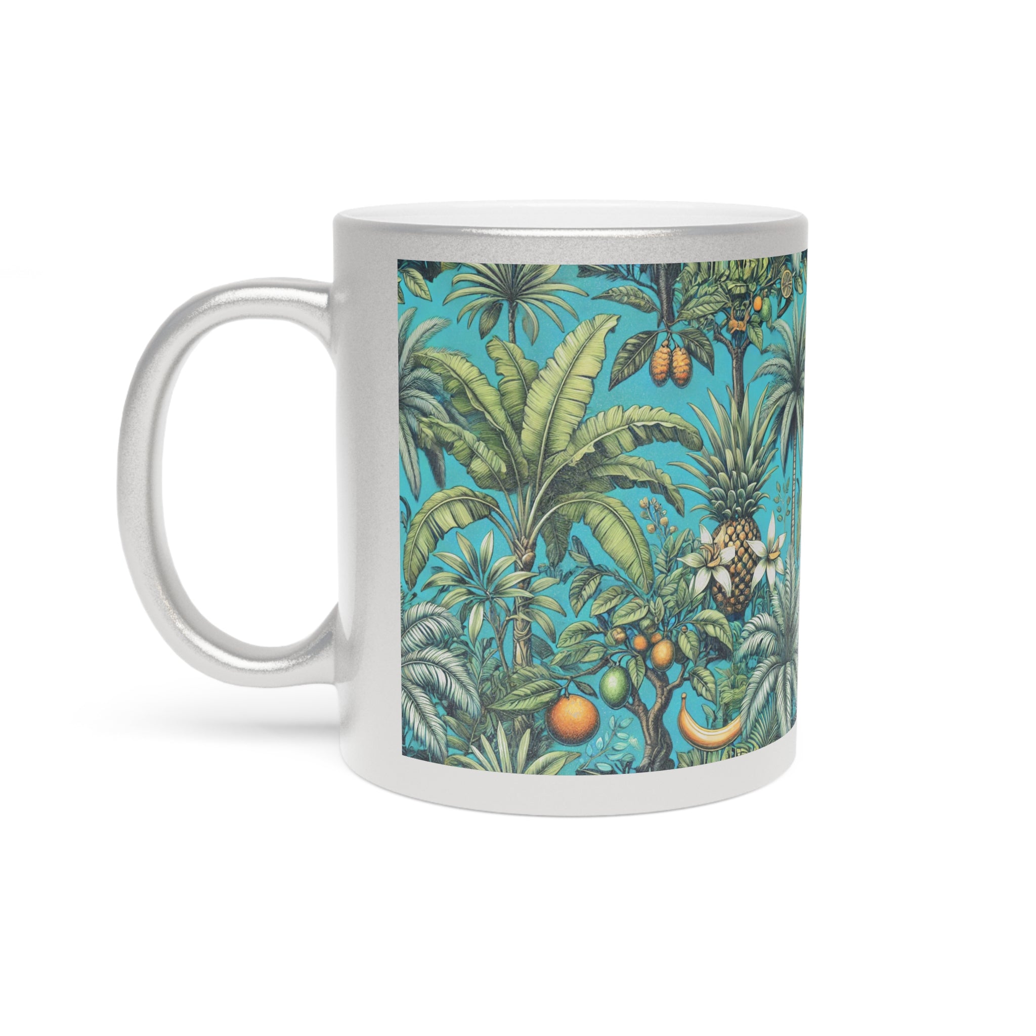 Introducing a stunning tropical Metallic Mug with our palms and fruit design, turqoise, that brings a touch of elegance to your morning routine. This ceramic mug, available in shimmering Gold or Silver metallic finishes, radiates a unique charm that enhances your favorite hot beverages. Whether you’re savoring coffee, tea, or a cozy hot chocolate, this mug is designed to elevate your sipping experience.
