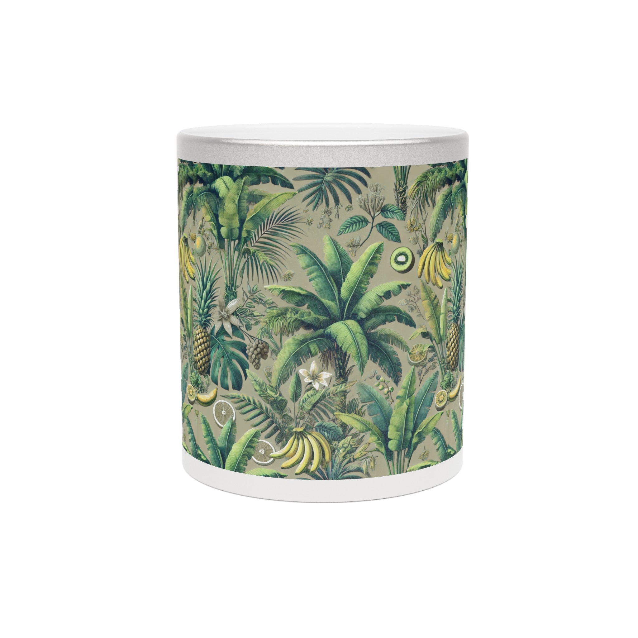 Introducing a stunning tropical Metallic Mug with our palms and fruit design, taupe green, that brings a touch of elegance to your morning routine. This ceramic mug, available in shimmering Gold or Silver metallic finishes, radiates a unique charm that enhances your favorite hot beverages. Whether you’re savoring coffee, tea, or a cozy hot chocolate, this mug is designed to elevate your sipping experience.
