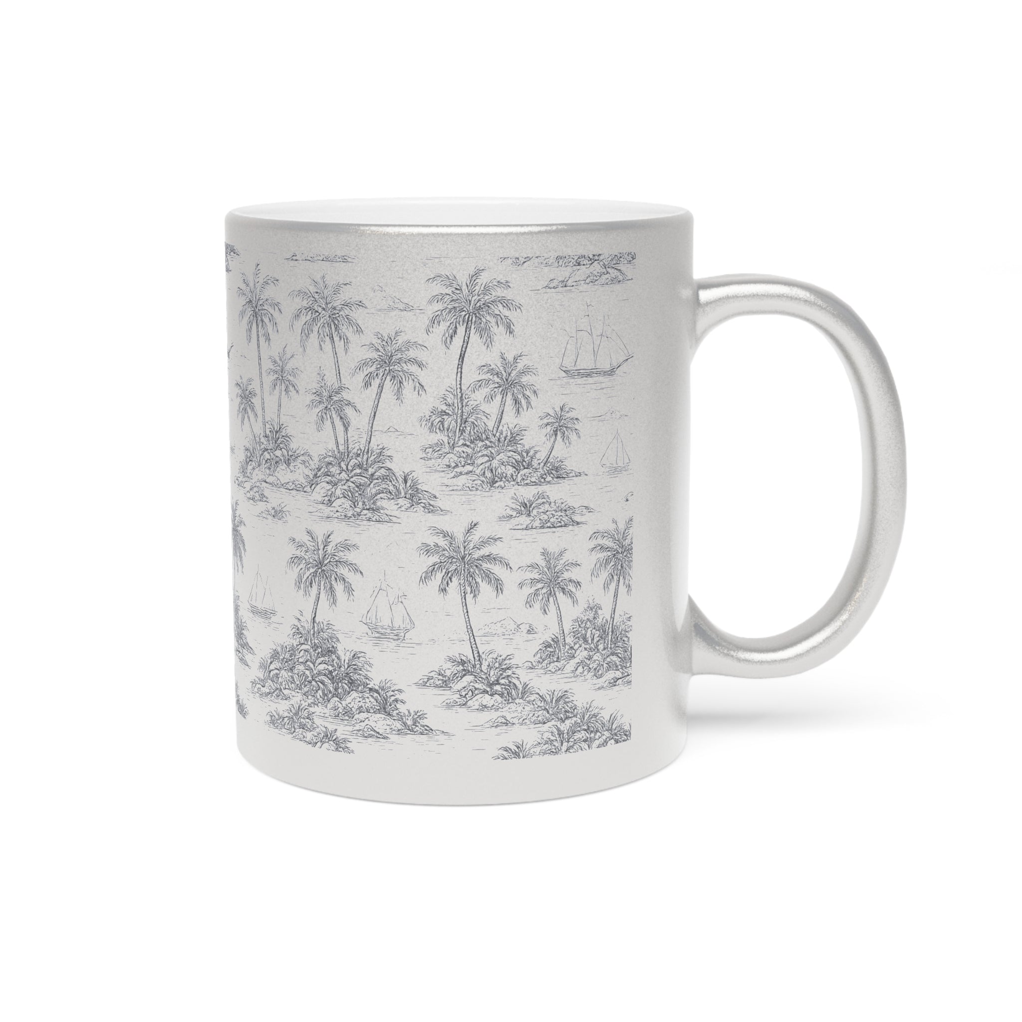 Introducing a stunning tropical Metallic Mug with striking palm tree and coastal toile design, grey, that brings a touch of elegance to your morning routine. This ceramic mug, available in shimmering Gold or Silver metallic finishes, radiates a unique charm that enhances your favorite hot beverages. Whether you’re savoring coffee, tea, or a cozy hot chocolate, this mug is designed to elevate your sipping experience.