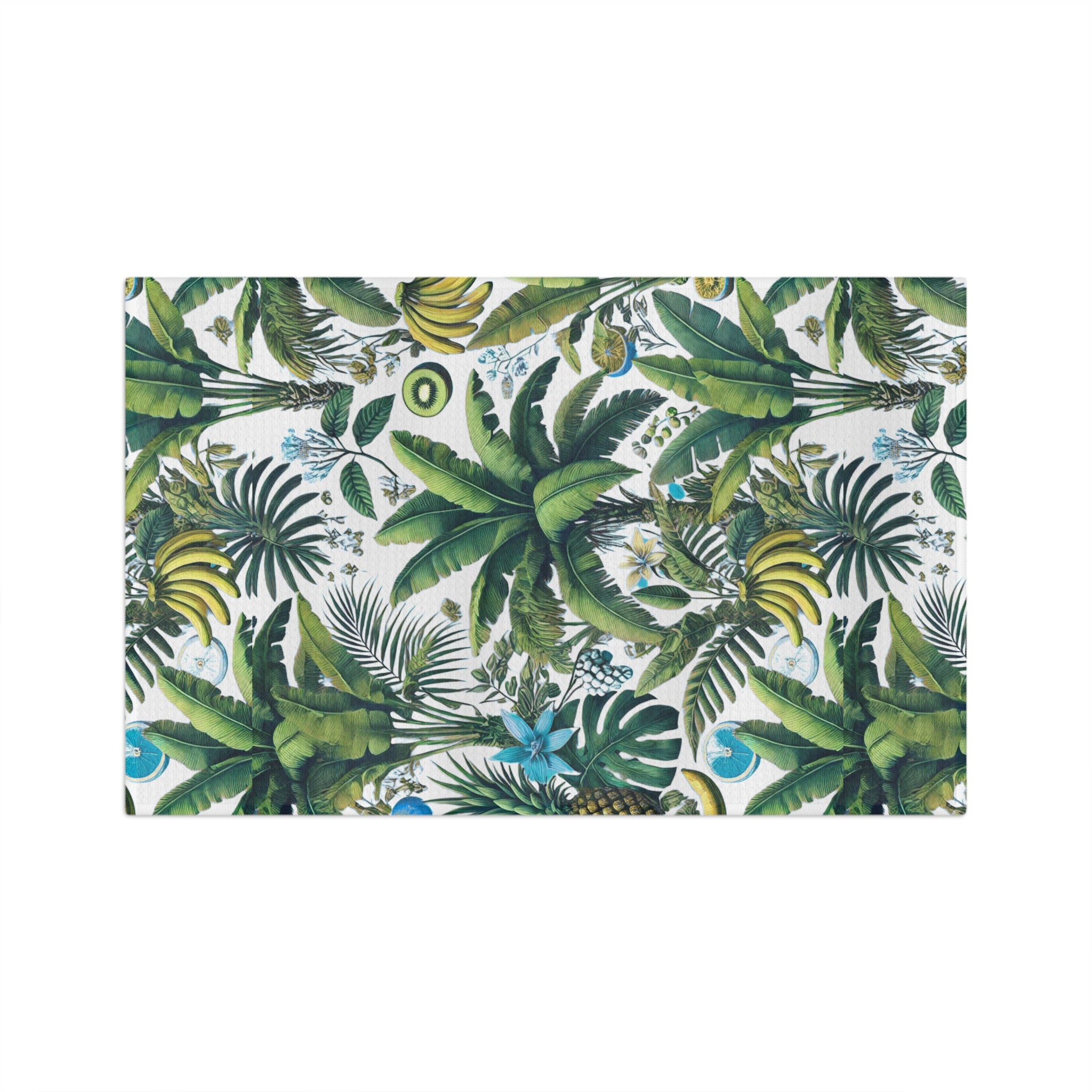 Bring a slice of tropical calm to daily kitchen moments. This microfiber tea towel is printed with a lush botanical pattern — palm fronds, banana clusters, and bright green foliage — that reads like a small, sun-dappled jungle. It feels feather-light, so it slips easily over an oven handle or hangs from a peg, and the quick-dry microfiber means damp dishes and hands are handled without lingering moisture. The hemmed edges and sewn care label keep it looking neat wash after wash. Use it to brighten a slow morning, layer into a picnic setup, or tuck into a hostess basket for someone who loves verdant, island-inspired style.