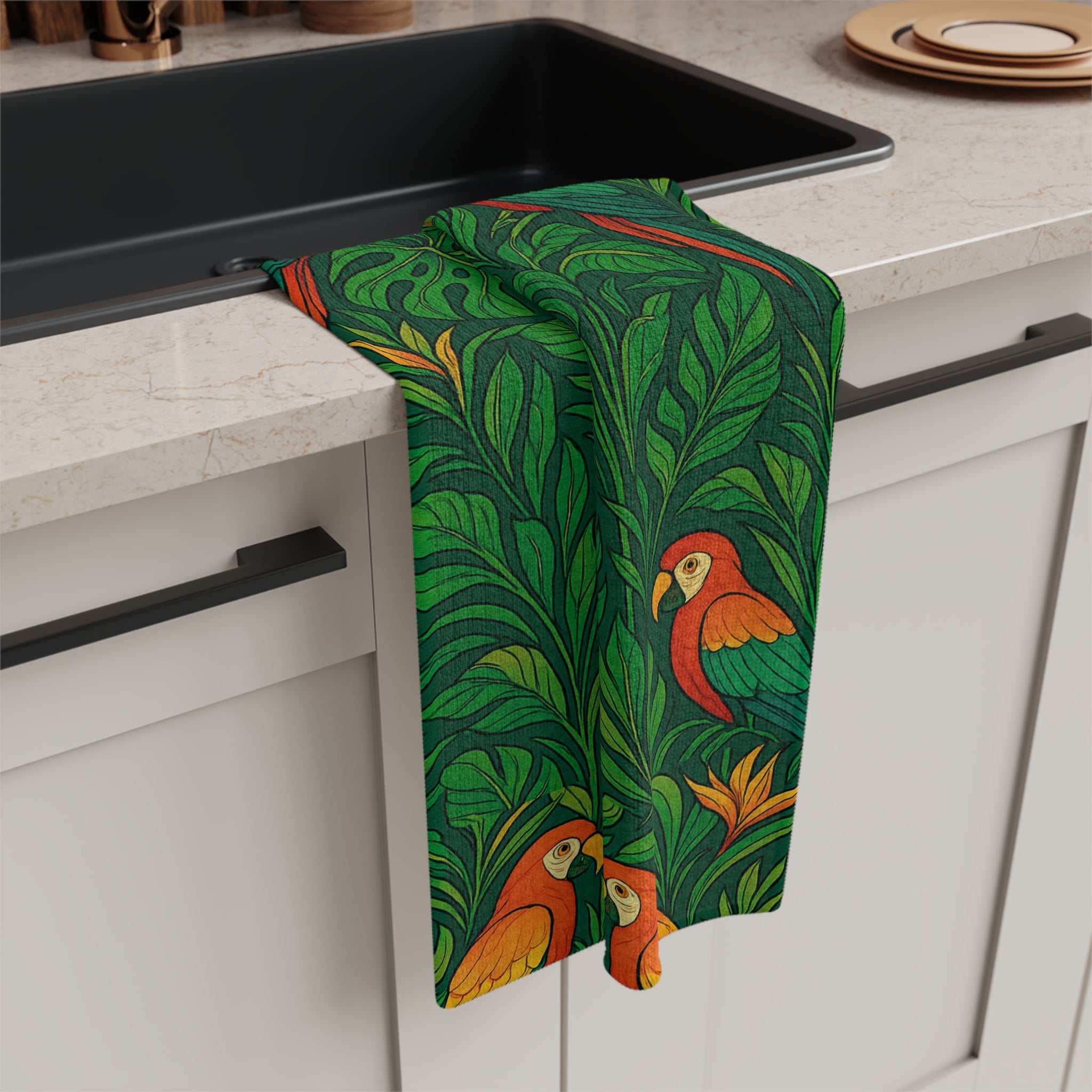 Bright, leafy, and alive — this microfiber tea towel brings a tropical canopy into everyday moments. Lush green foliage creates a deep, textured backdrop for small, sunlit parrots in warm oranges and yellows. Soft microfiber catches drips and dries fast, while the vibrant one-sided print keeps the pattern bold and clear. Toss it over a rack, line a basket, or use it to gently dry glassware; it adds a playful, botanically rich accent to kitchens that love color and nature.
