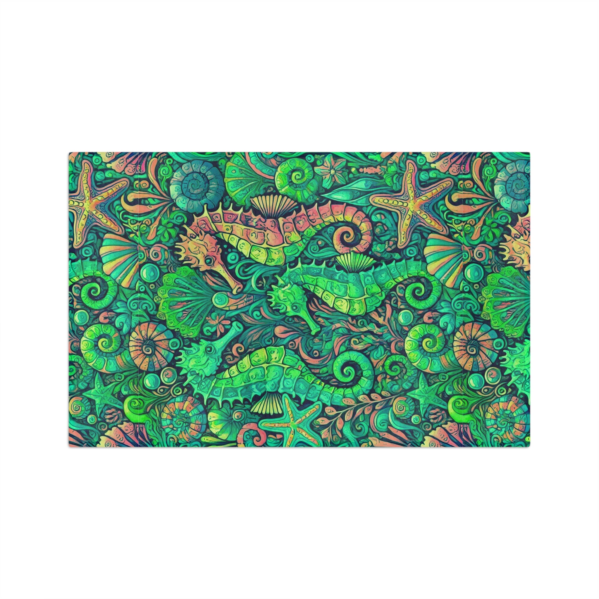 Bright, ocean-kissed microfiber tea towel featuring a lively seahorse and seashell pattern. The dense, split fibers soak up moisture fast and dry quickly, making cleanup feel effortless after beach picnics, summer cookouts, or days spent rinsing sandy shells. Hemmed edges and a sewn-in care label keep the towel looking crisp wash after wash. The one-sided print showcases intricate, hand-drawn coral, starfish, and seahorse shapes in vibrant greens and teals that bring a playful, coastal energy to kitchen counters, camper galley sinks, or a seaside cottage shelf. It’s lightweight and compact, easy to toss in a tote for tidepool hunting or to keep on hand when friends drop by for an impromptu seafood boil.