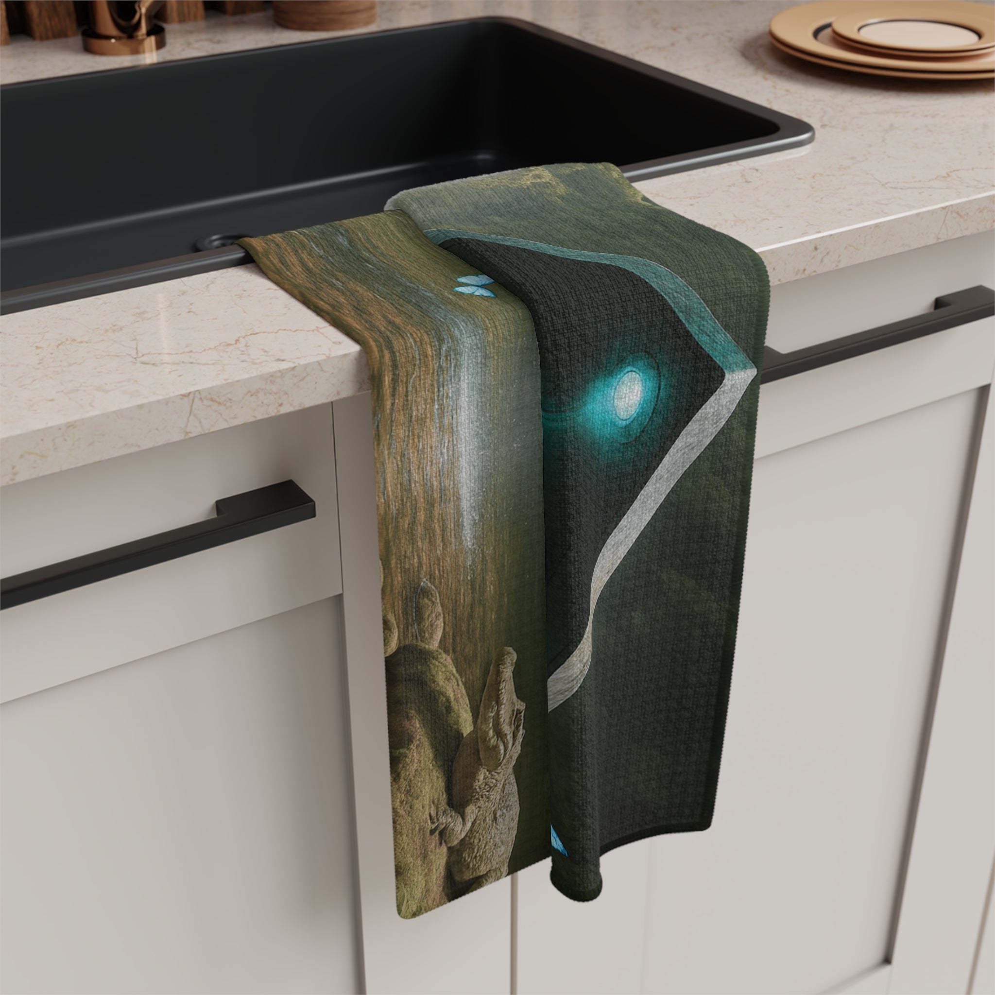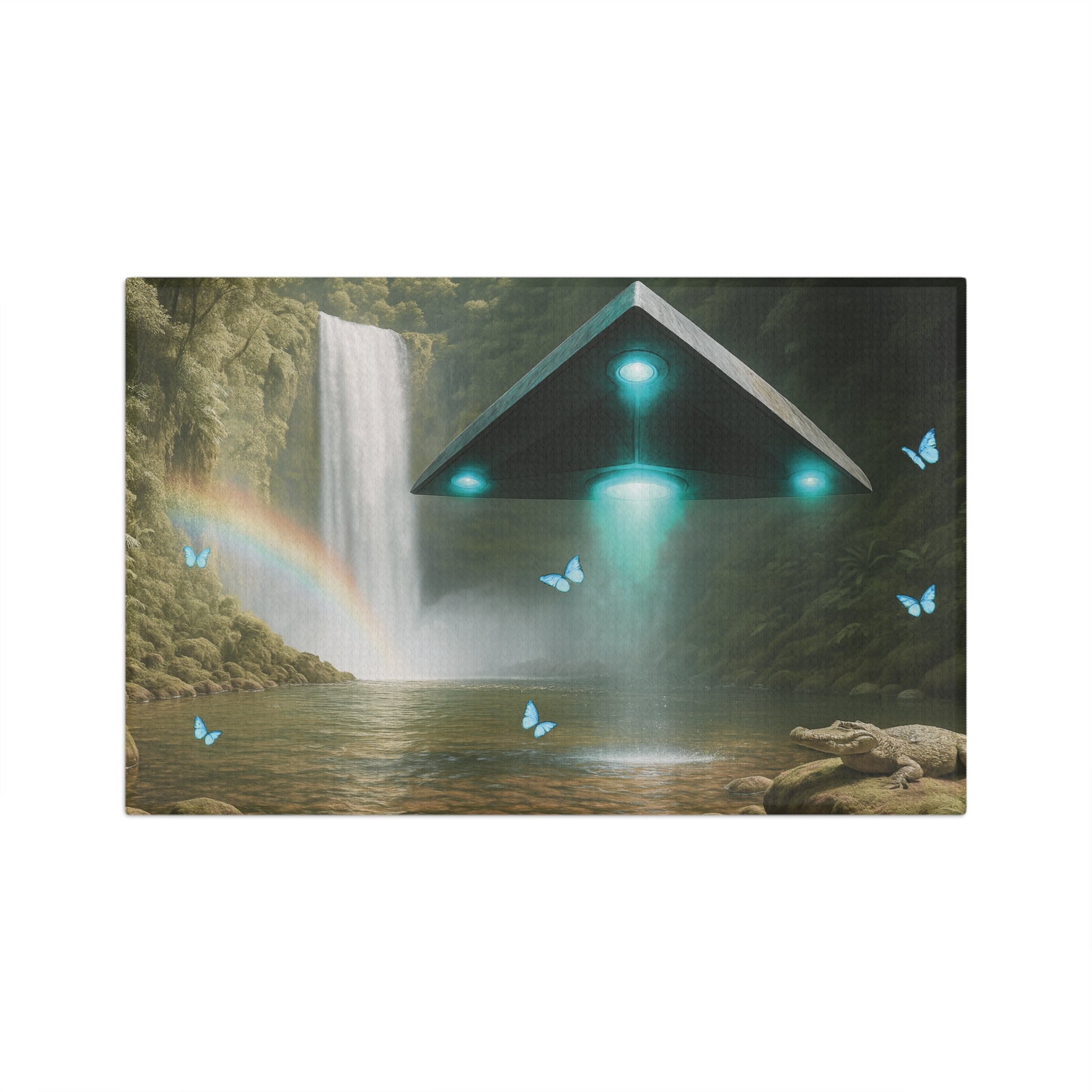 Soft, fast-drying microfiber woven with a surreal scene: a hovering triangular UFO craft illuminated by cool teal lights above a misty waterfall and gentle rainbow. Tiny blue butterflies flit across the composition, adding a touch of wonder. This towel feels weightless in your hands and dries quickly, making the artwork useful every day — for wiping hands, tending plants, or adding a splash of otherworldly calm to a kitchen or studio. The hemmed edges keep it durable through repeated use and washings, while the single-sided print preserves the vivid, cinematic colors where they matter most.