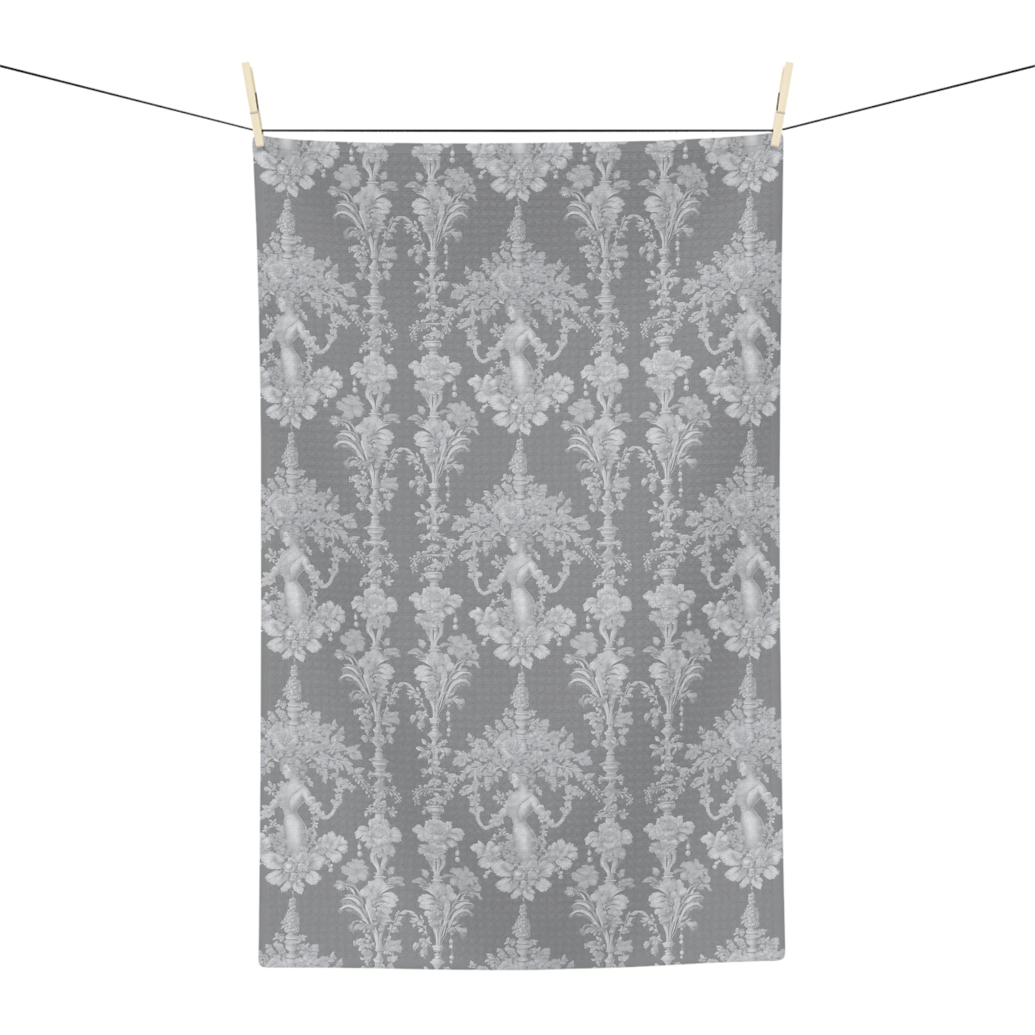 Soft, quick-drying microfiber with a subtle vintage damask print. This tea towel feels light but absorbent, with finely split fibers that pull moisture in fast and dry even faster. The muted gray pattern brings an understated, antique elegance to the kitchen — it layers quietly with everyday dishes or more formal tabletop settings. Gorgeous tropical pattern featuring a lovely lady made of FW pearls surrounded by elegant toile motifs! Hemmed edges and a sewn care label mean it wears well through frequent use and washes. Use it to dry glassware without streaks, line a bread basket, or fold over an oven rack for a touch of quiet refinement during holiday baking.