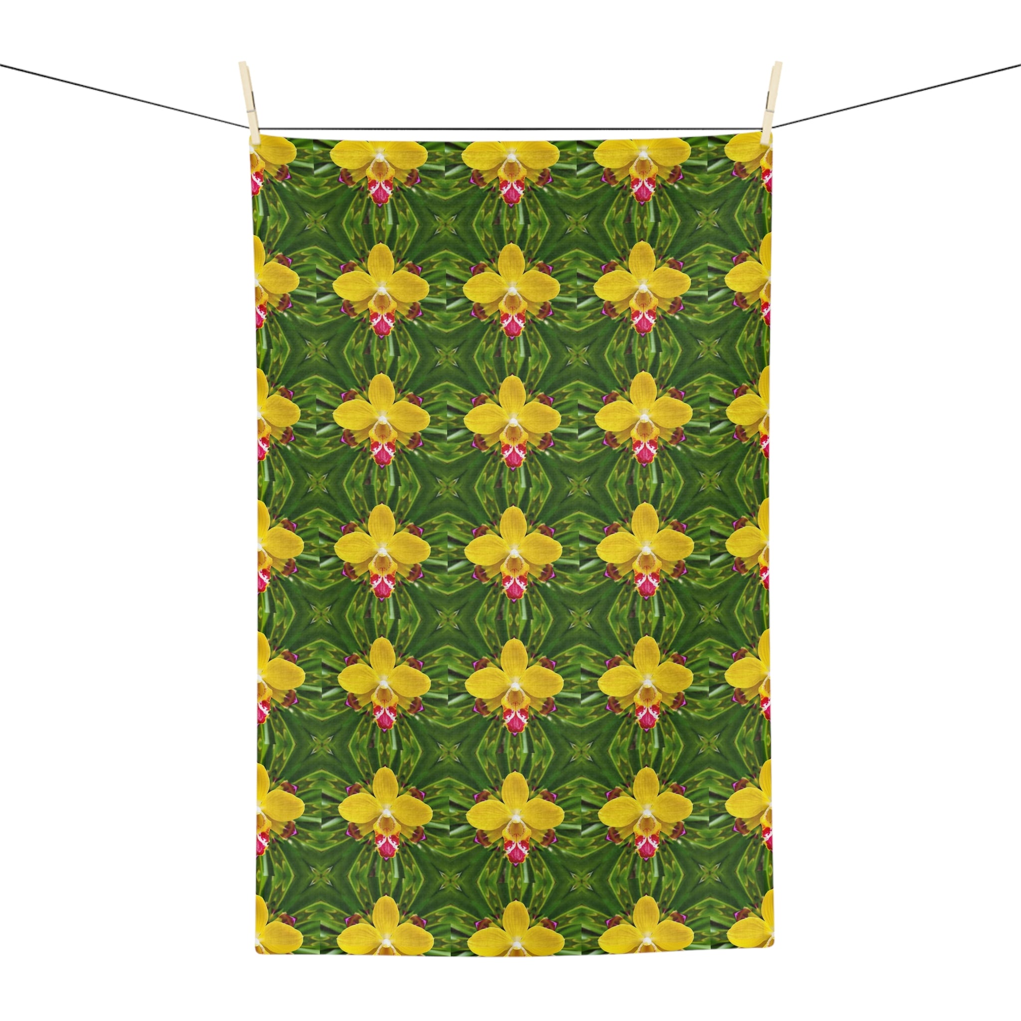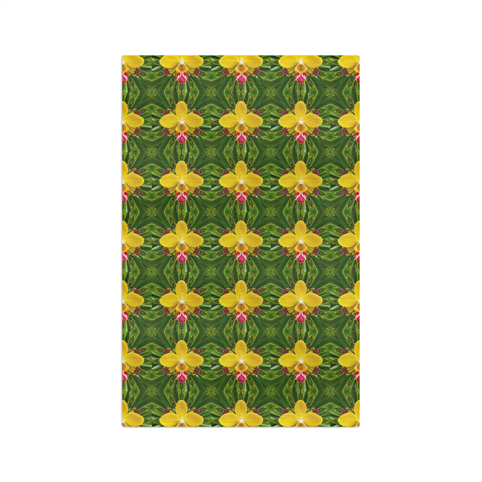 Bright yellow orchids bloom across a lush green field in this fast-drying microfiber tea towel. Lightweight and highly absorbent, the towel’s kaleidoscopic floral repeat brings a touch of botanical charm to dish duty, morning coffee spills, and quick clean-ups. The hemmed edges and sewn-in care label keep it looking crisp after many washes. Fold it over a bar for a splash of color in the kitchen, tuck it into a picnic basket for sunny outdoor meals, or drape it over a counter to lift the room’s mood — it lives where everyday life needs a little floral cheer.